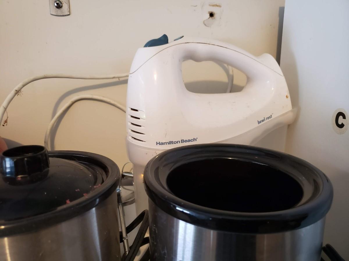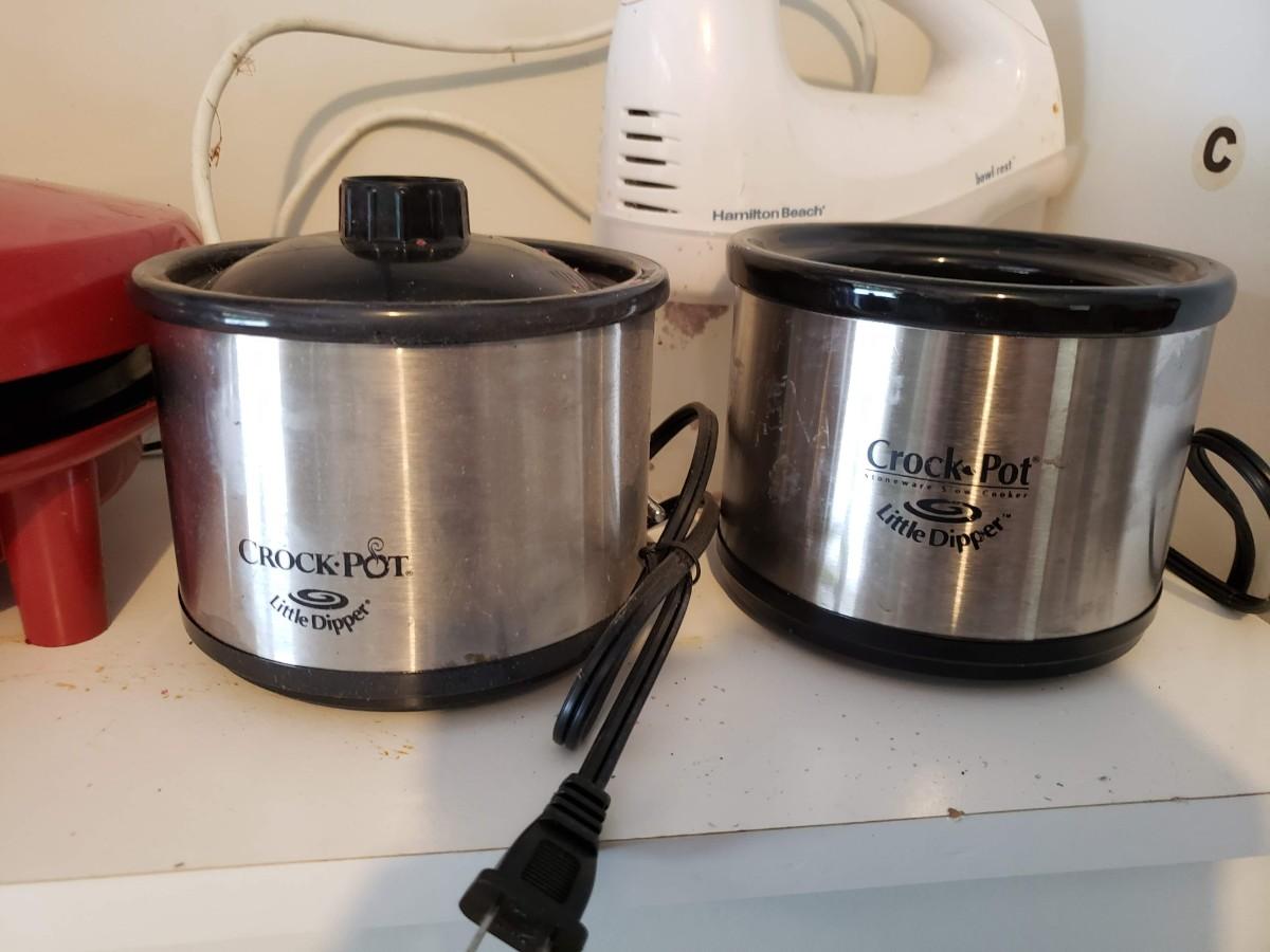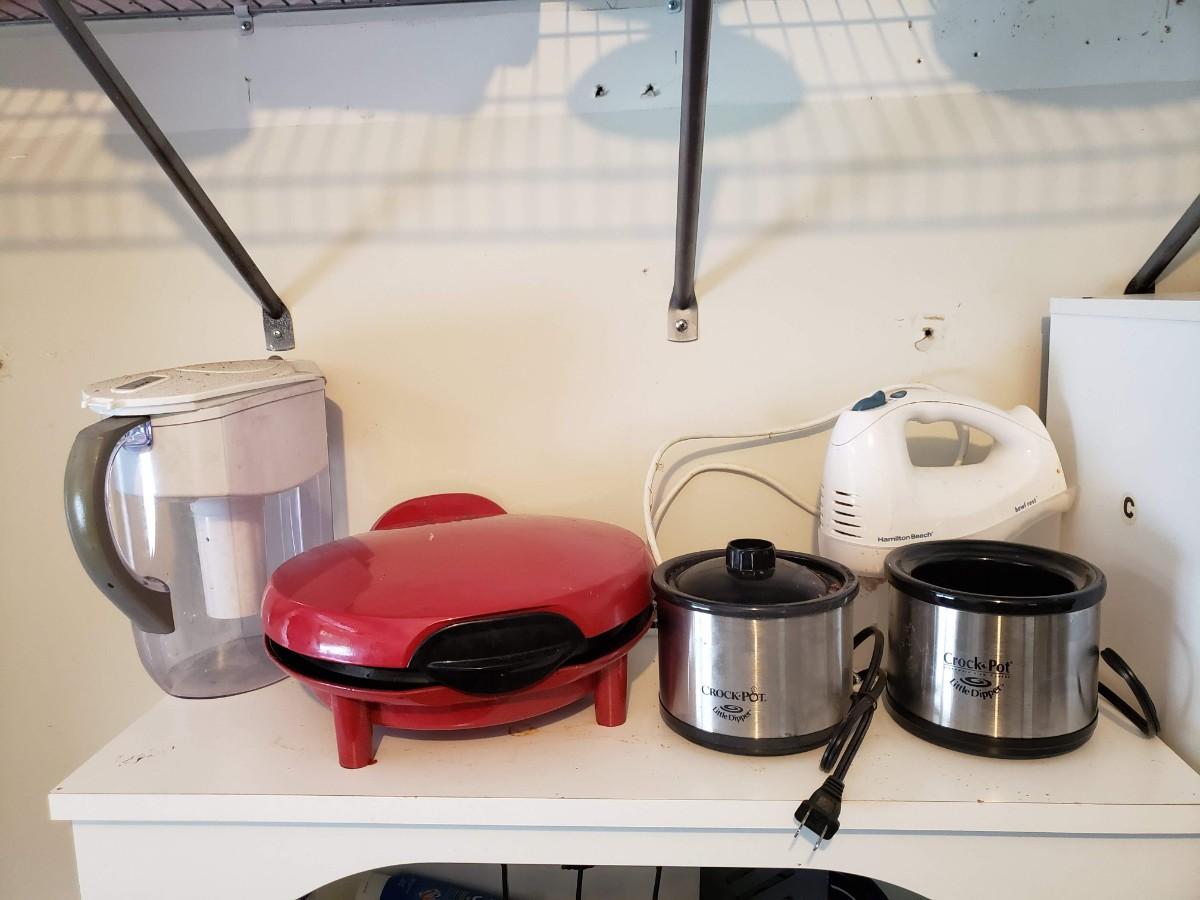 George Foreman grill, 2 small crock pots, hand mixer and Brita pitcher