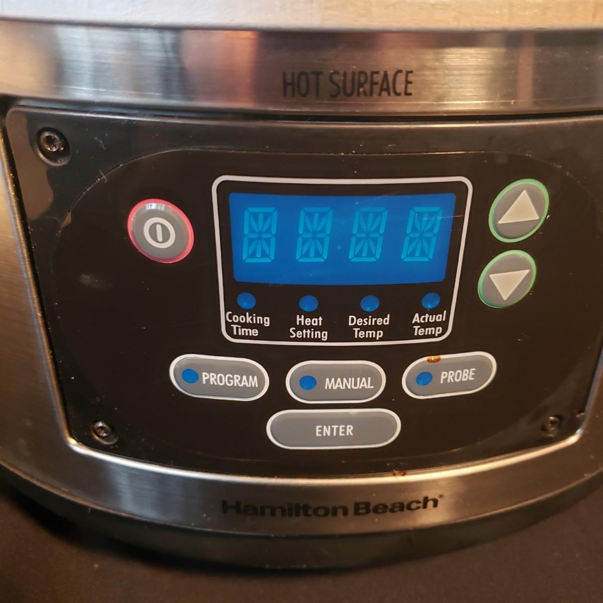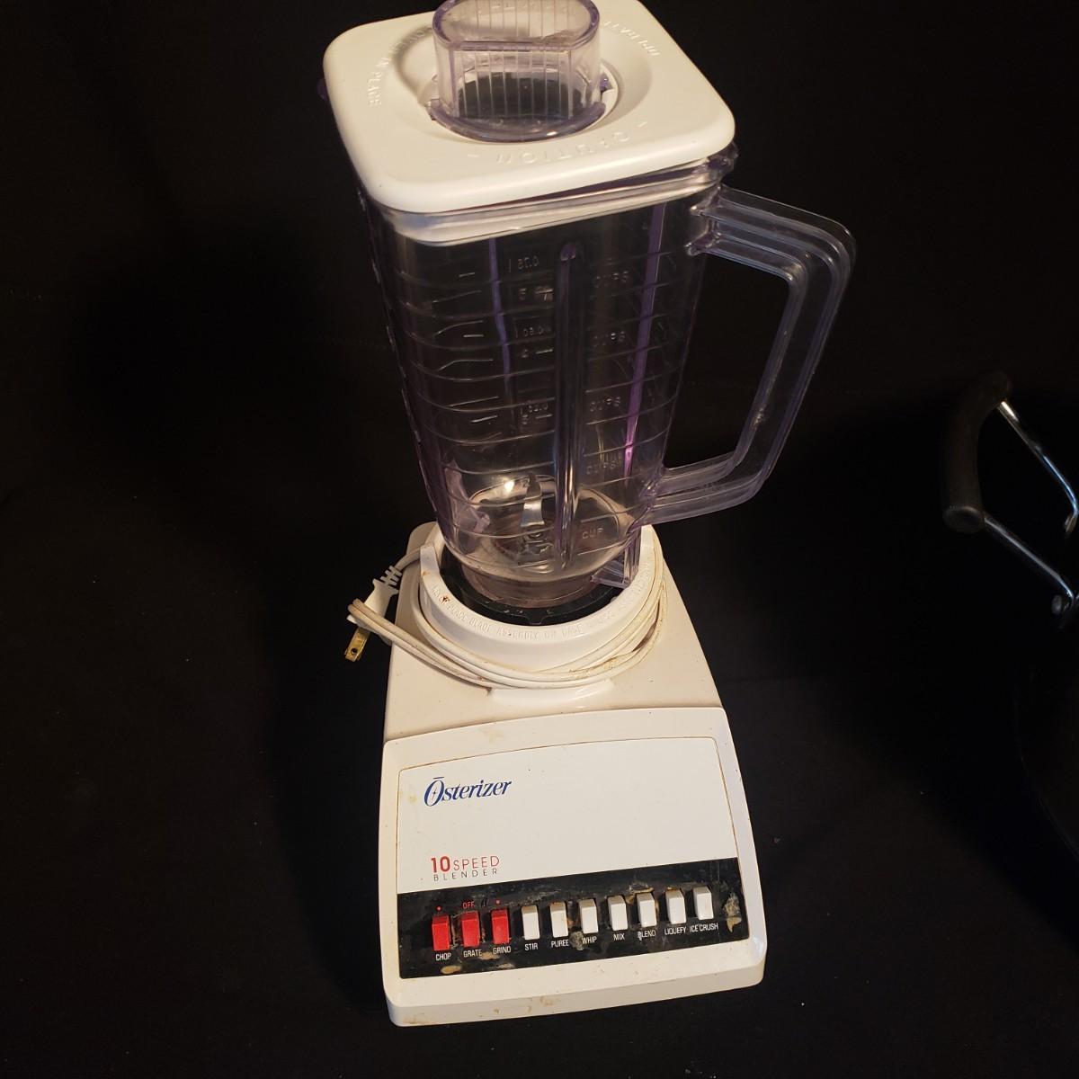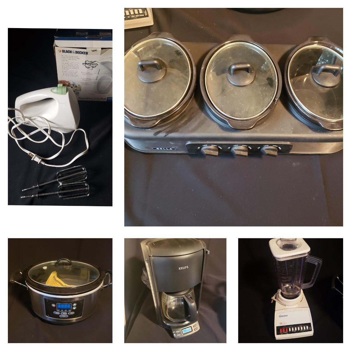 This is a five-piece kitchen appliance lot. The 12 cup Krups coffee maker measures 9" x 9" x 13"H. There is a Hamilton Beach programmable crackpot, a three-crock pot heater by Bella and a plastic blender by Osterizer. The Black and Decker hand mixer comes in the original box. All appliances powered on when tested. Some appliances do not have "on" indicators. Items can use some cleaning.