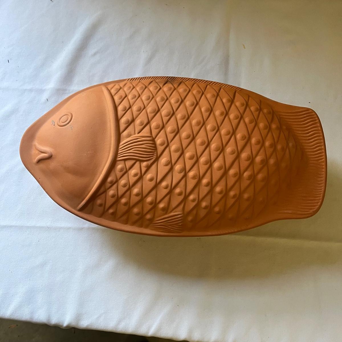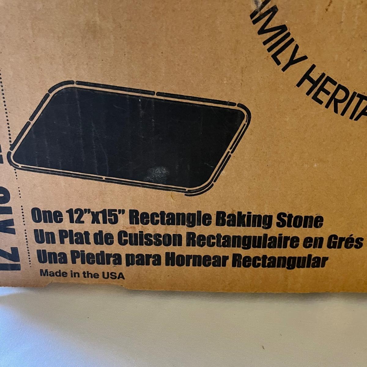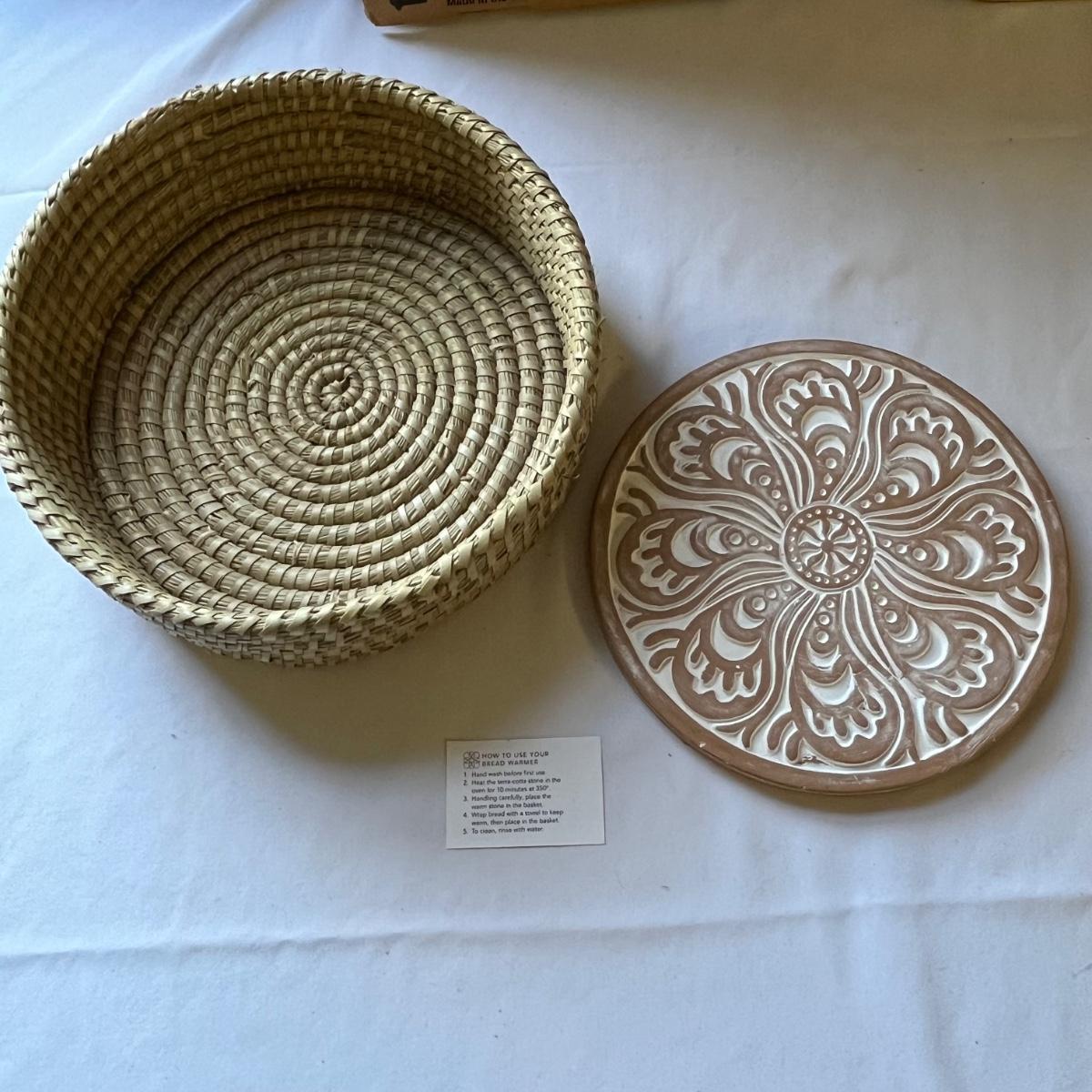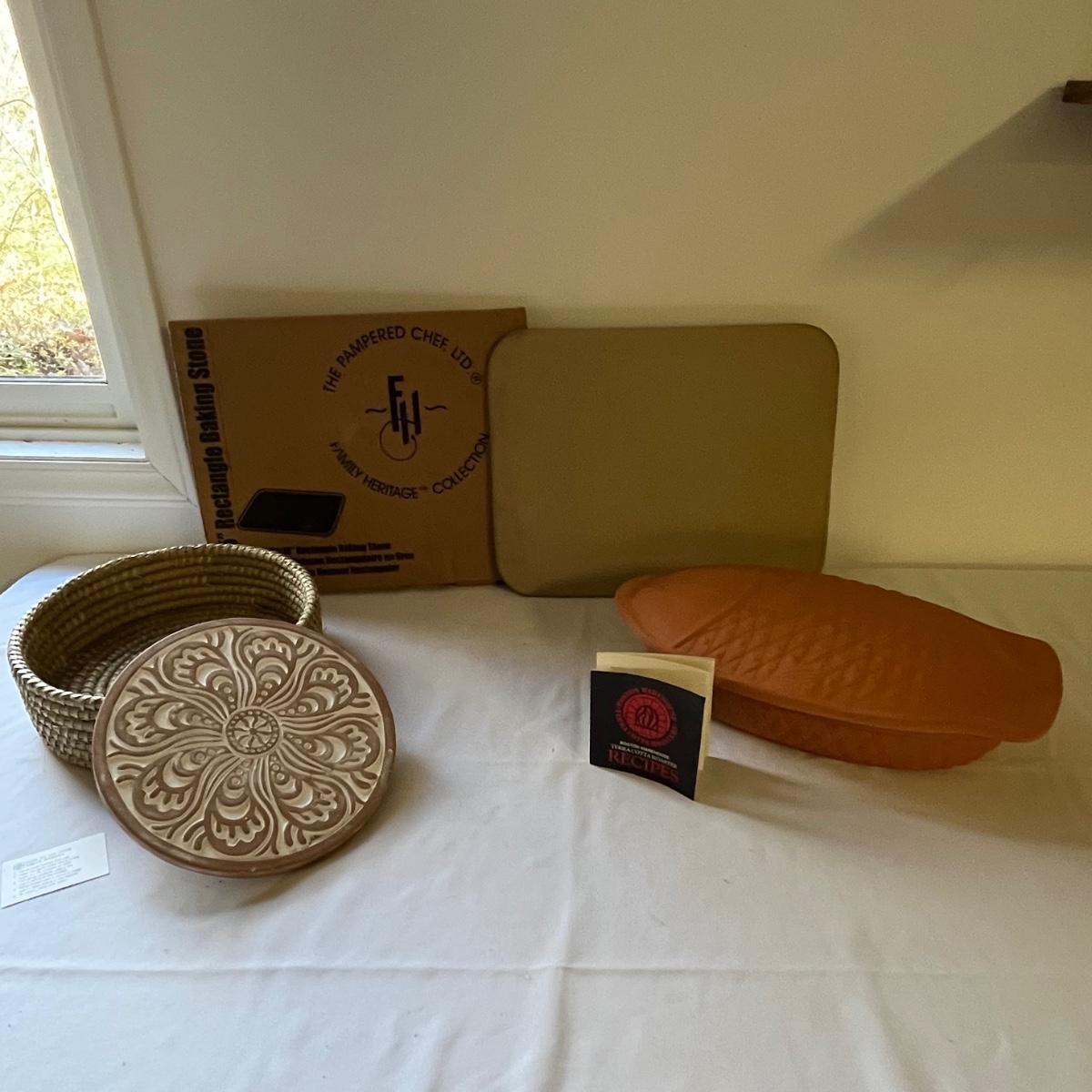 A Boston Warehouse Terrace Cotta Roaster Pan, a SerrV Terra Cotta bread warming stone and basket and a Pampered Chef 12” x 15” baking stone.