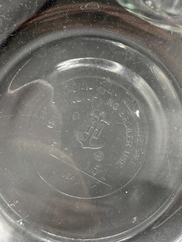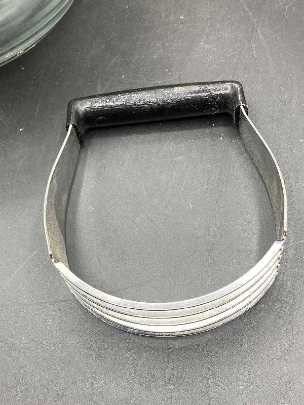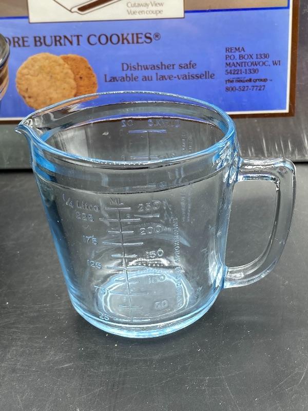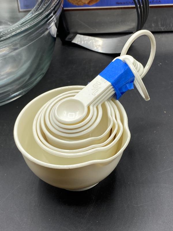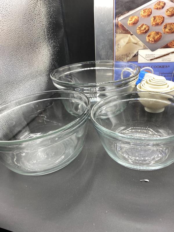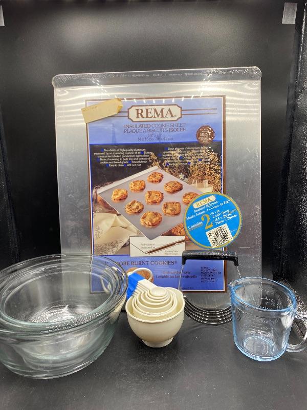 Kitchen baking lot. Comes with two new in the plastic baking sheets, a set of 3 Anchor Hocking mixing bowls, pastry cutter, measuring cups/spoons, and a glass measuring cup. Everything is in very good condition. Baking sheets are 14"x16".