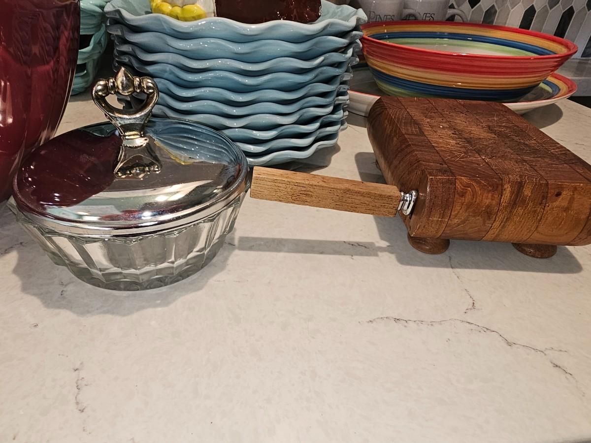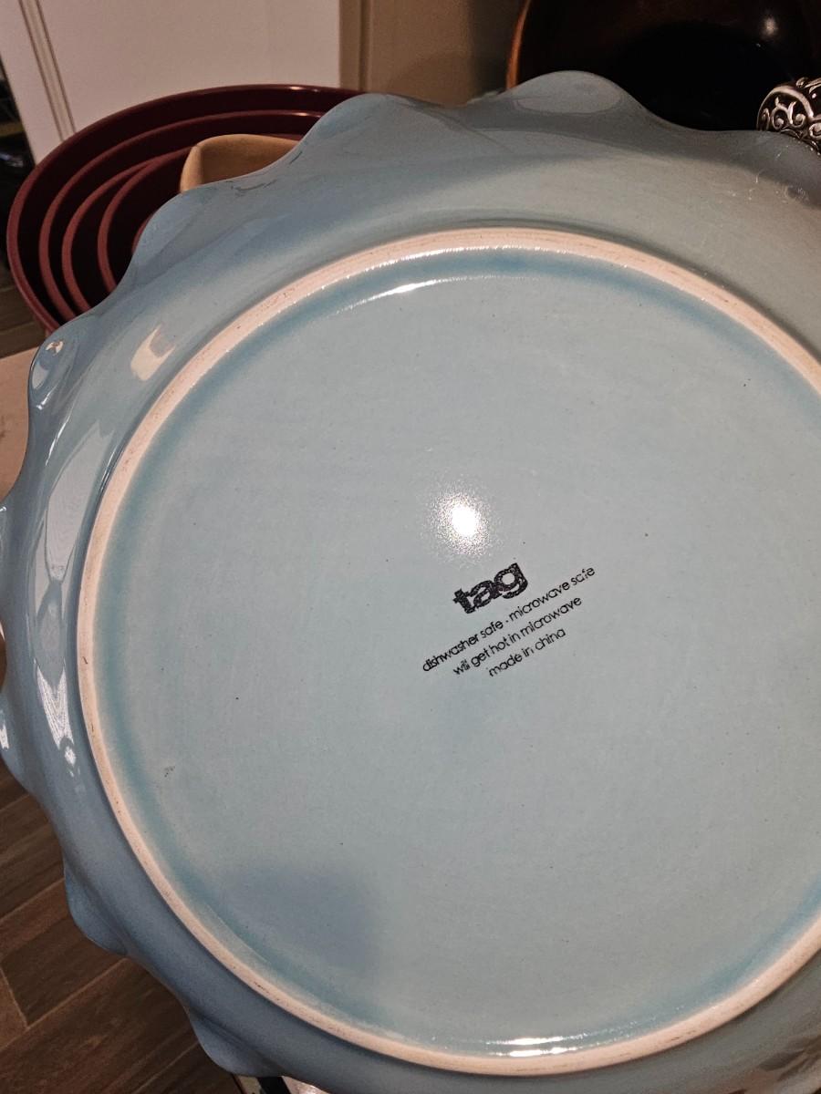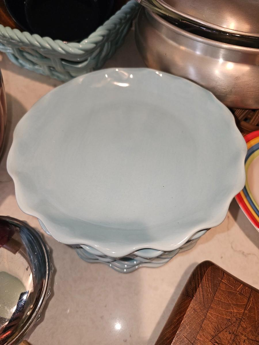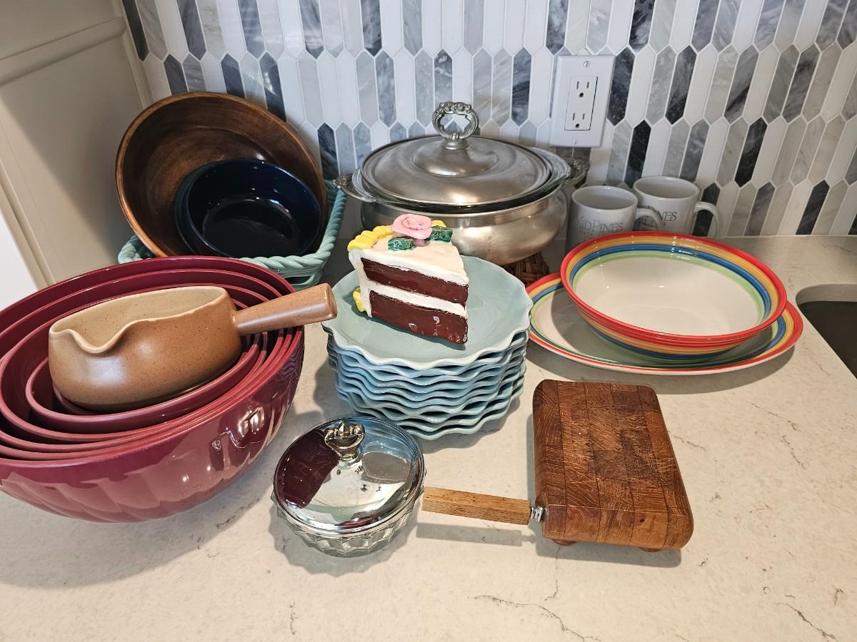 Mixing bowls, wooden bowl, blue scalloped plates, ceramic slice of cake, pasta bowls, other misc pieces