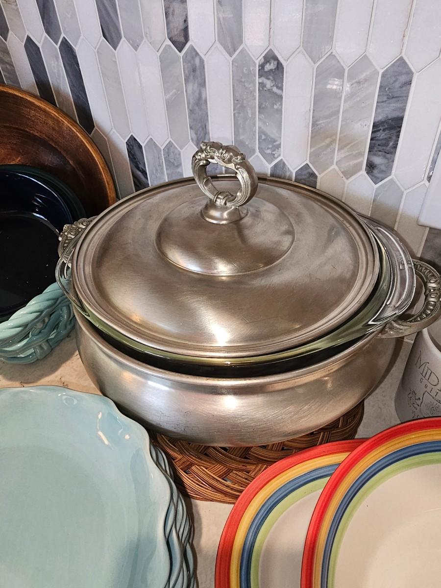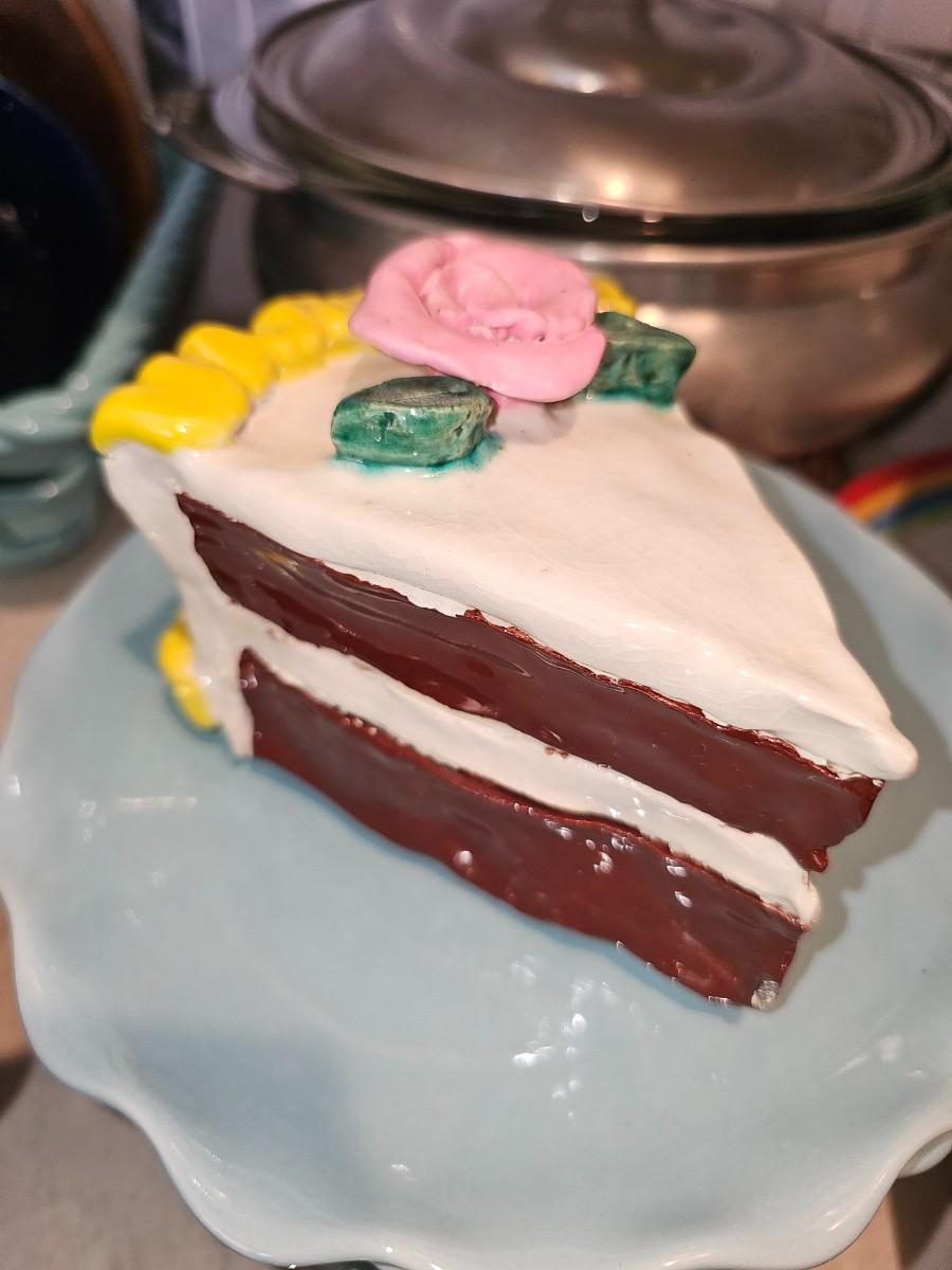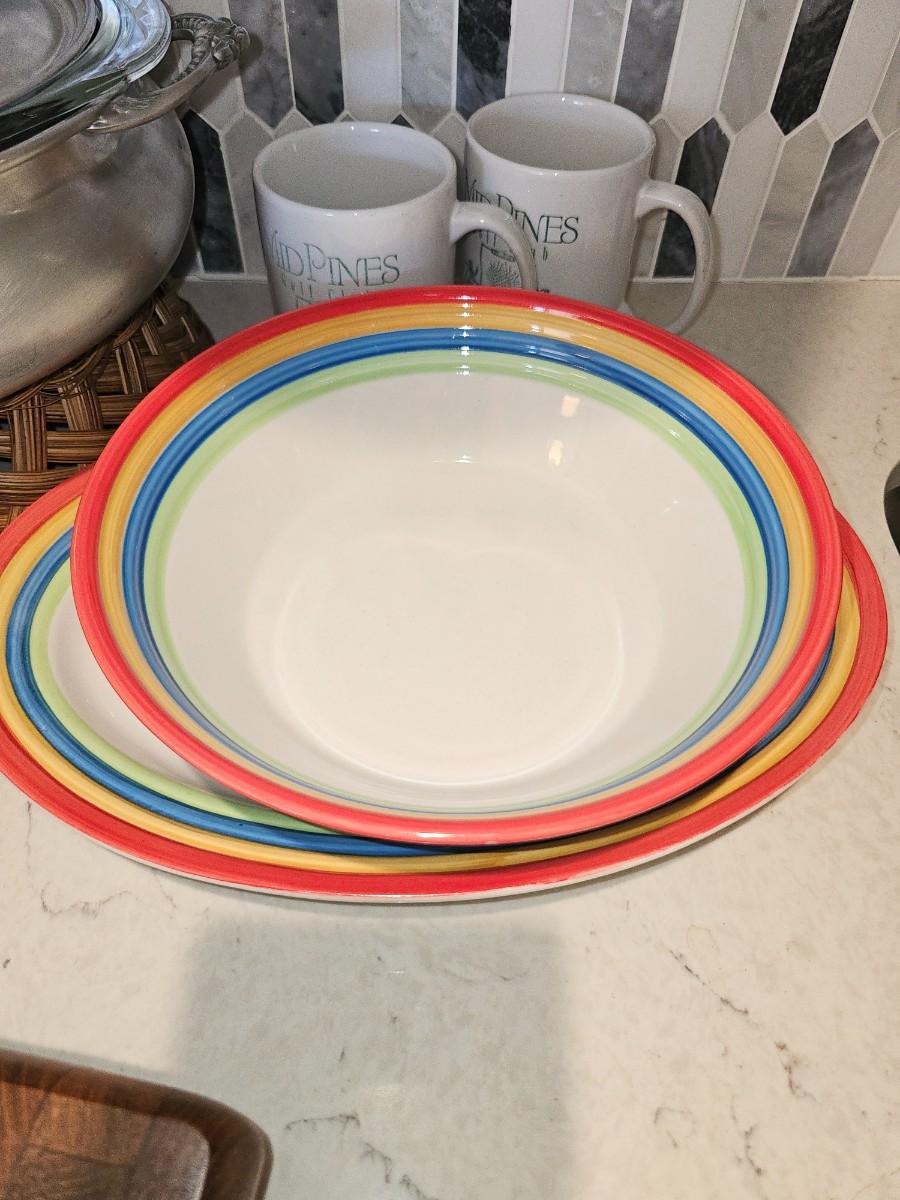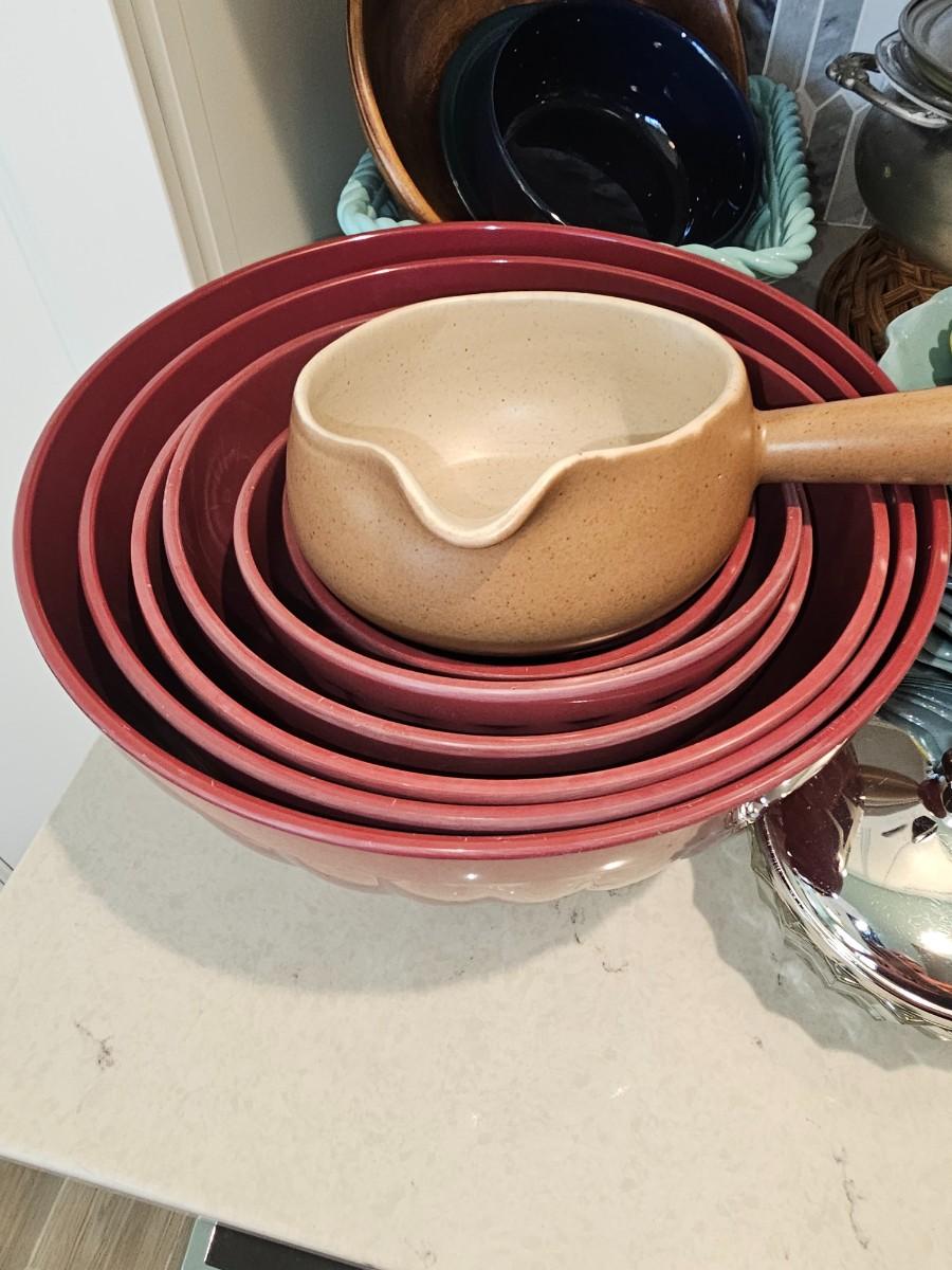Mixing bowls, wooden bowl, blue scalloped plates, ceramic slice of cake, pasta bowls, other misc pieces
