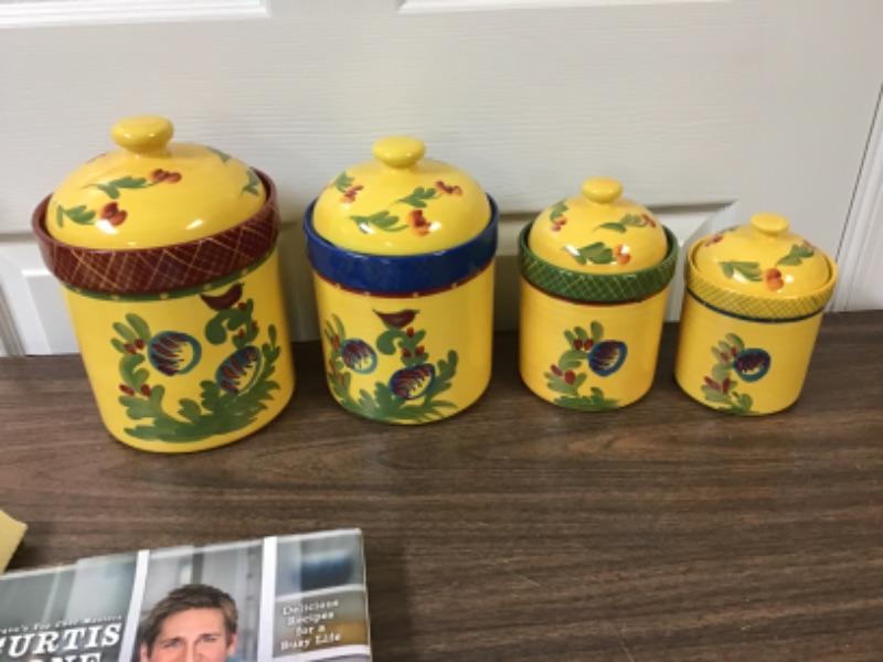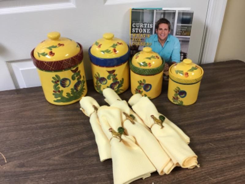 Kitchen Canisters, napkins and Rooster Rings Plus Curtis Stone Cookbook