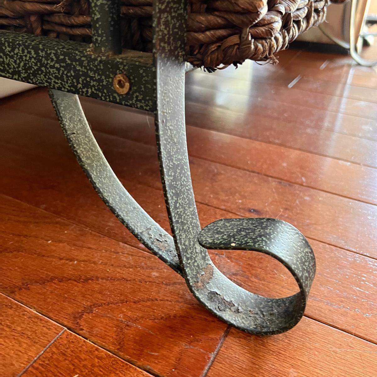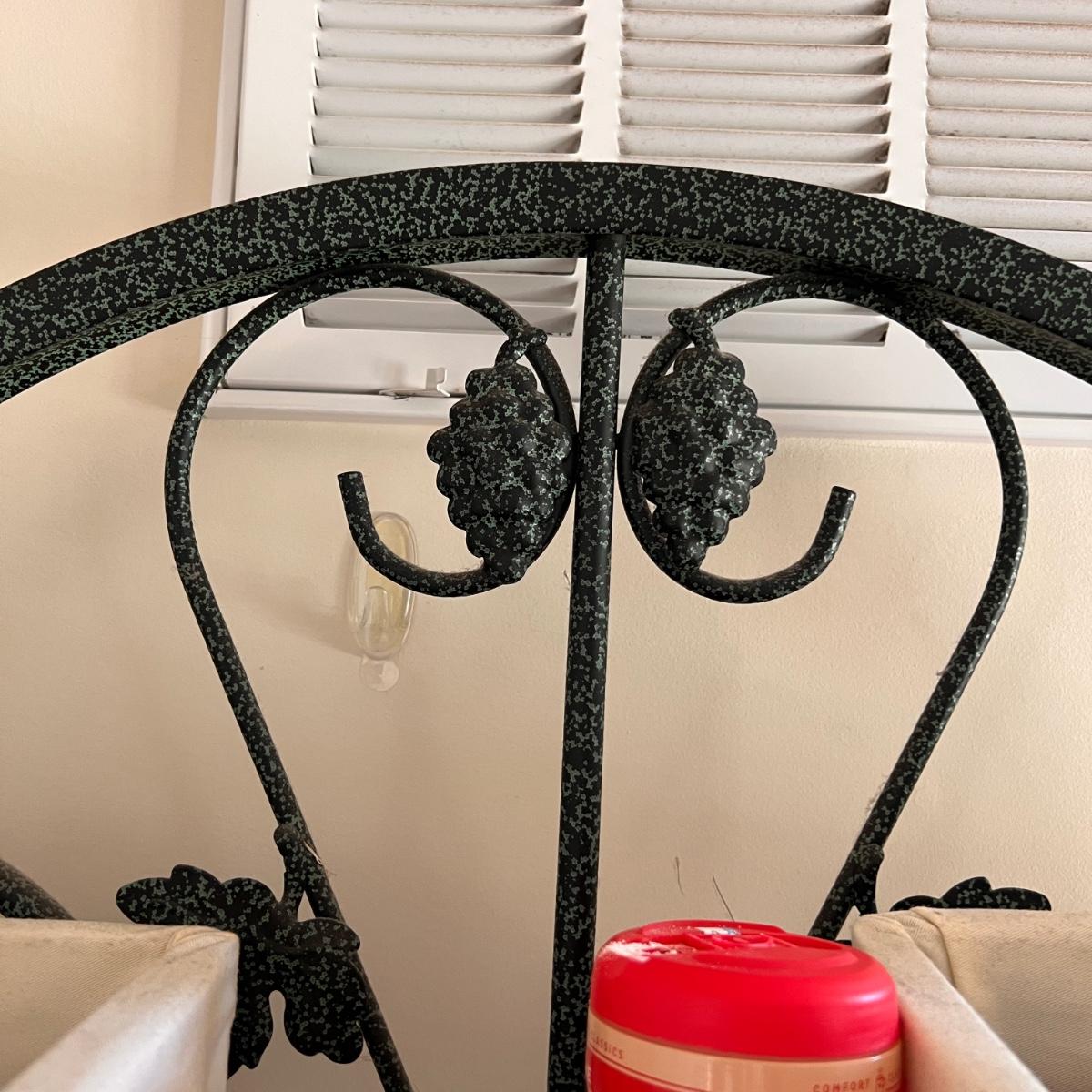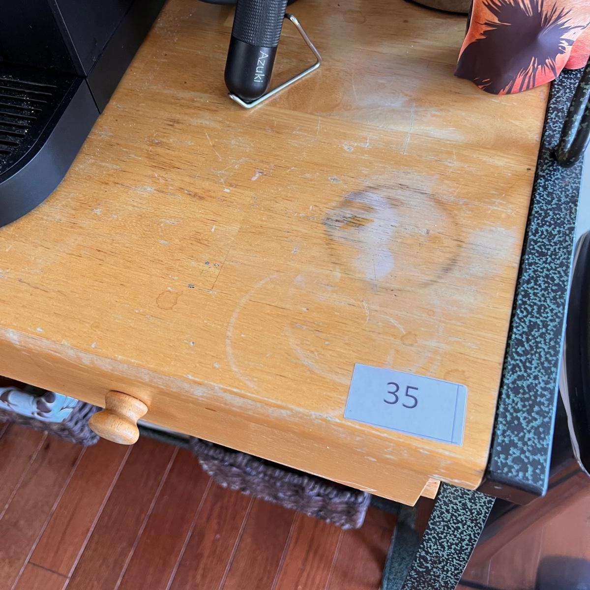 Items on the rack are not included in this auction. Green white speckled metal with wood counter and 2 drawers. Wood has some staining and there a small rust spot on one of the legs as shown in the pictures.