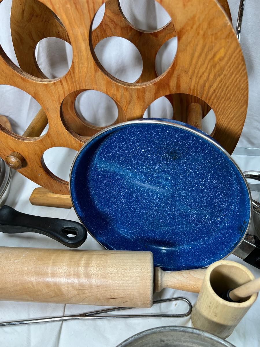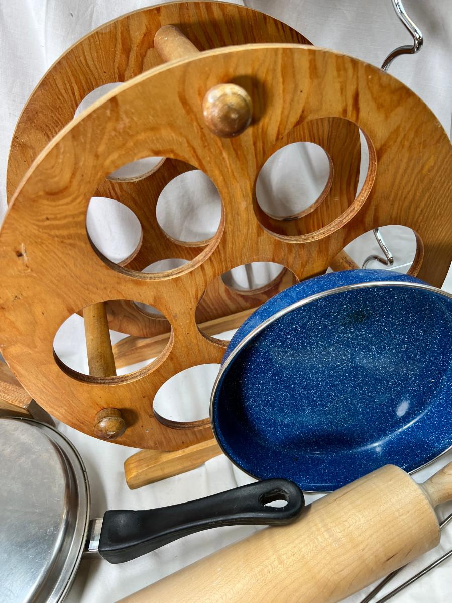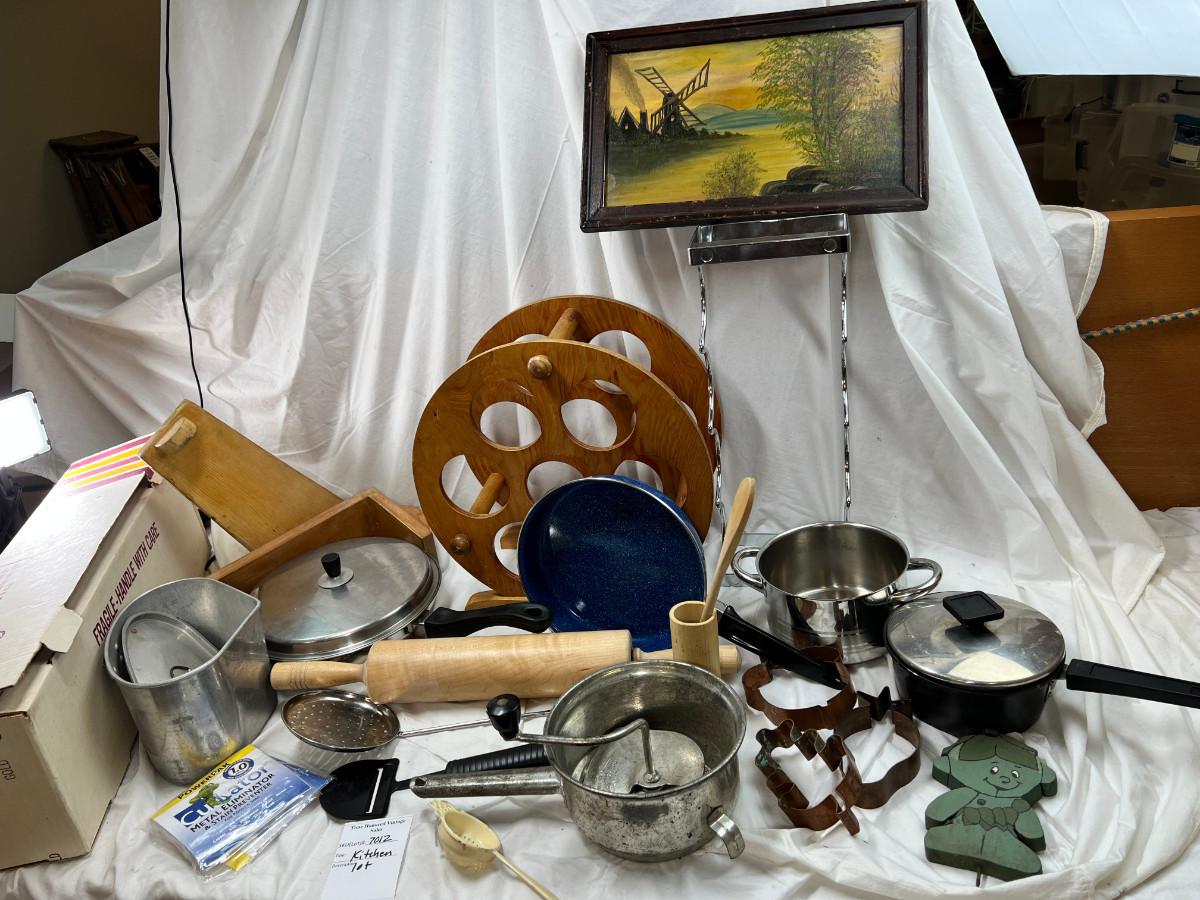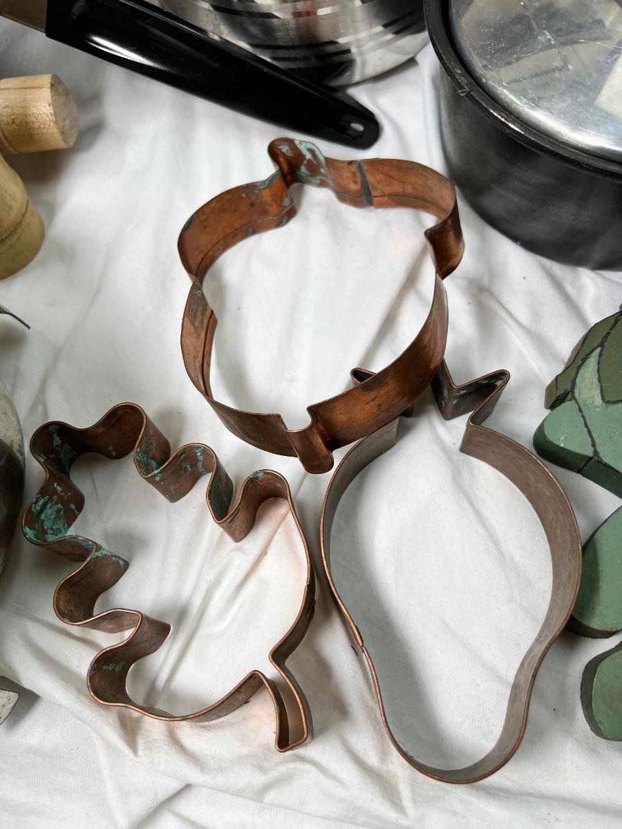 pots, pans, wine storage wood and metal. Book ends, copper cookie cutters