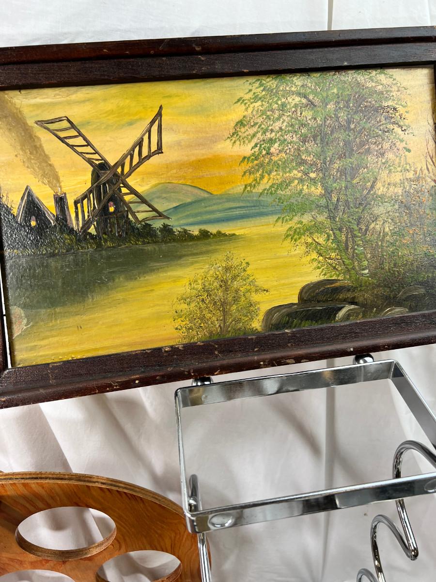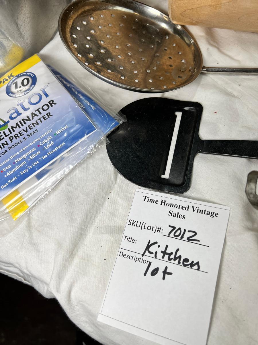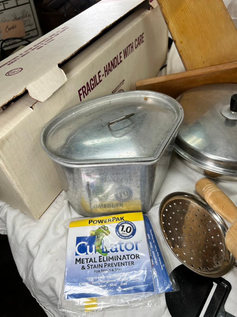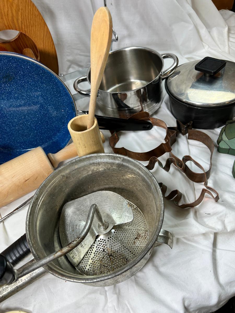 pots, pans, wine storage wood and metal. Book ends, copper cookie cutters