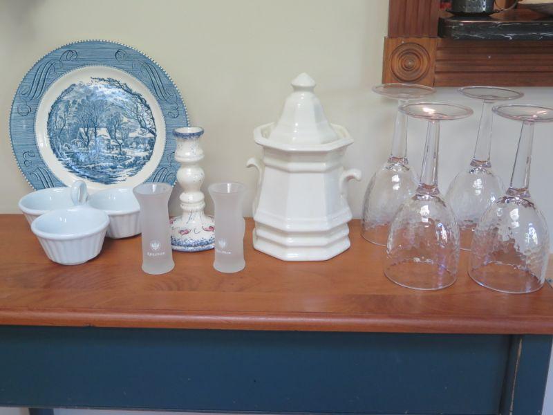 Currier & Ives plate and a variety of items, including plastic wine glasses. **Please read Terms and Conditions before placing a bid. Pick up is Sunday, September 15, 2019 from 11am to 4pm and Tuesday, September 17 from 4pm-7pm in Sicklerville. All sales are final. All sales are as is, where is. Please review all photos. Any props included in photos are not included in listing. All measurements are approximate.