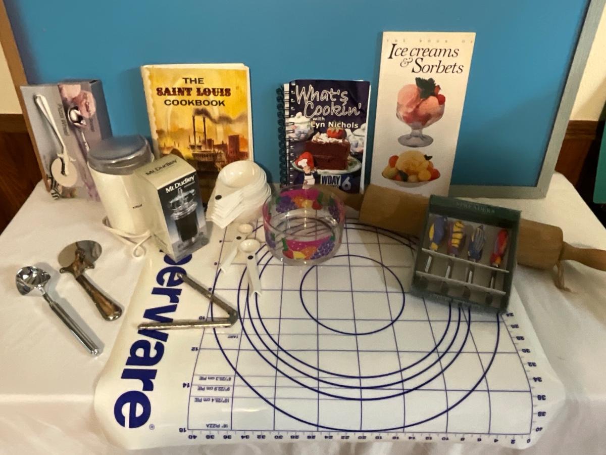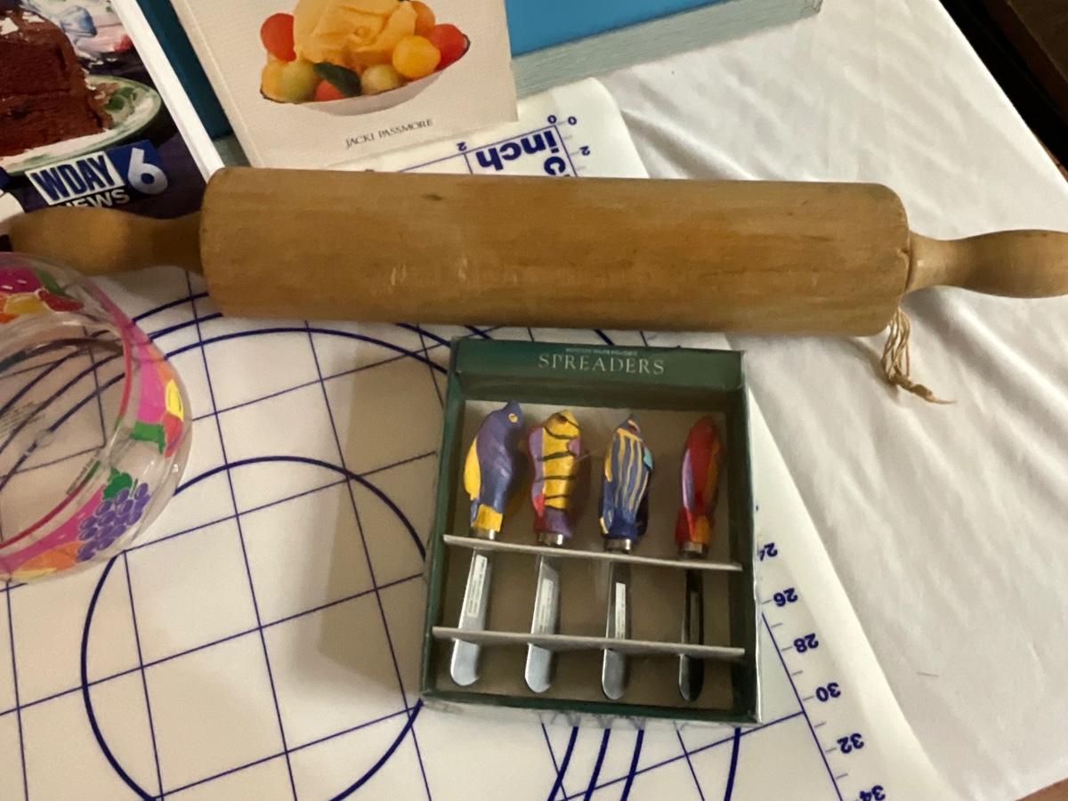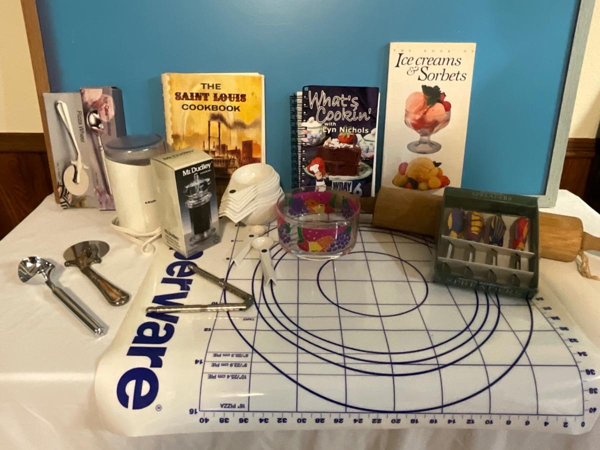 Kitchen - cookbooks, dough mat, spreaders, measuring cup, nut cracker, pizza cutter and more