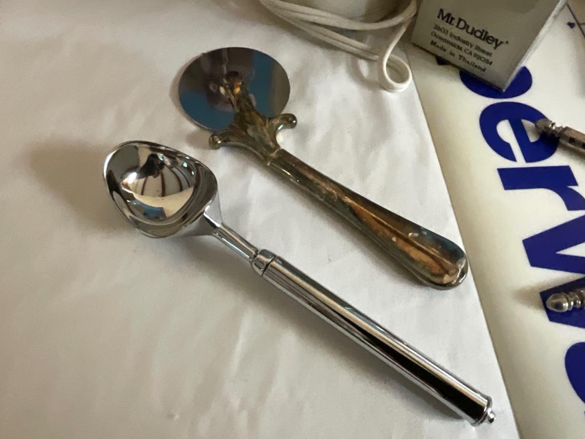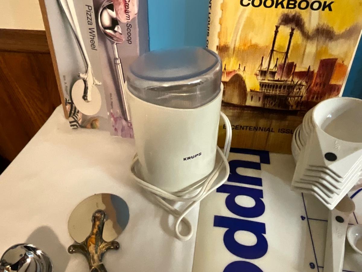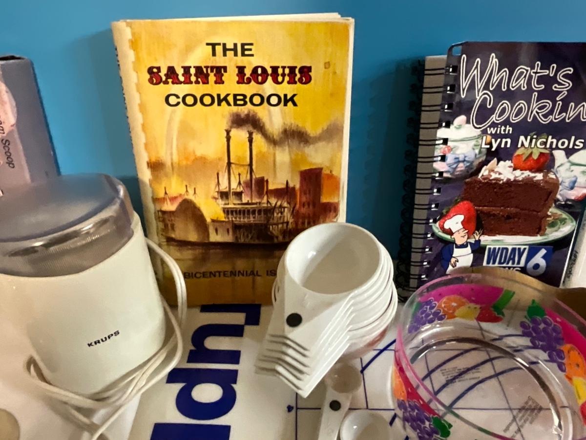 Kitchen - cookbooks, dough mat, spreaders, measuring cup, nut cracker, pizza cutter and more