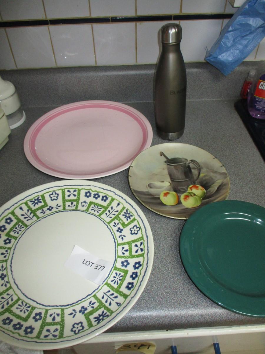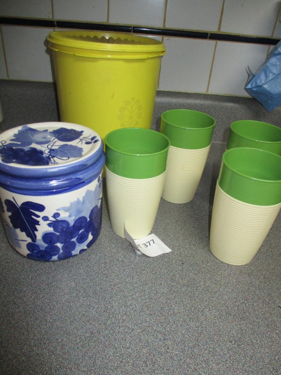 Single yellow tupperware canister. Vintage thermal temp cups set of 4 green & Cream. . 1 insulated water bottle. 1 blue/white jar. misc plates. Anderson Bros Milk Bottle.