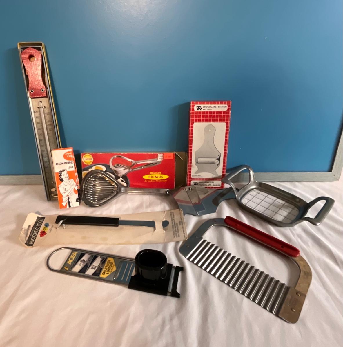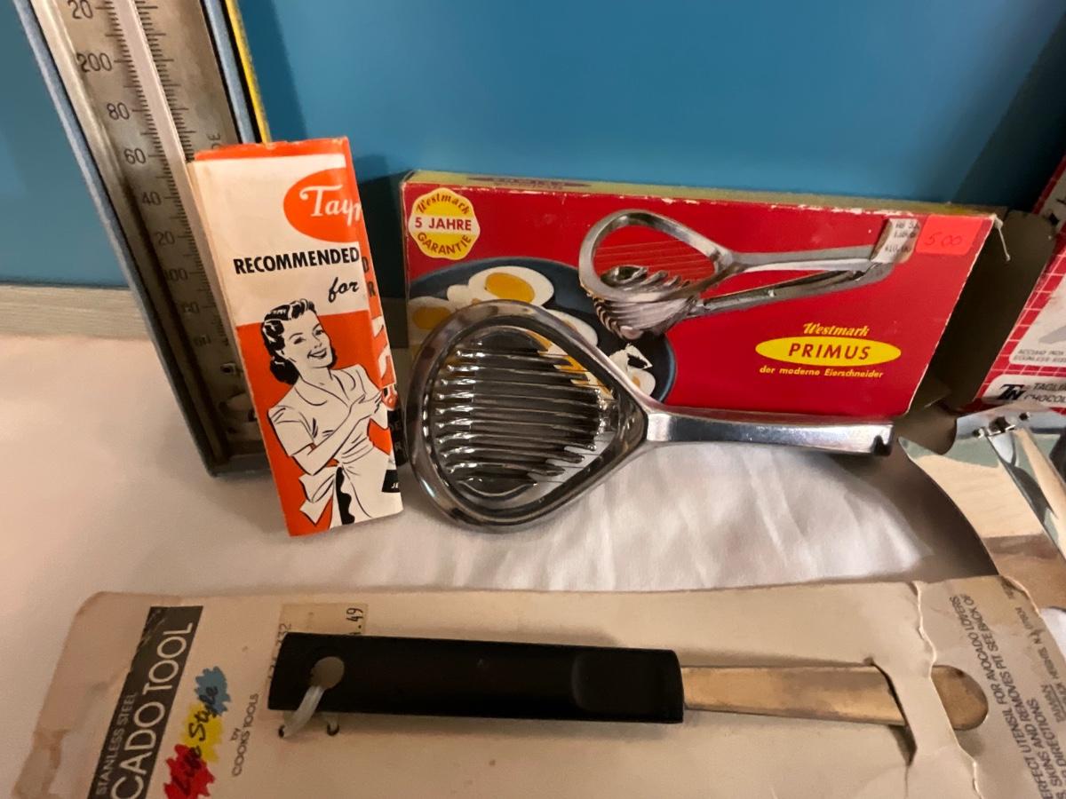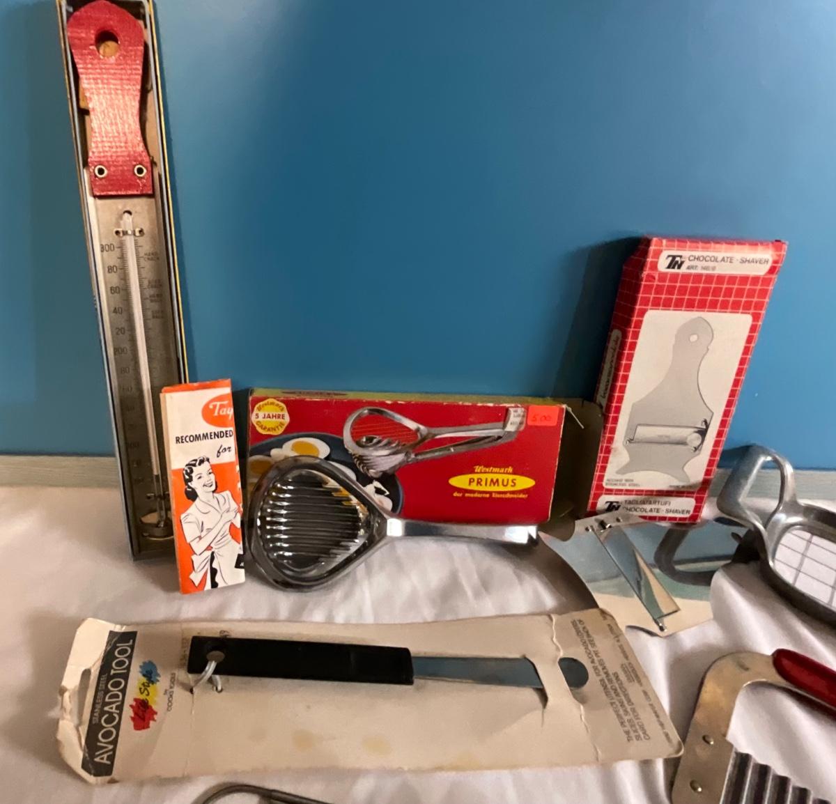 Vintage Kitchen Cutting tools, avocado tool, thermometer, egg cutter plus