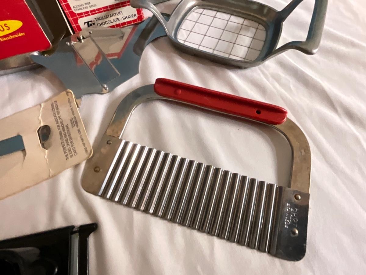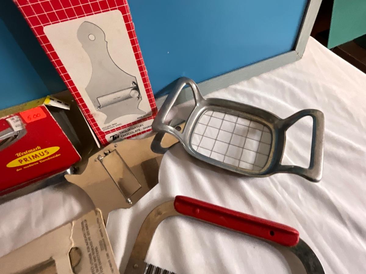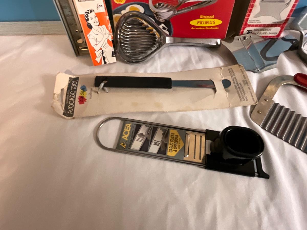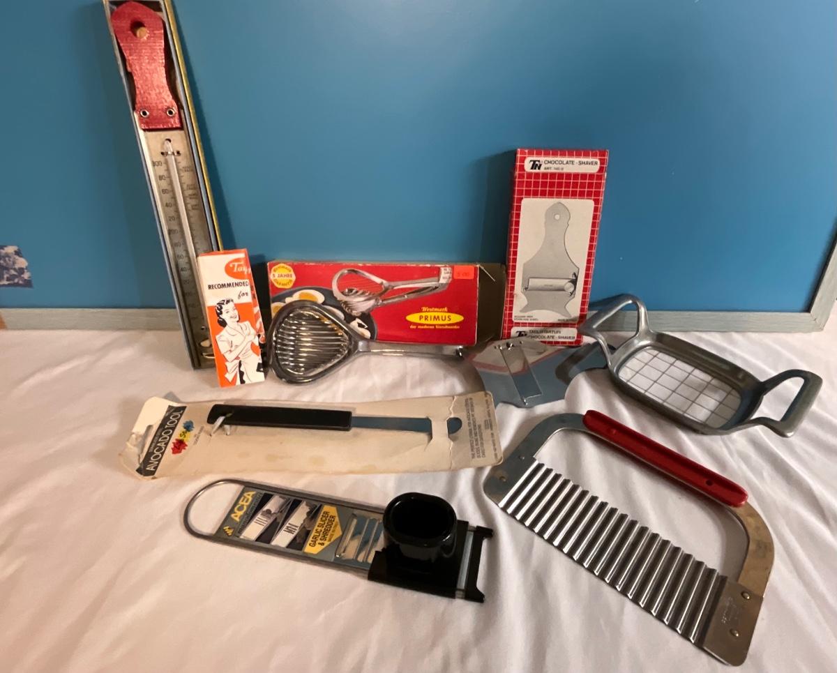 Vintage Kitchen Cutting tools, avocado tool, thermometer, egg cutter plus