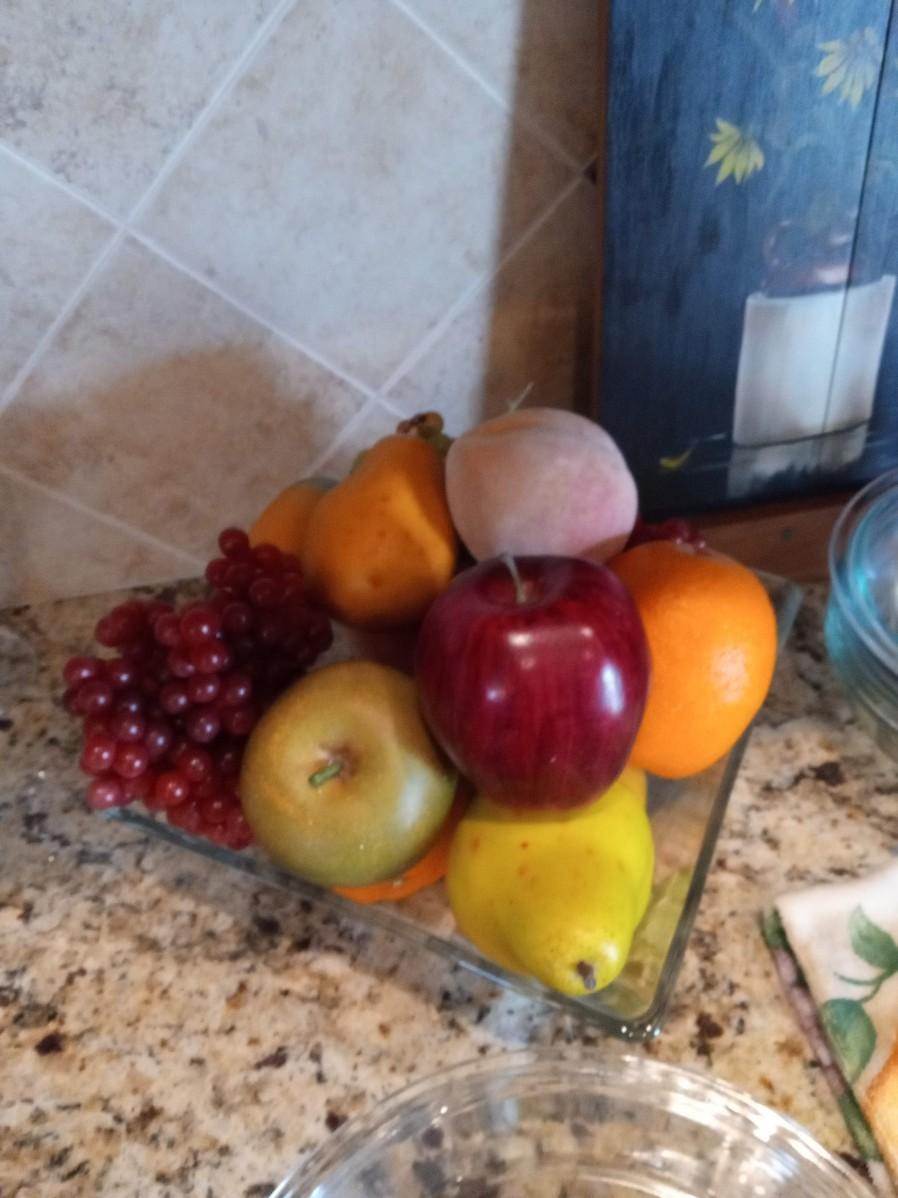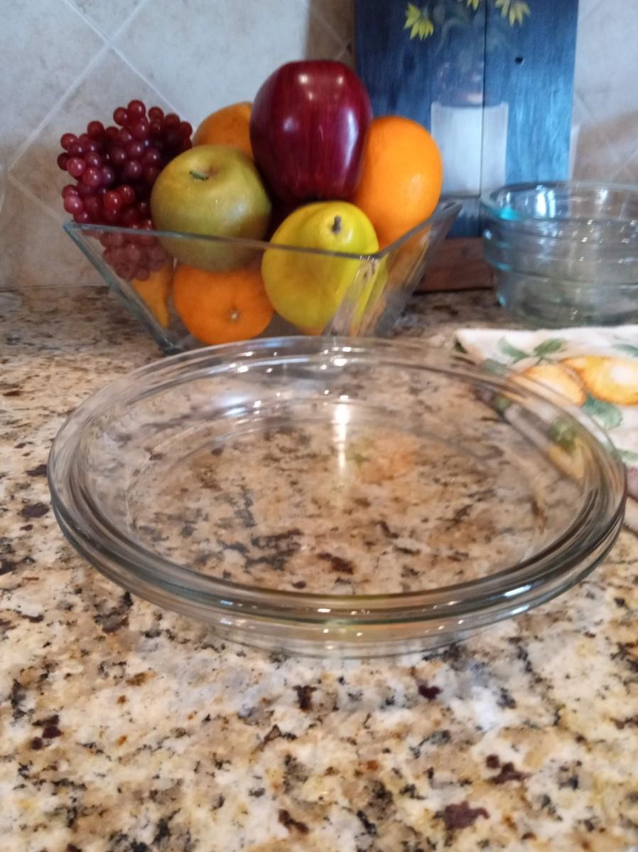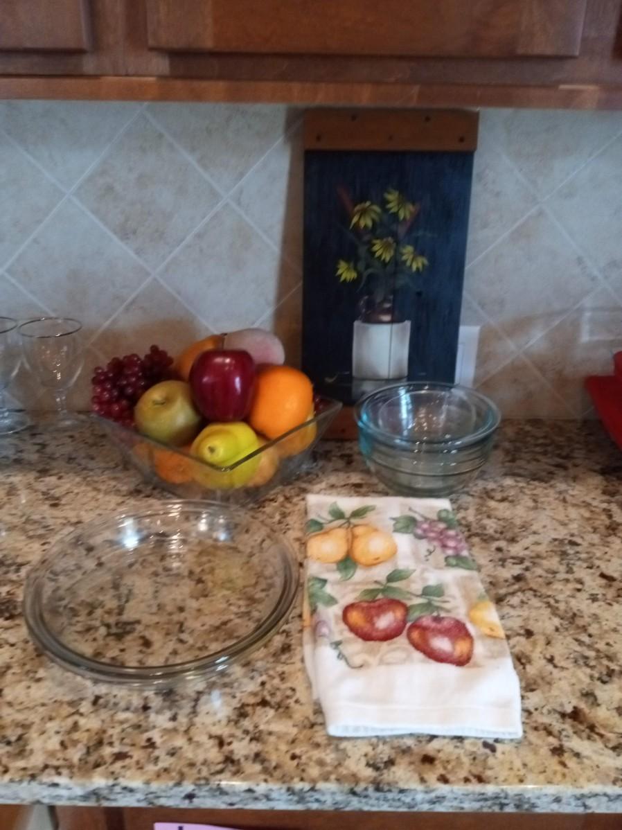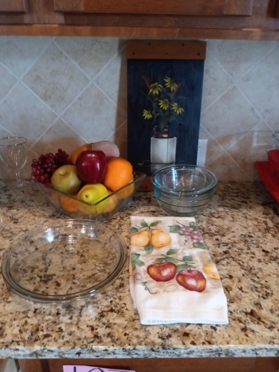 LARGE GLASS SERVING BOWL WITH FAUX FRUIT, 2 GLASS PIE PANS, GLASS BOWLS, WOODEN WALL HUNG PICTURE, DISH TOWEL