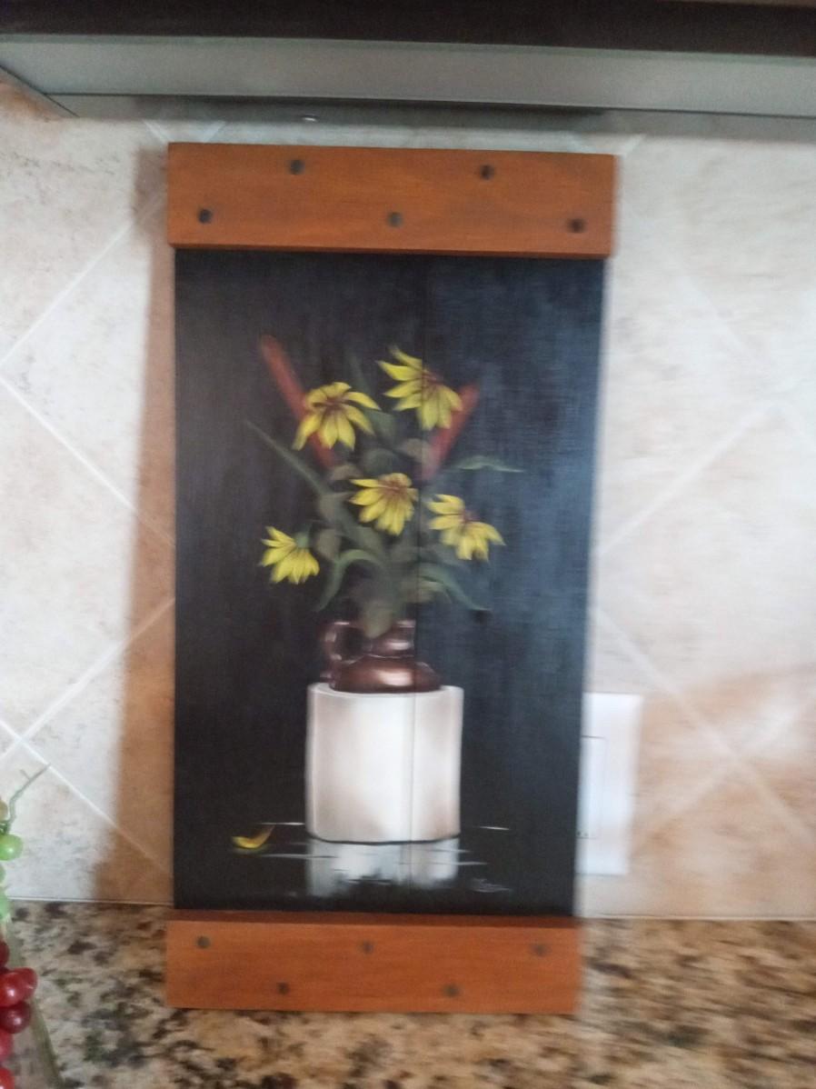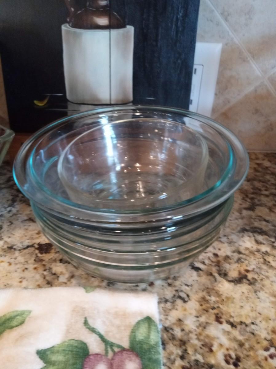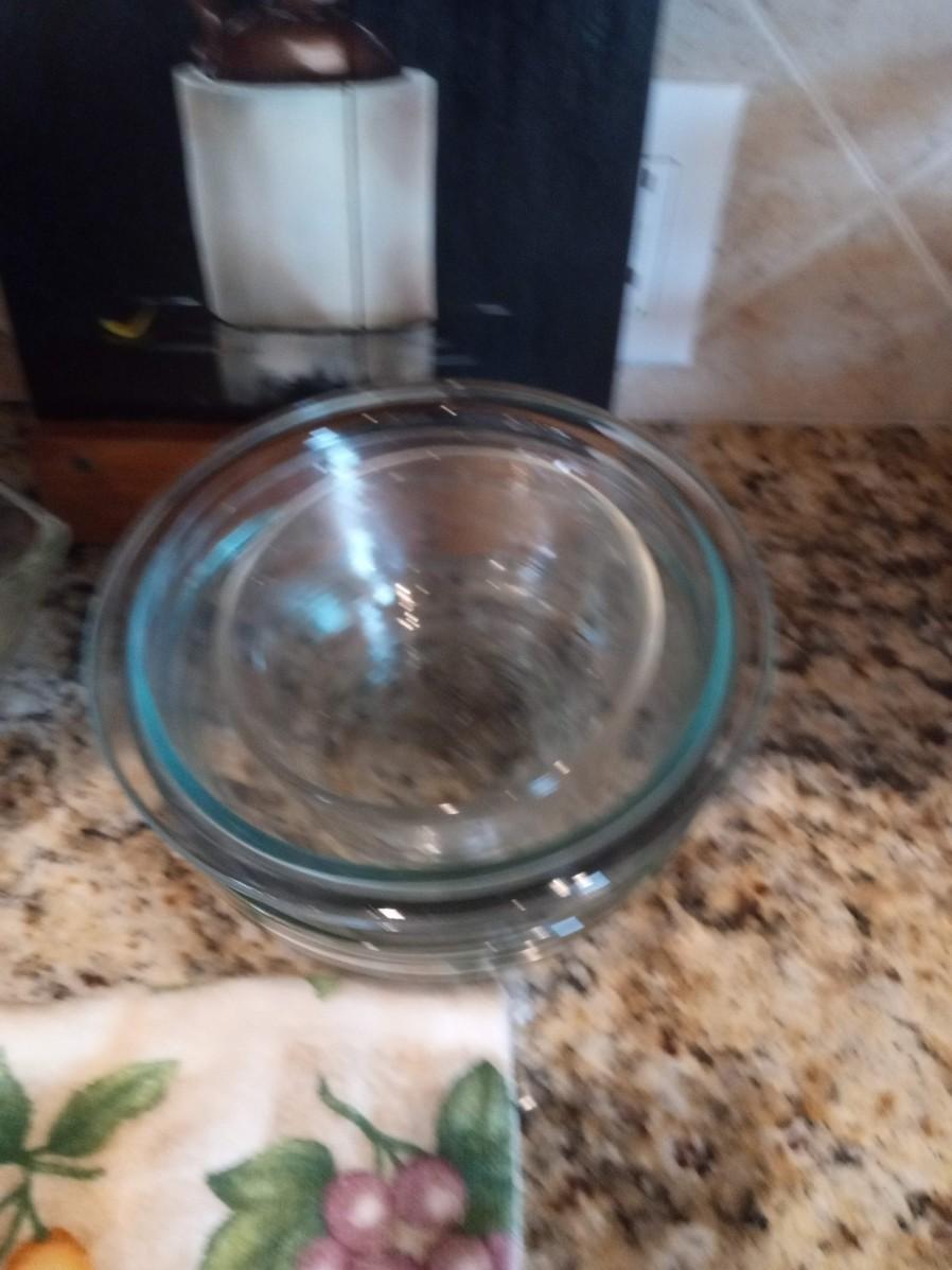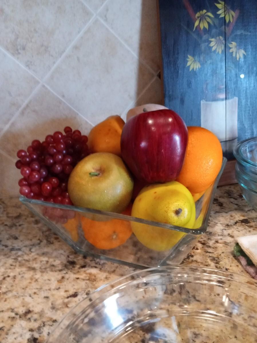 LARGE GLASS SERVING BOWL WITH FAUX FRUIT, 2 GLASS PIE PANS, GLASS BOWLS, WOODEN WALL HUNG PICTURE, DISH TOWEL