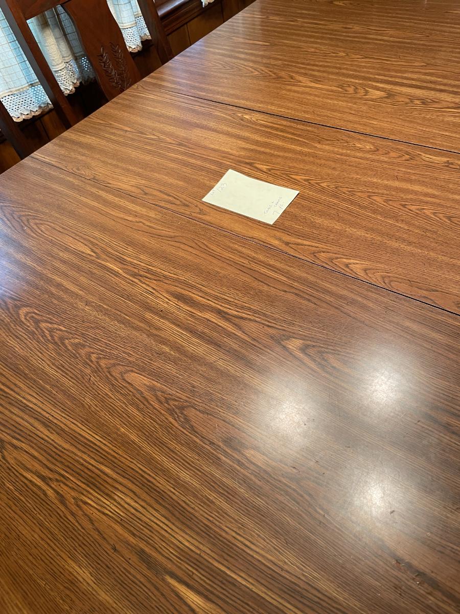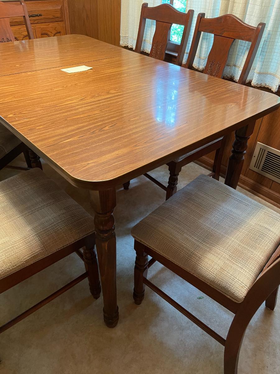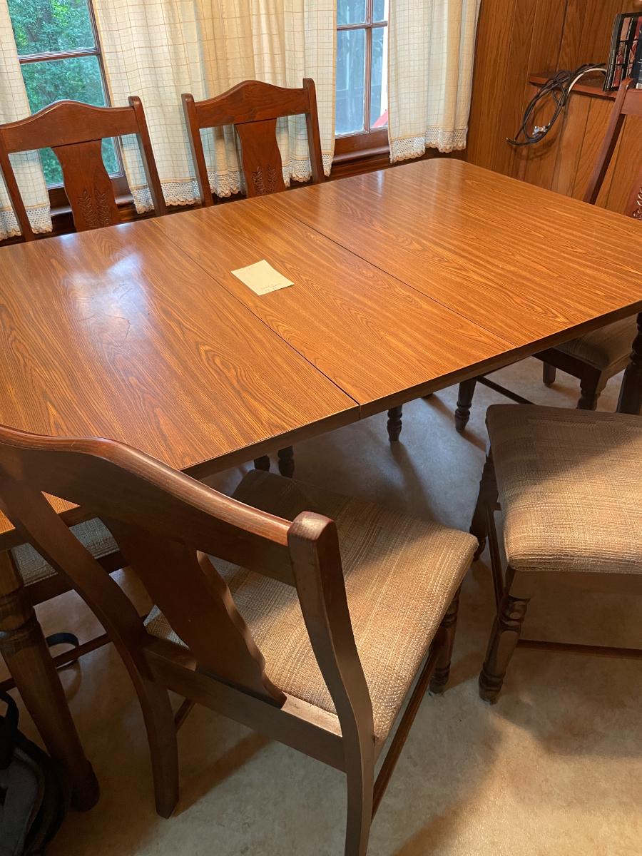 Table with formica top includes 1 leaf and 6 chairs