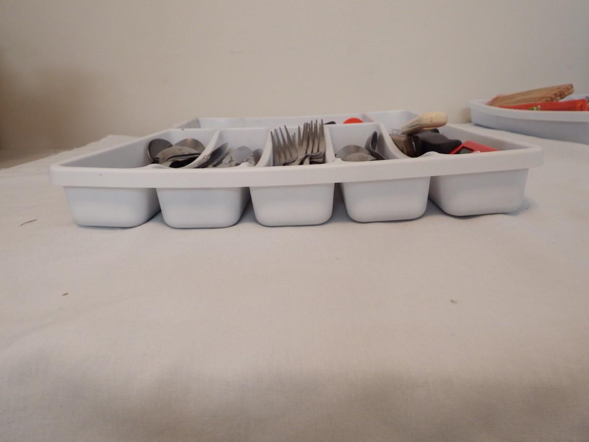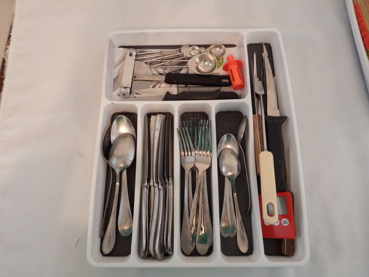 Drawer tray is new. Silverware, timer, silver measuring spoons, & more.