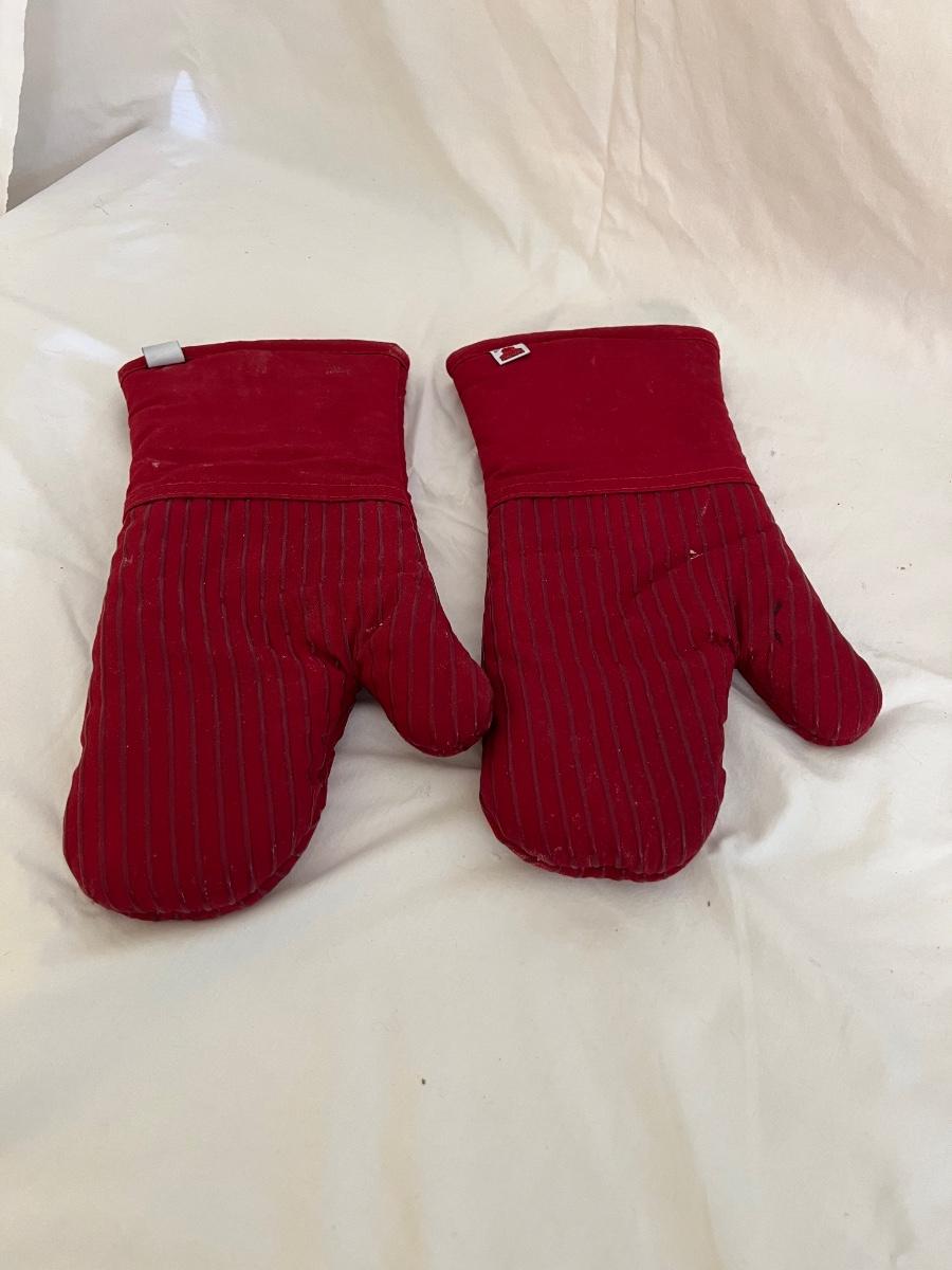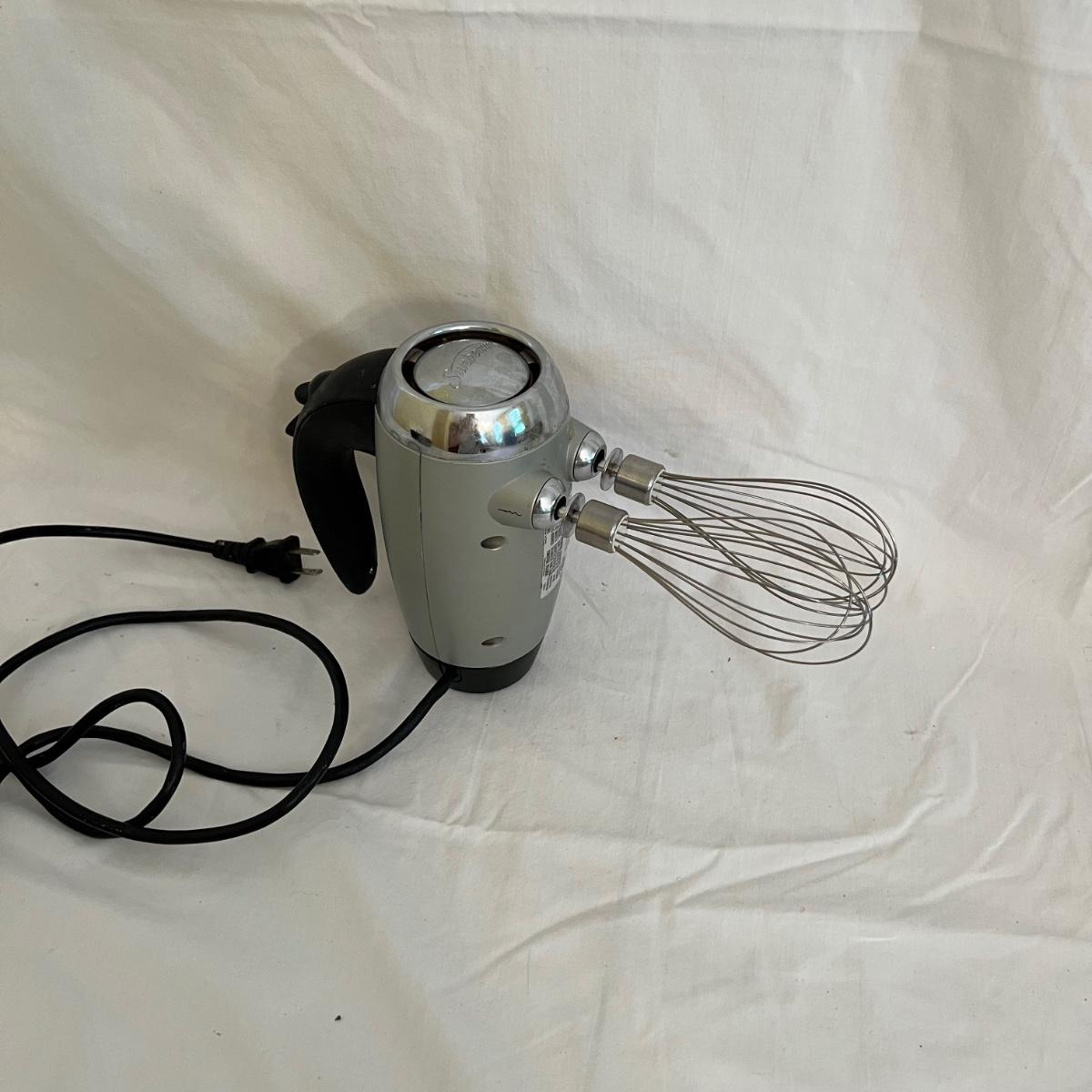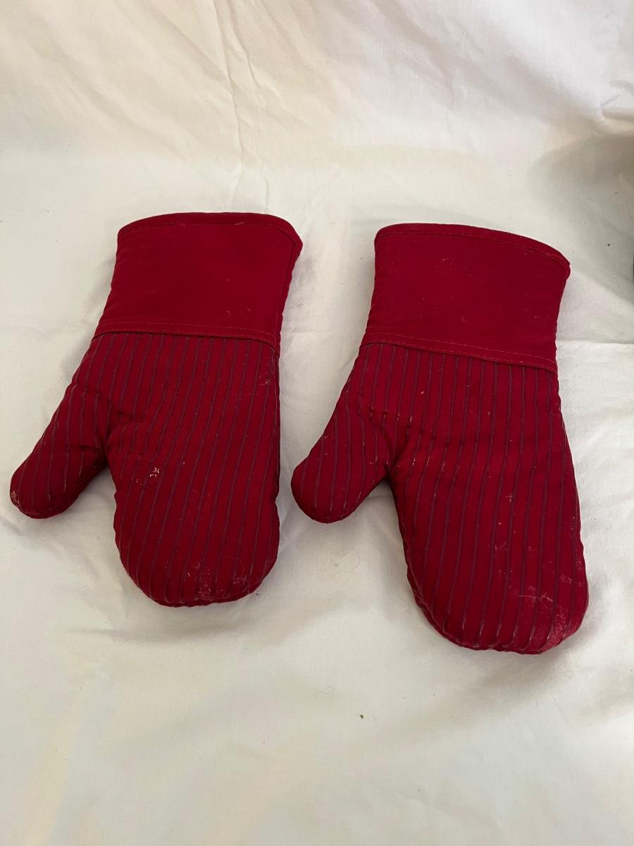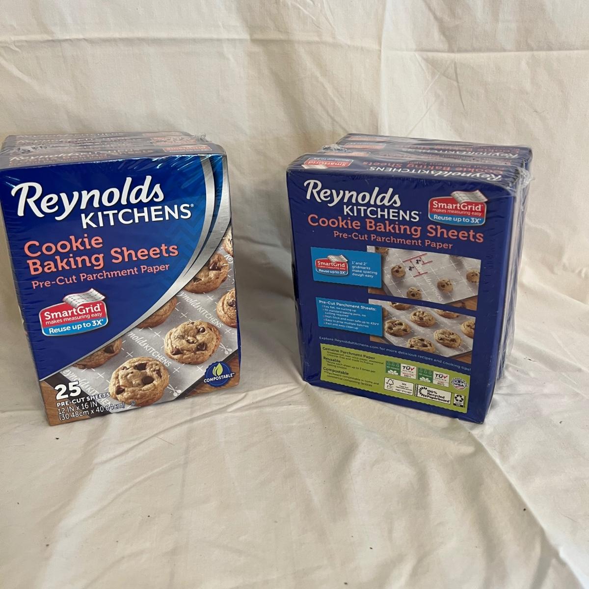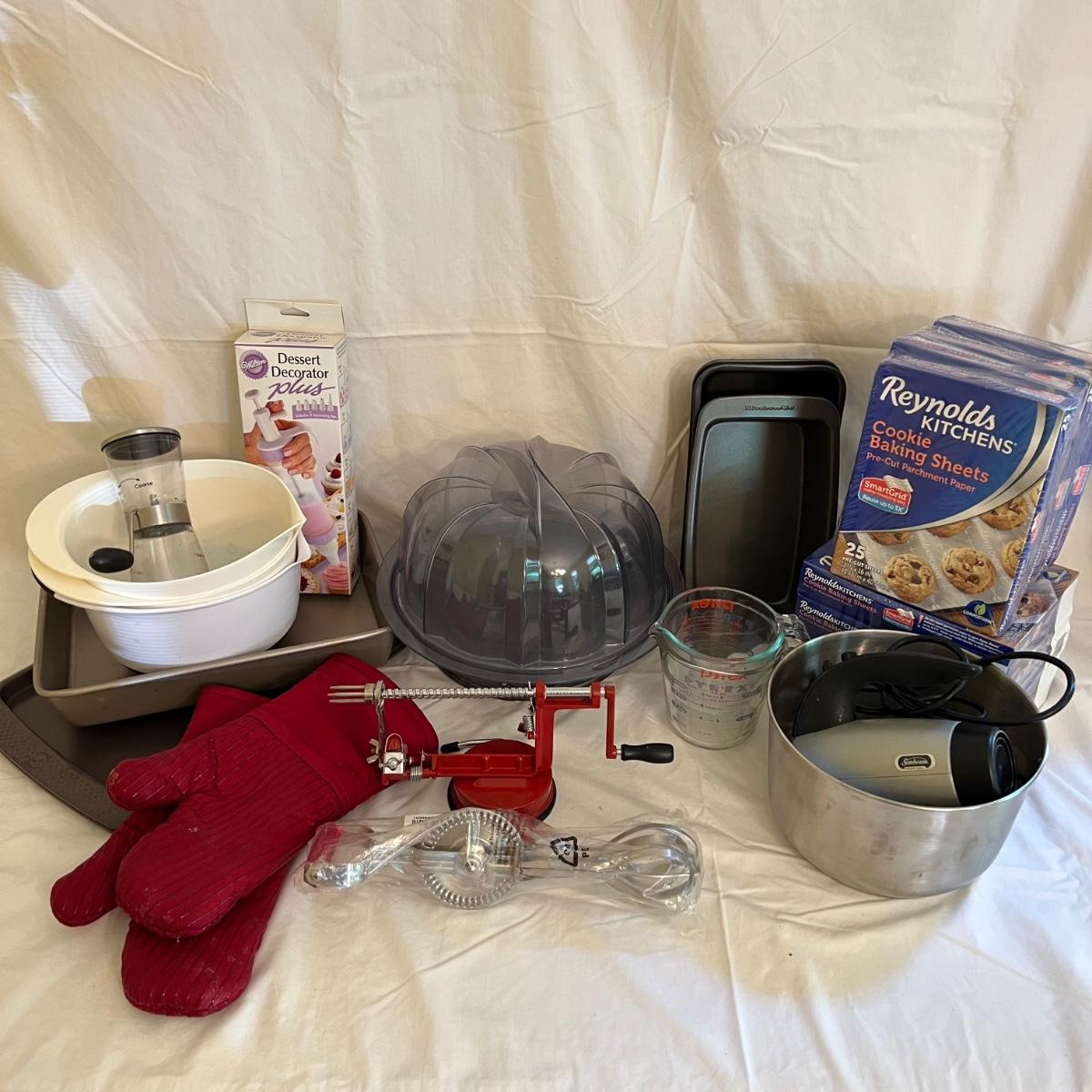A sizable collection of kitchen necessities. A plastic Bundt cake cover and plate, eight boxes of Reynolds kitchen cooking precut parchment paper sheets, two Pyrex measuring cups, one hand-crank kitchen grinder, a springform pan, a Sunbeam hand mixer, and stainless steel bowl, a spiral cutter that appears to be metal and an egg beater, as well as three loaf pans, two non-stick sheet pans and one lasagna-size baking pan. Also includes a dessert decorating tool as well as three plastic mixing bowls and last but not least two red oven mitts. The electric mixer powered on when plugged in. A few items could use cleaning.