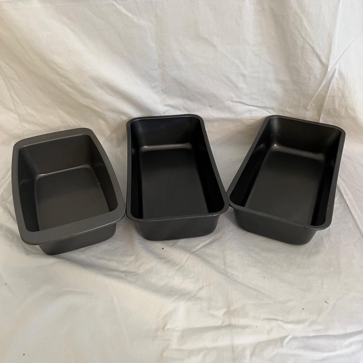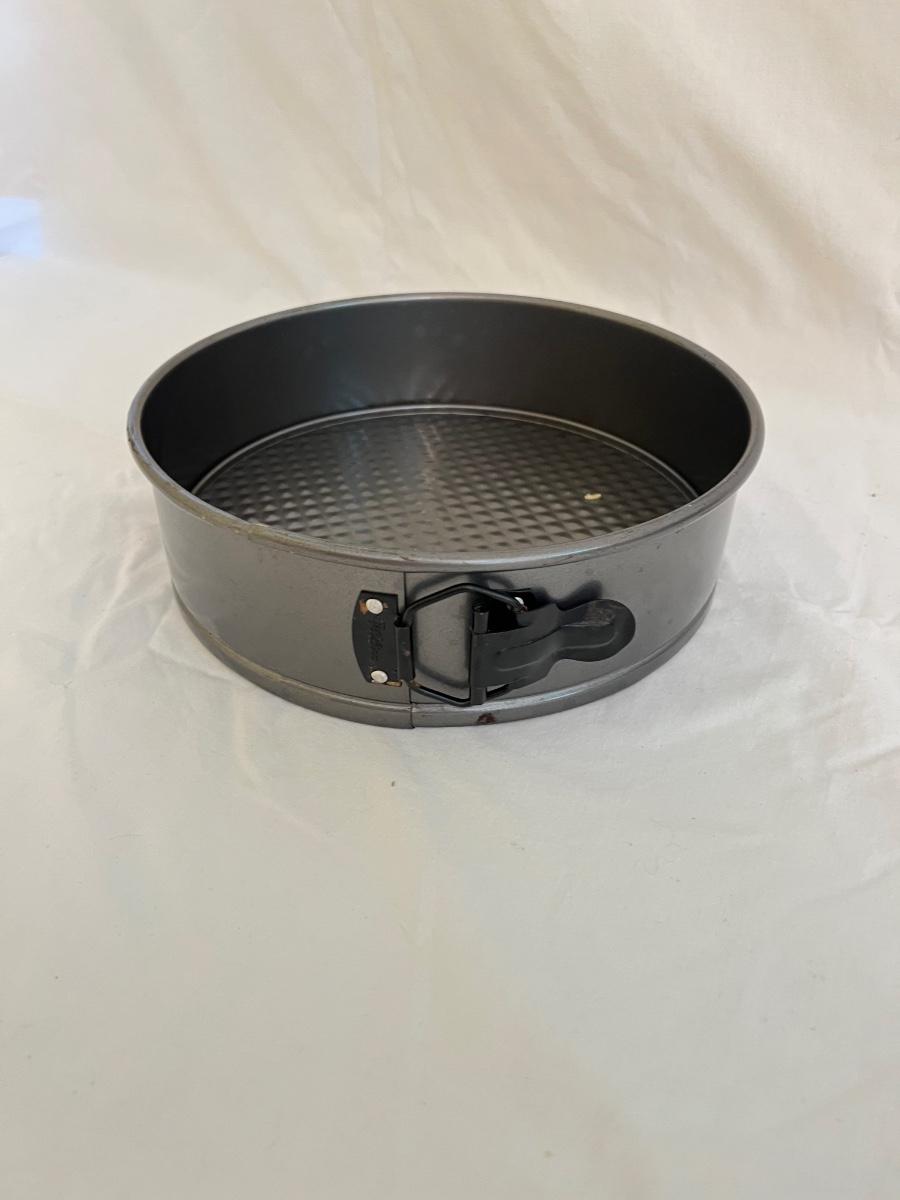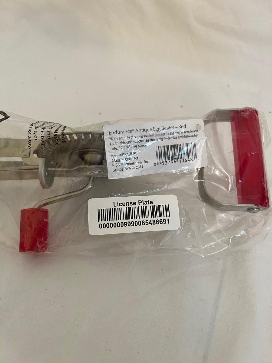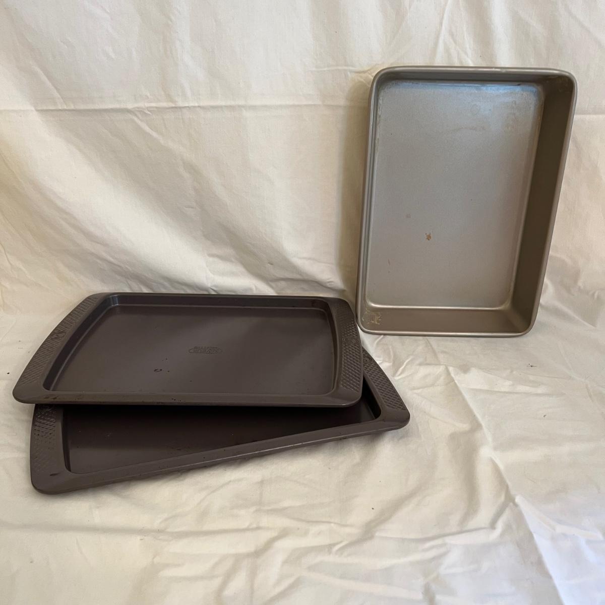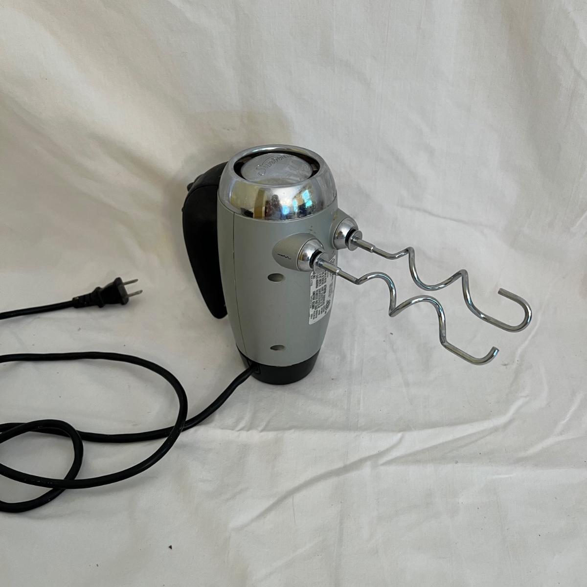 A sizable collection of kitchen necessities. A plastic Bundt cake cover and plate, eight boxes of Reynolds kitchen cooking precut parchment paper sheets, two Pyrex measuring cups, one hand-crank kitchen grinder, a springform pan, a Sunbeam hand mixer, and stainless steel bowl, a spiral cutter that appears to be metal and an egg beater, as well as three loaf pans, two non-stick sheet pans and one lasagna-size baking pan. Also includes a dessert decorating tool as well as three plastic mixing bowls and last but not least two red oven mitts. The electric mixer powered on when plugged in. A few items could use cleaning.