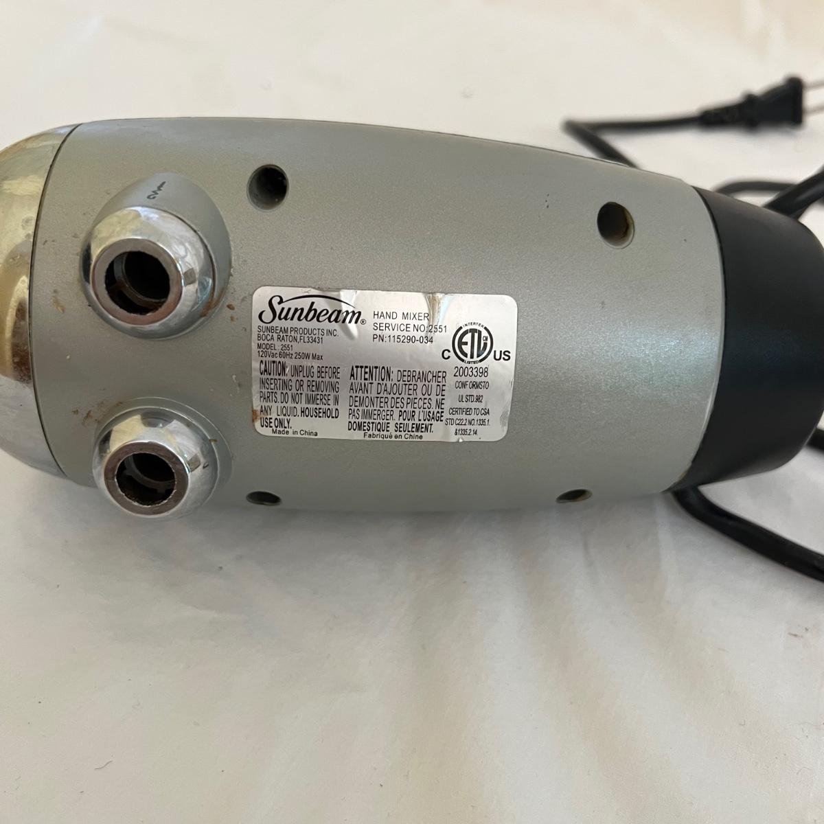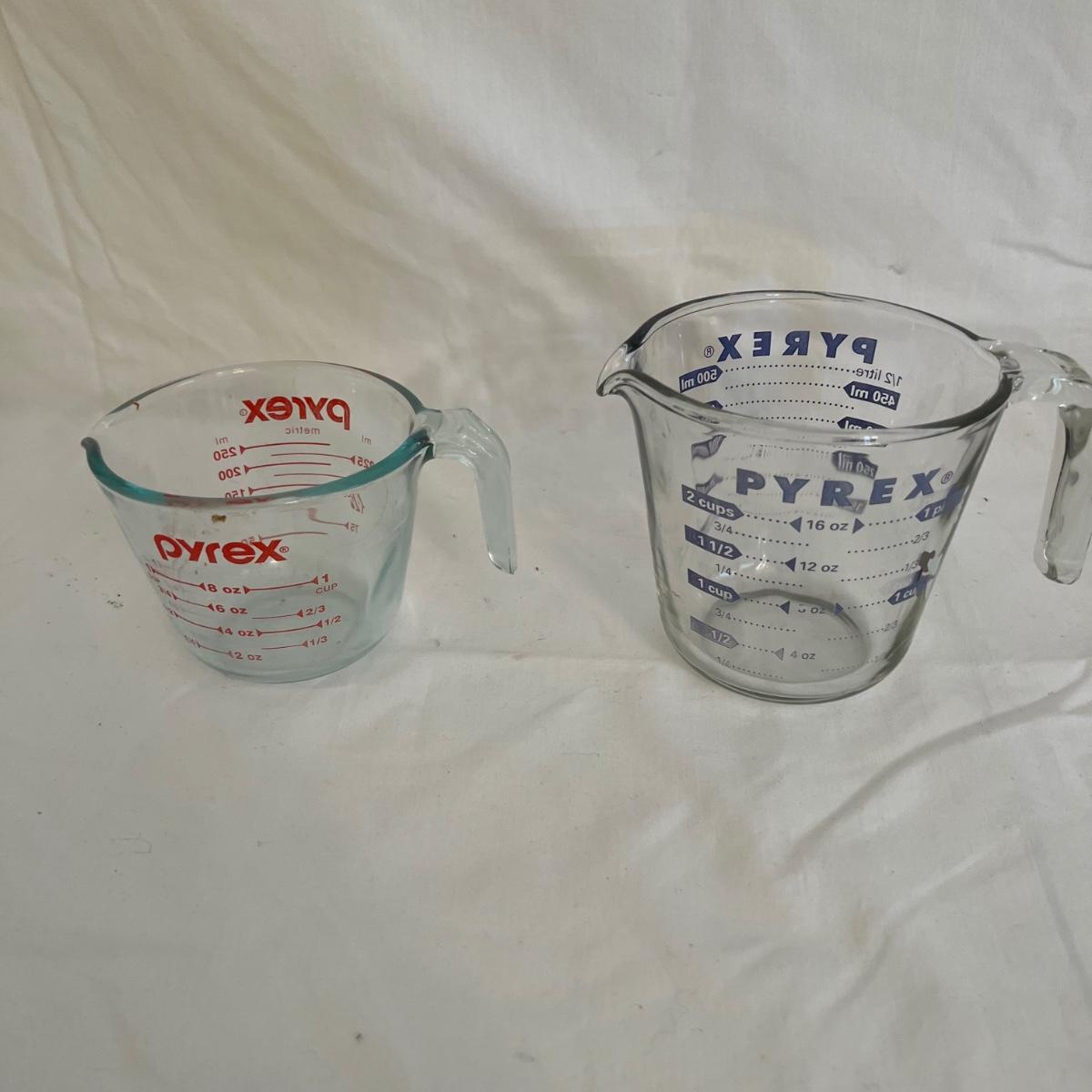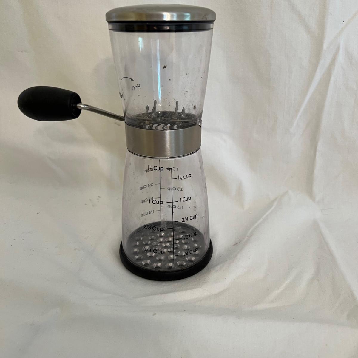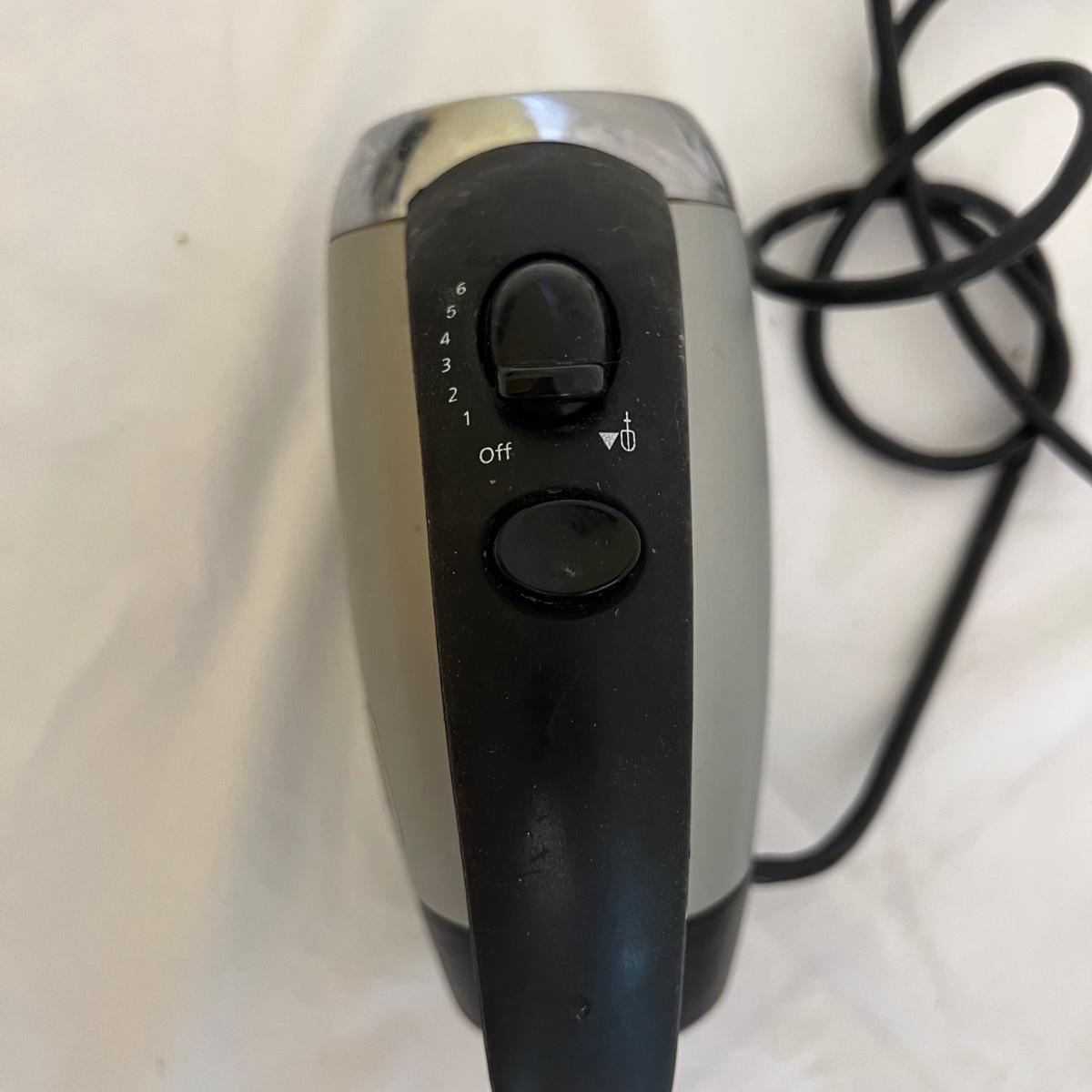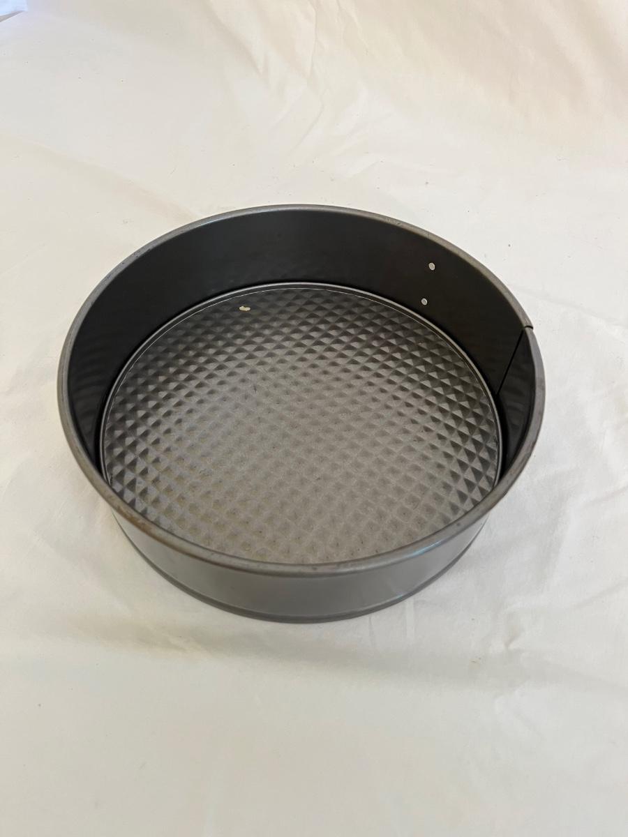 A sizable collection of kitchen necessities. A plastic Bundt cake cover and plate, eight boxes of Reynolds kitchen cooking precut parchment paper sheets, two Pyrex measuring cups, one hand-crank kitchen grinder, a springform pan, a Sunbeam hand mixer, and stainless steel bowl, a spiral cutter that appears to be metal and an egg beater, as well as three loaf pans, two non-stick sheet pans and one lasagna-size baking pan. Also includes a dessert decorating tool as well as three plastic mixing bowls and last but not least two red oven mitts. The electric mixer powered on when plugged in. A few items could use cleaning.