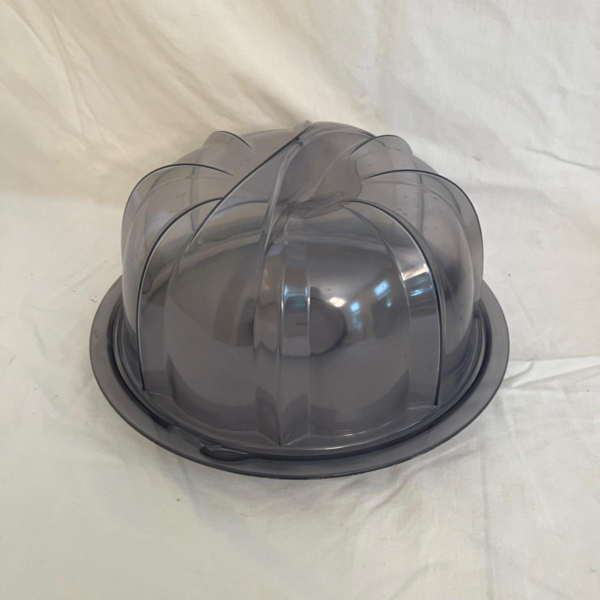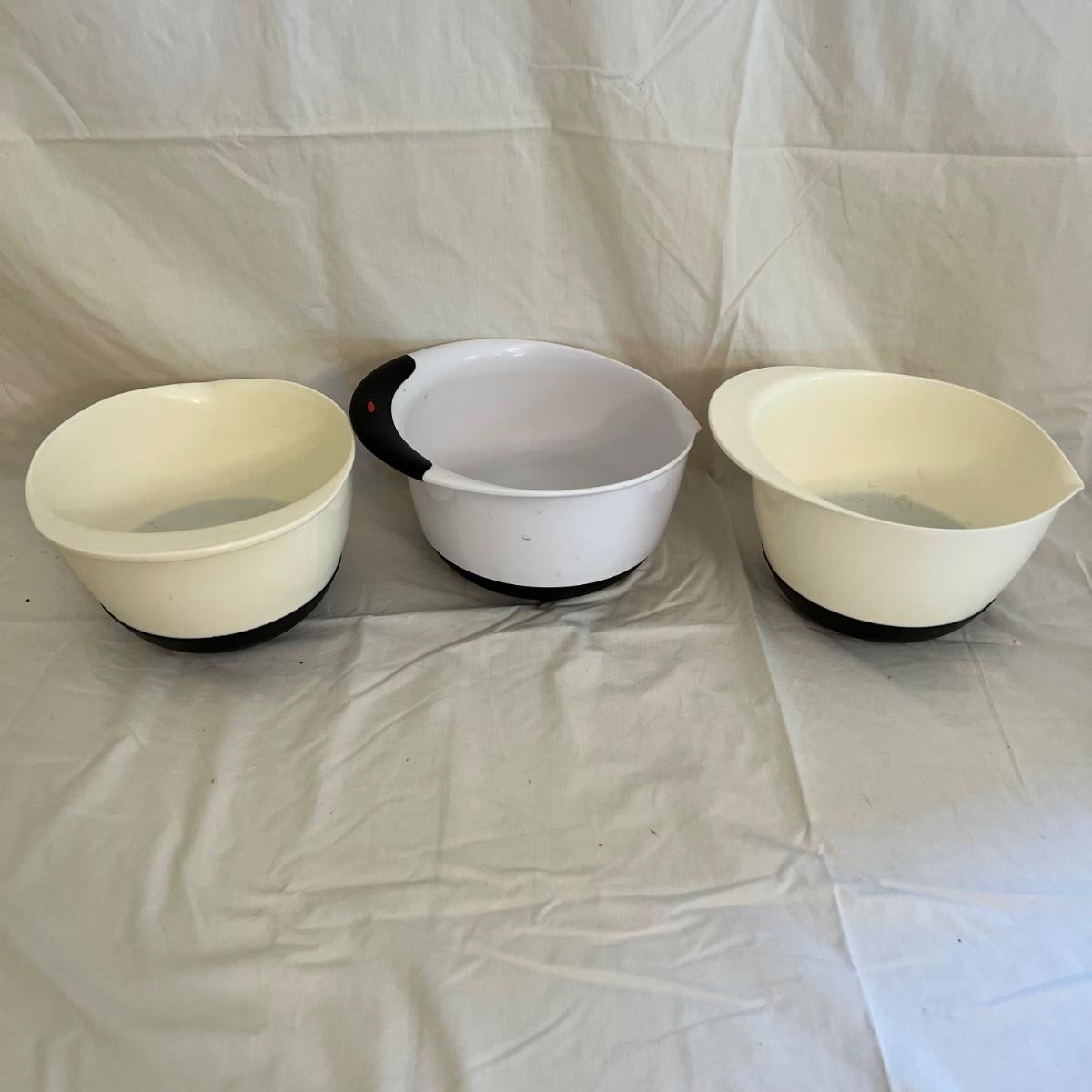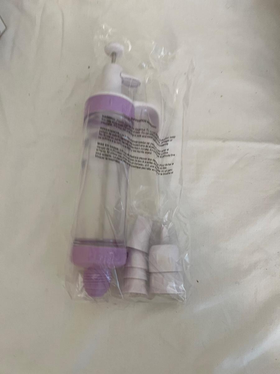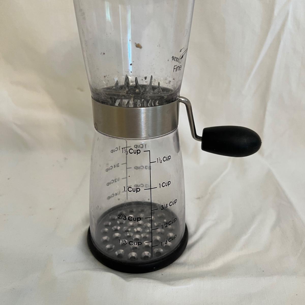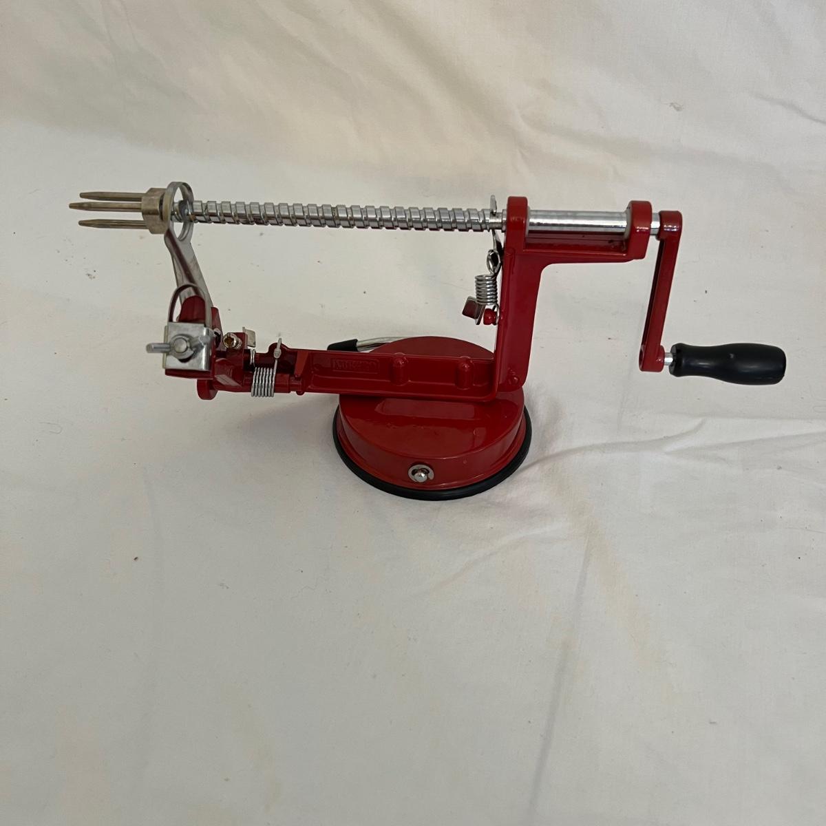 A sizable collection of kitchen necessities. A plastic Bundt cake cover and plate, eight boxes of Reynolds kitchen cooking precut parchment paper sheets, two Pyrex measuring cups, one hand-crank kitchen grinder, a springform pan, a Sunbeam hand mixer, and stainless steel bowl, a spiral cutter that appears to be metal and an egg beater, as well as three loaf pans, two non-stick sheet pans and one lasagna-size baking pan. Also includes a dessert decorating tool as well as three plastic mixing bowls and last but not least two red oven mitts. The electric mixer powered on when plugged in. A few items could use cleaning.