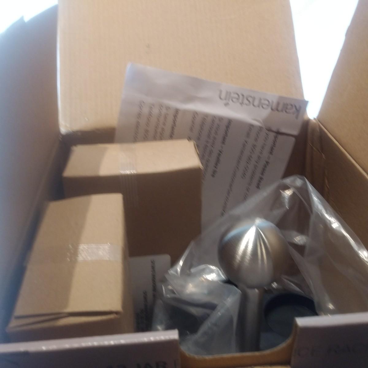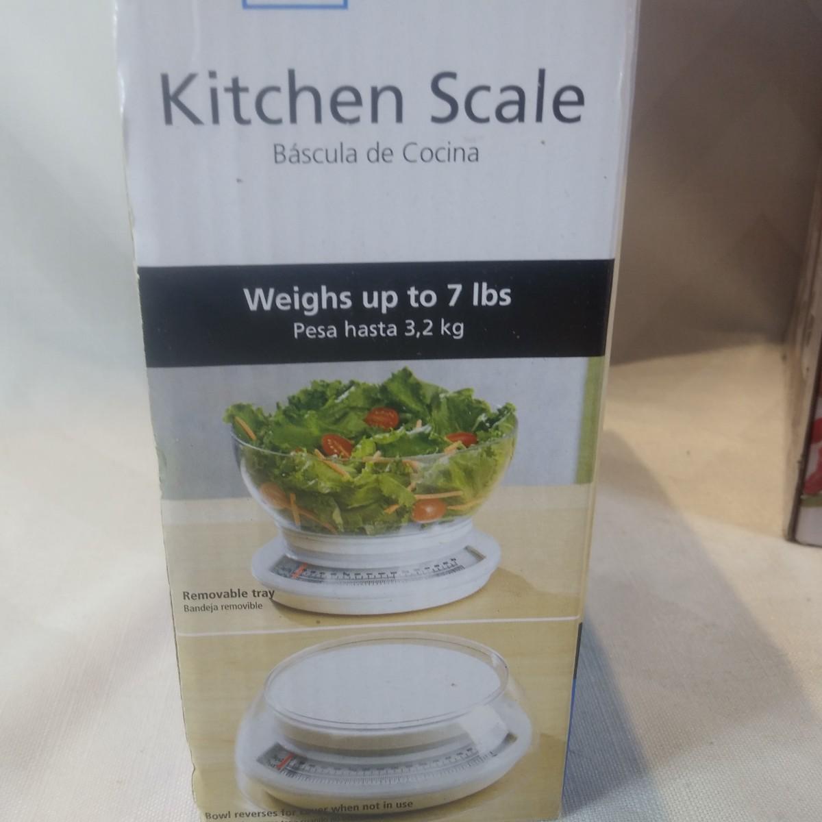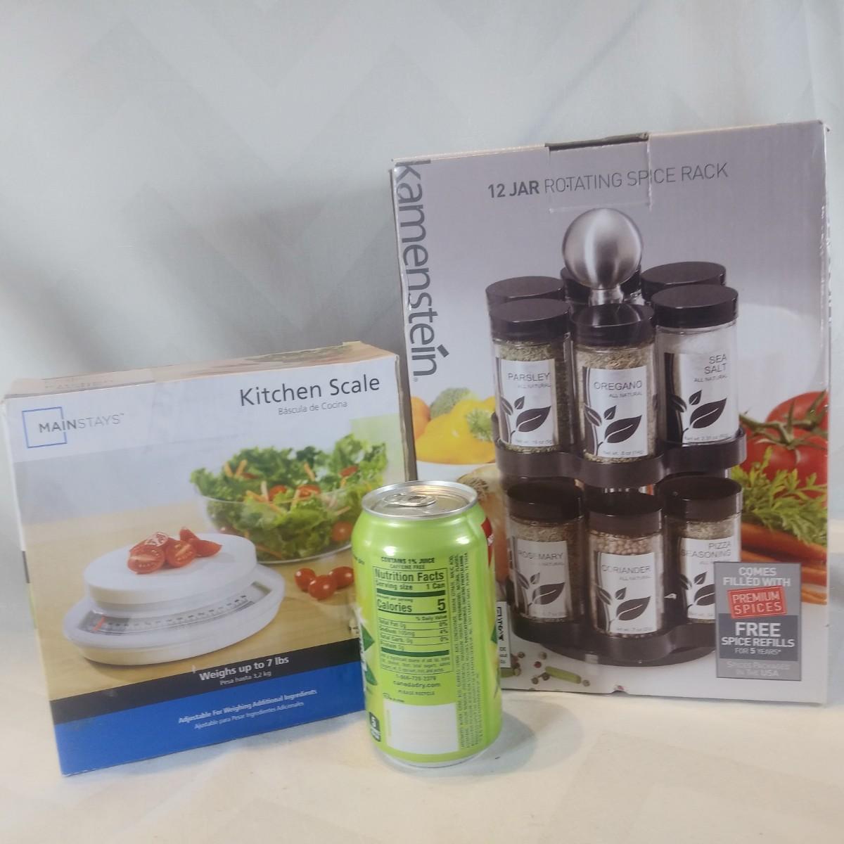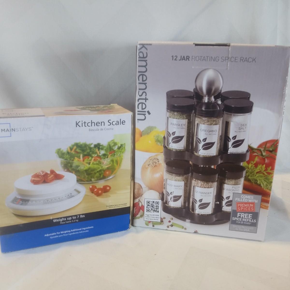 This auction lot is for two Kitchen Essentials. We present you with two new kitchen products. One is a Kitchen Scale that will weigh up to 7 pounds and the other is a 12 Jar Rotating Spice Rack with Spices. Both are new in original boxes. The Spice box is bent up a bit, but the contents look fine.