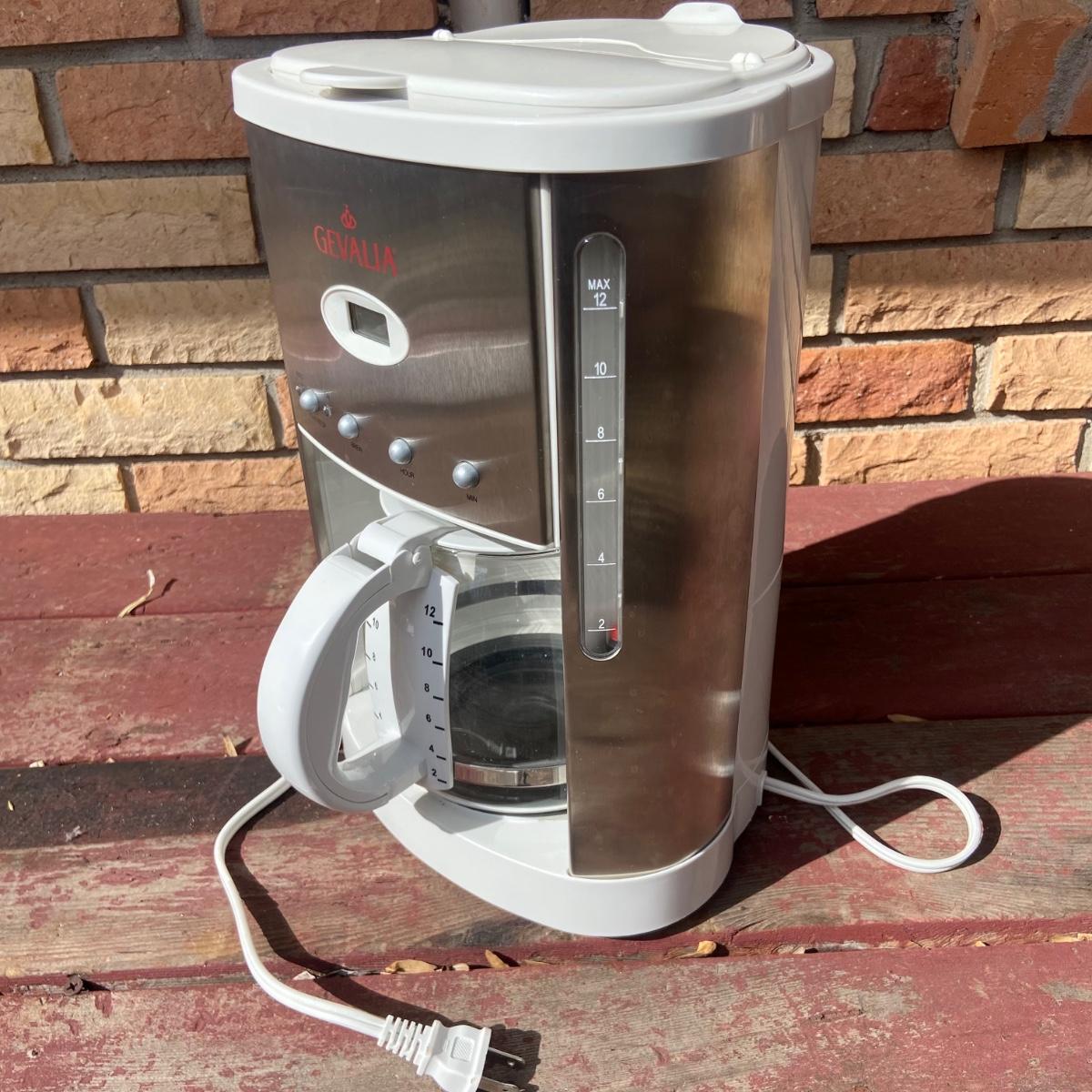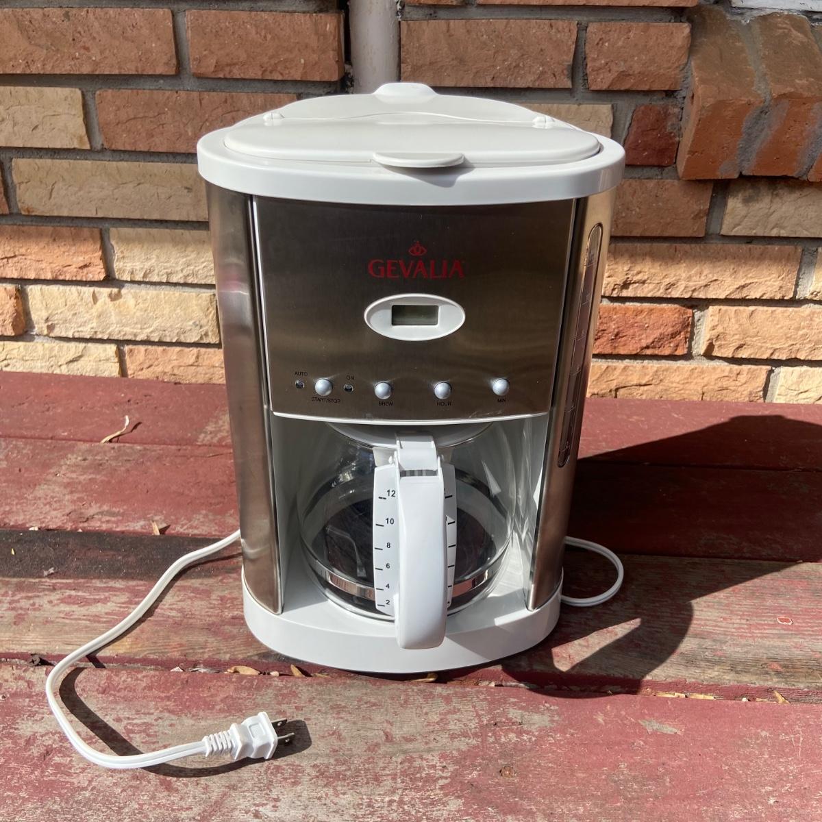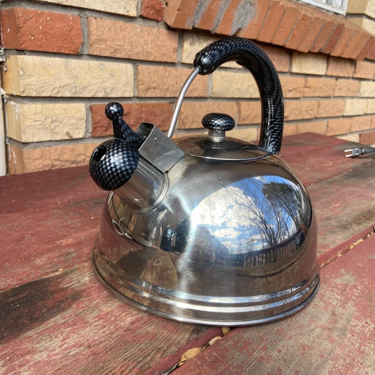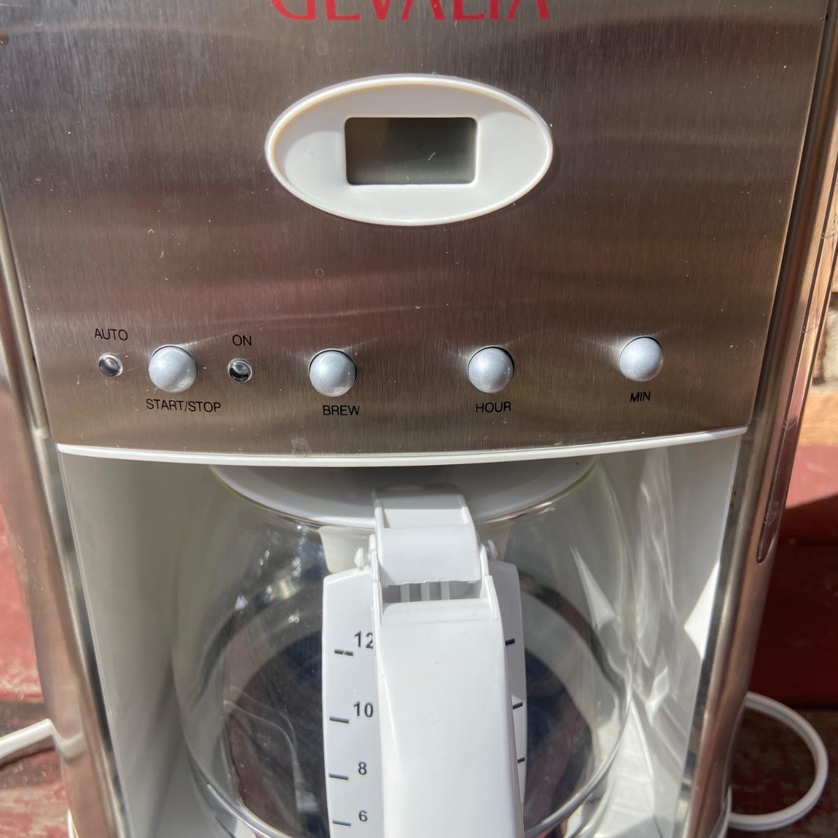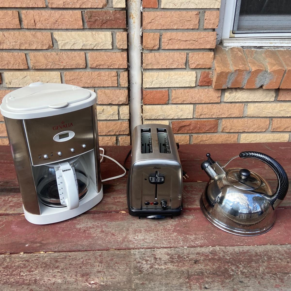 In this lot we have a total of three items. The first is a Gevalia 12 cup programmable coffee maker. It appears to be made of stainless steel and white plastic and has buttons to turn on and off as well as to program it for automatic brewing. It has a removable filter for easy dumping and a gauge on the side to measure how much water is in it. It does turn on. It measures 9.5” x 9” x 14”H. See pictures for model number. Next is a “Creative Home” what appears to be stainless steel whistling tea kettle. It has a fun checkered heat resistant handle and accents. It measures 9”H and has a 8.75”D. It appears to holds 2.7 quarts. Lastly is a Oster two-slice toaster. It has a crumb catcher drawer and an adjustable toast shade setting as well as a “frozen” and “cancel” button. It measures 7.25” x 11” x 8”H and appears to be made of stainless steel and plastic. It does power on. See pictures for model number.