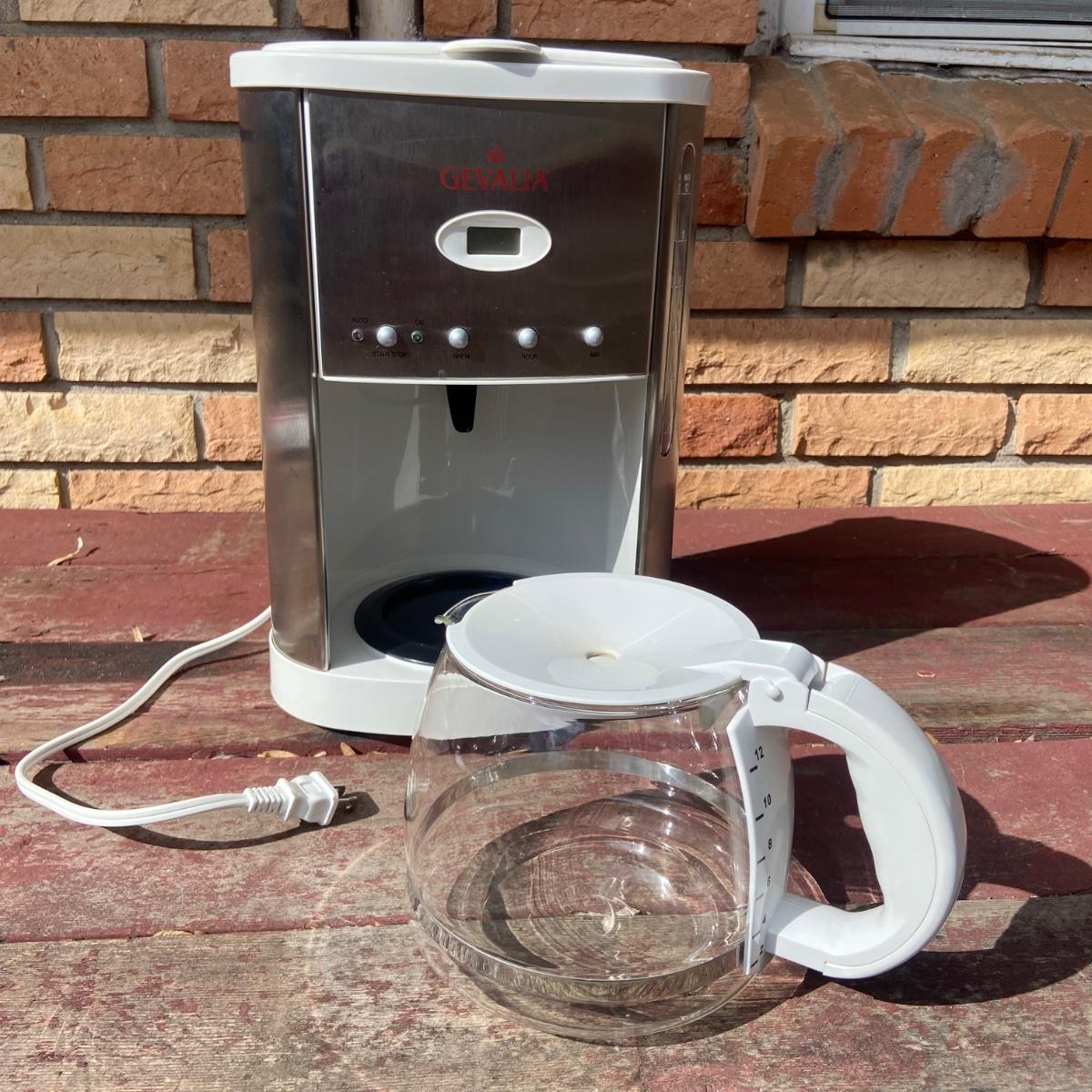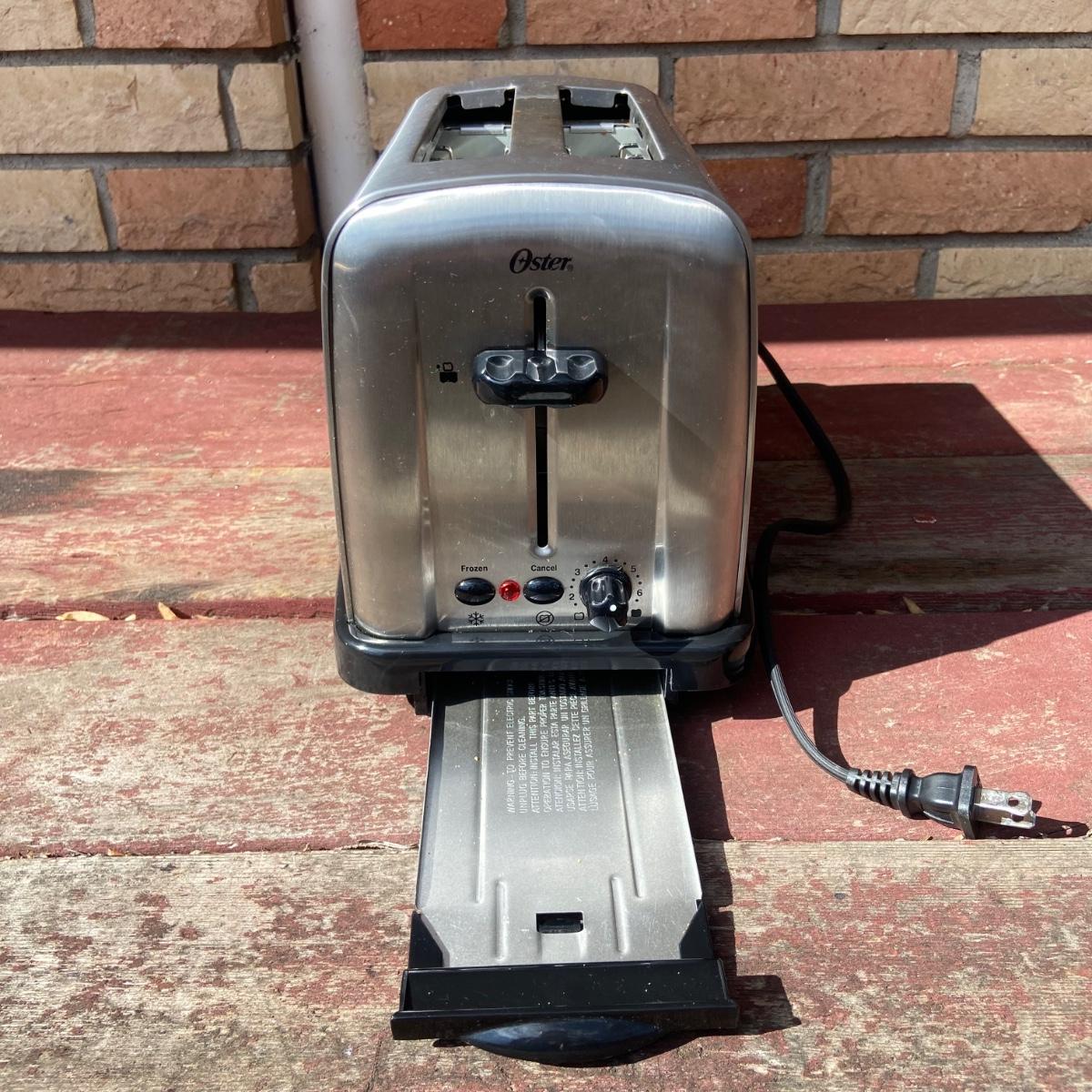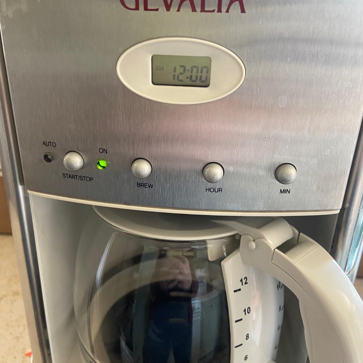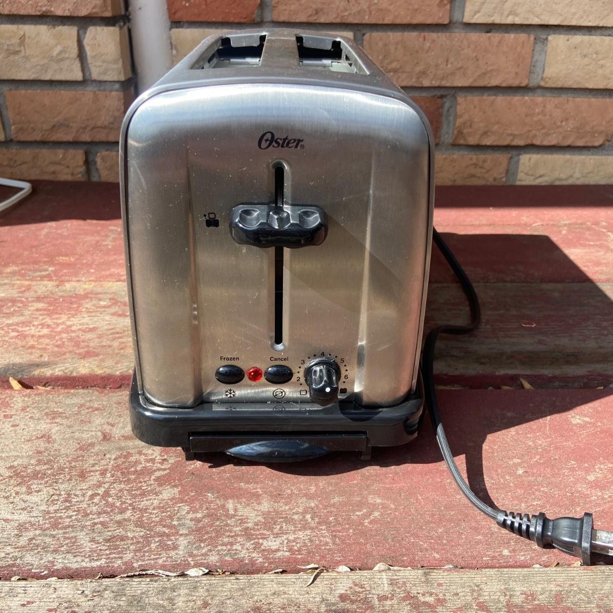 In this lot we have a total of three items. The first is a Gevalia 12 cup programmable coffee maker. It appears to be made of stainless steel and white plastic and has buttons to turn on and off as well as to program it for automatic brewing. It has a removable filter for easy dumping and a gauge on the side to measure how much water is in it. It does turn on. It measures 9.5” x 9” x 14”H. See pictures for model number. Next is a “Creative Home” what appears to be stainless steel whistling tea kettle. It has a fun checkered heat resistant handle and accents. It measures 9”H and has a 8.75”D. It appears to holds 2.7 quarts. Lastly is a Oster two-slice toaster. It has a crumb catcher drawer and an adjustable toast shade setting as well as a “frozen” and “cancel” button. It measures 7.25” x 11” x 8”H and appears to be made of stainless steel and plastic. It does power on. See pictures for model number.