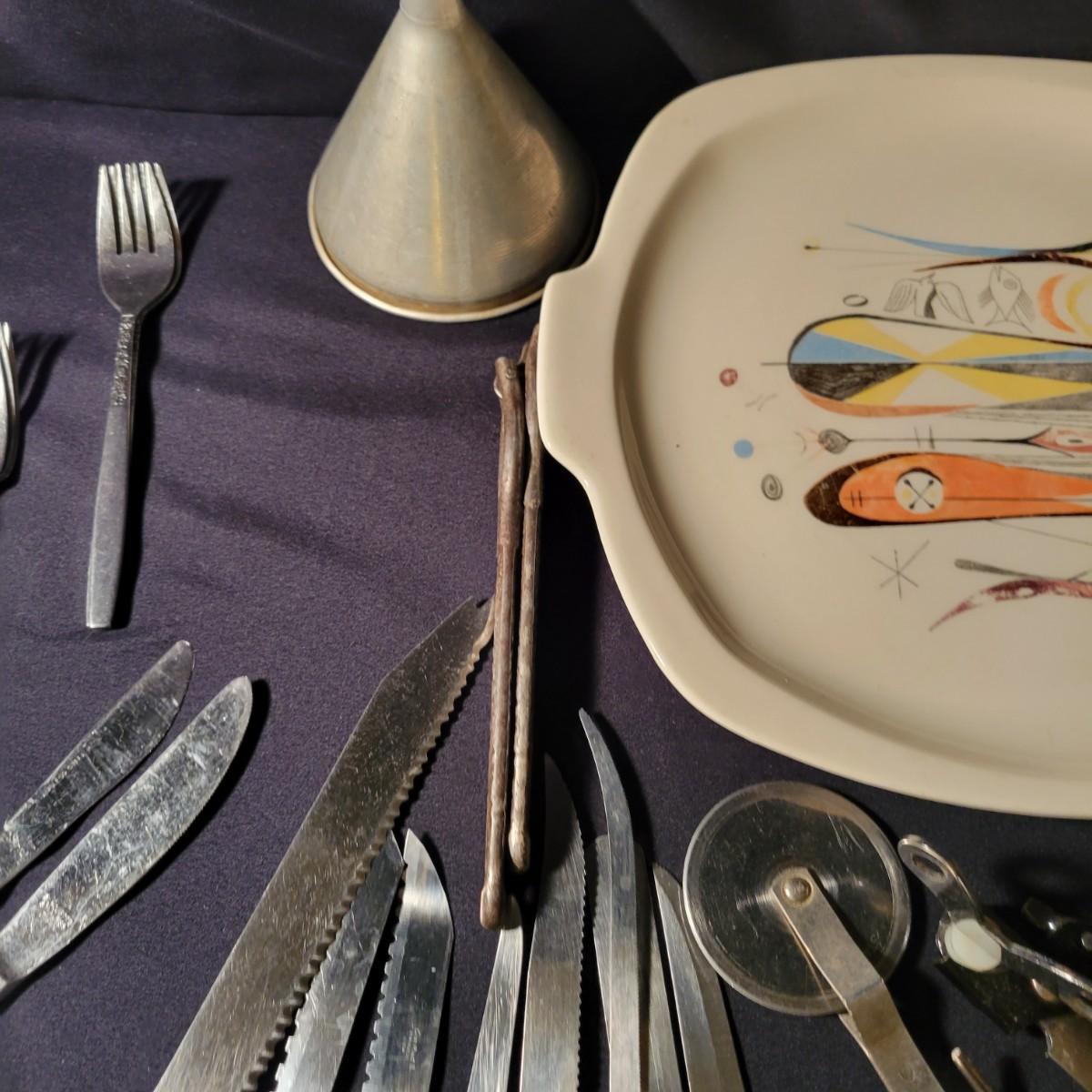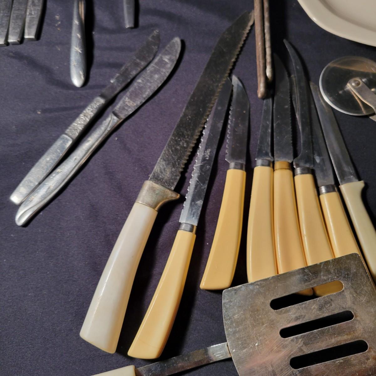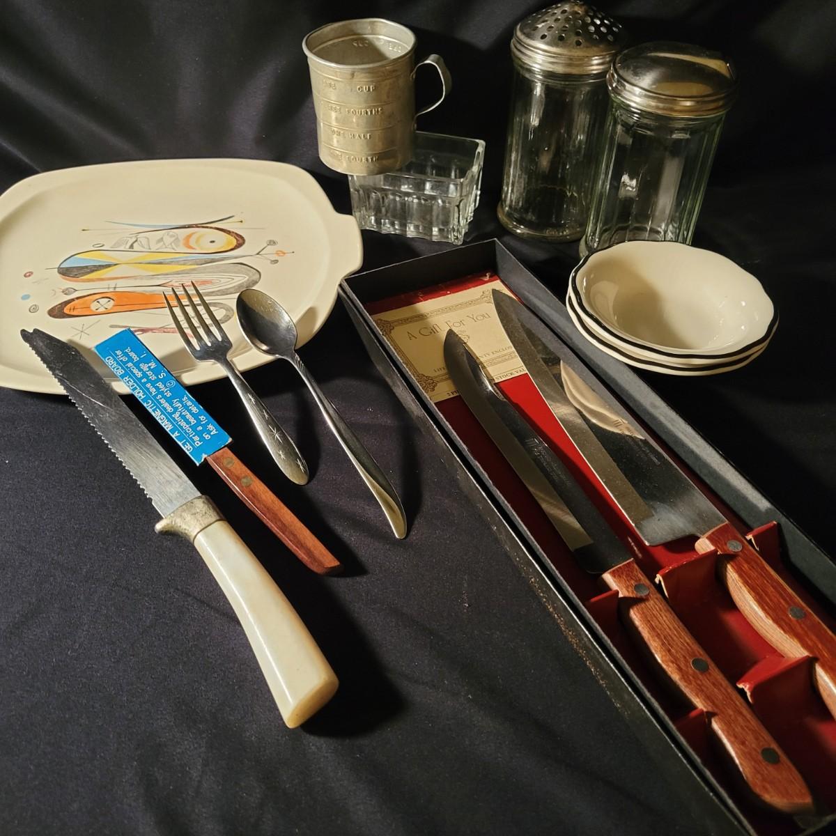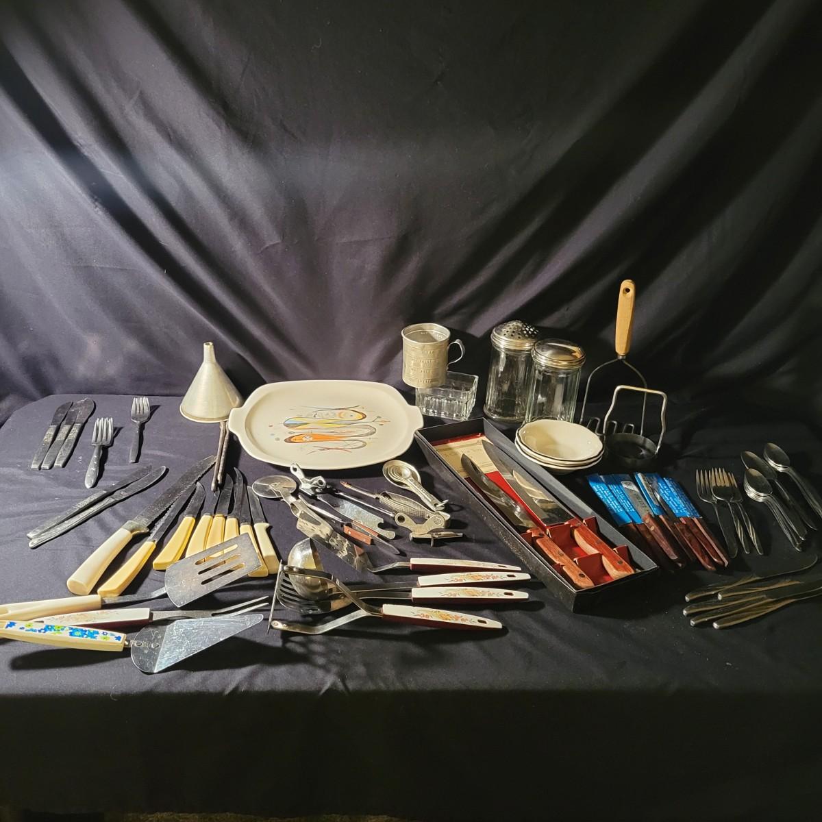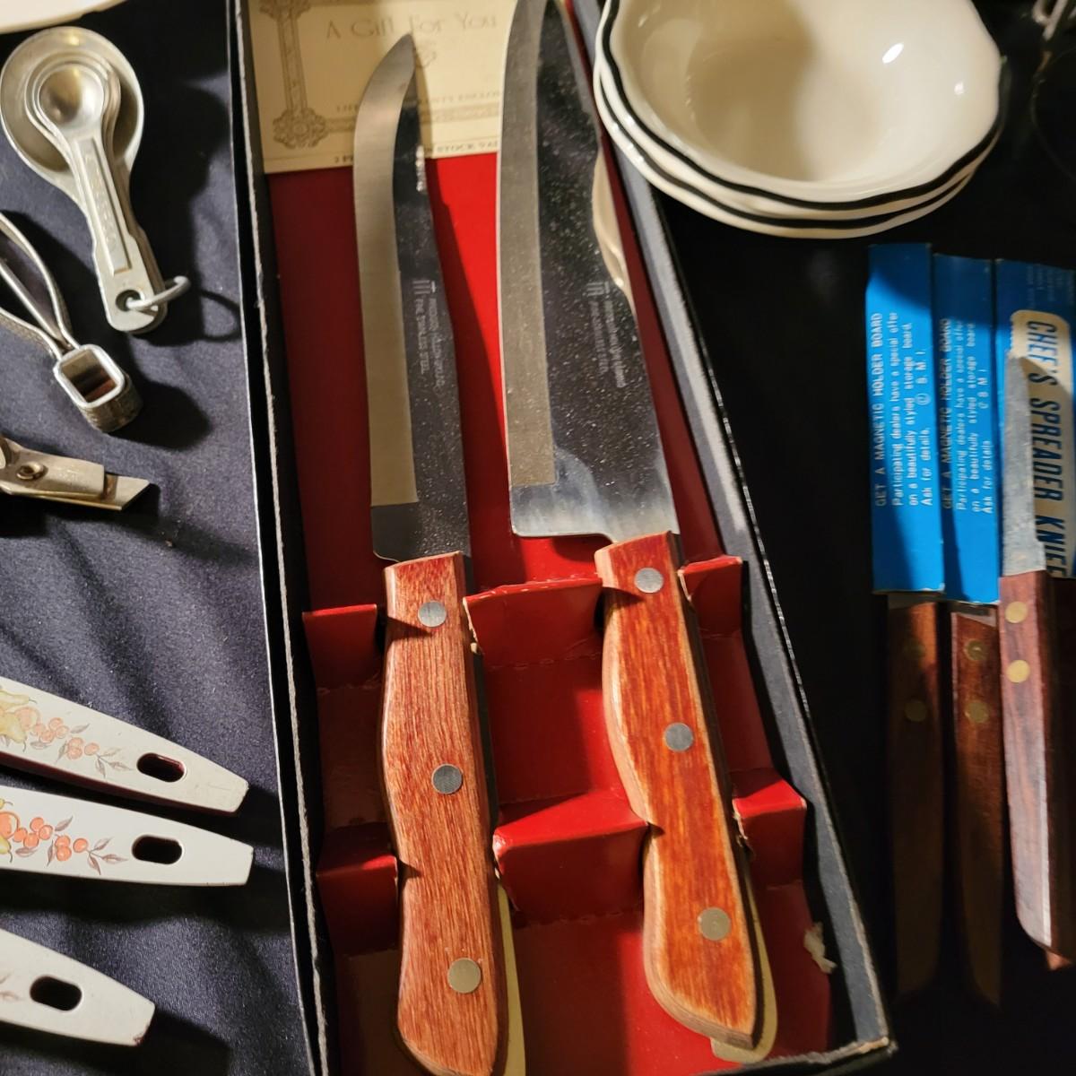 A large variety knives, flatware, utensils, ceramic and more in good condition. There's a little bit of everything for the kitchen in this lot. Potato masher, cookie cutter, sugar and cheese jar and so much more. This would be a great lot for someone outfitting a kitchen. Boxed knives are manufactured by Maxam. Shipping available