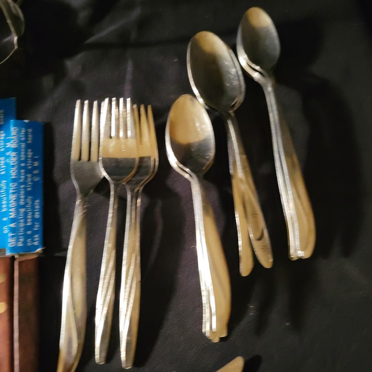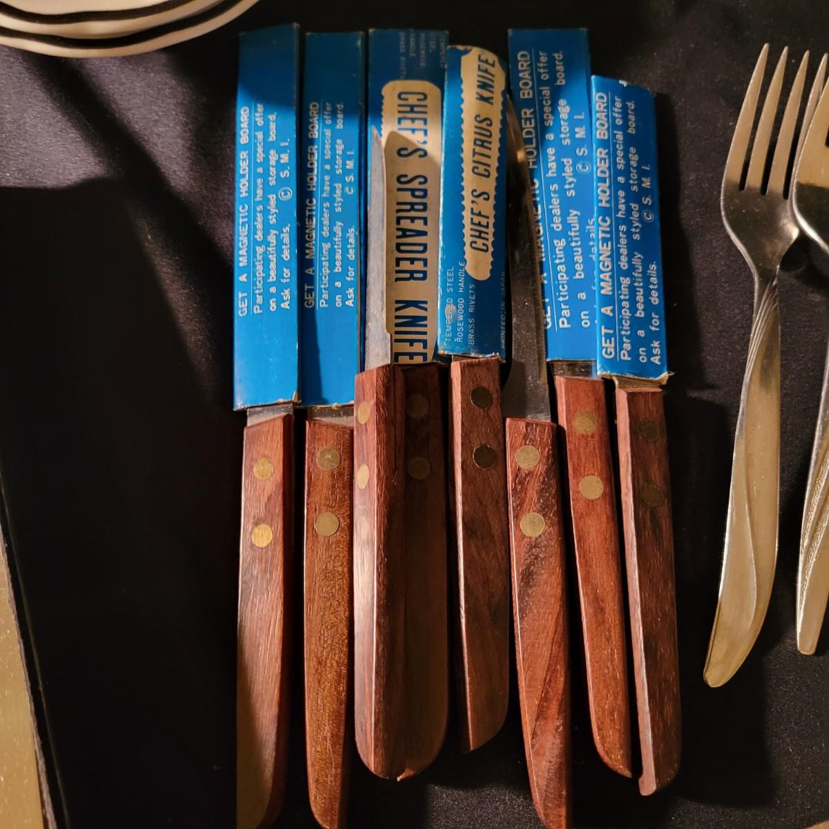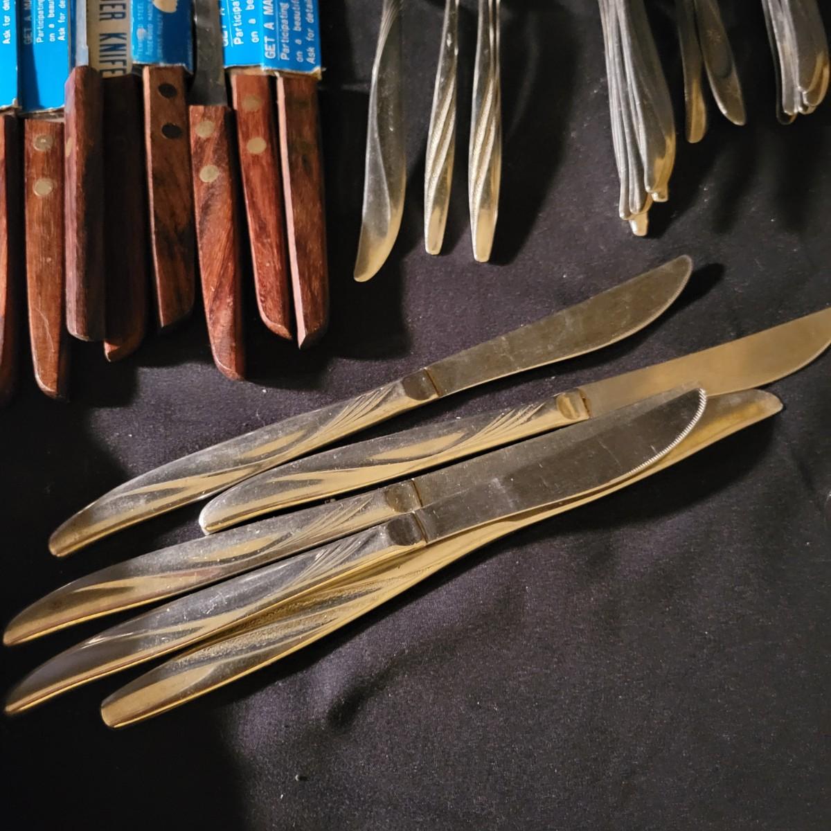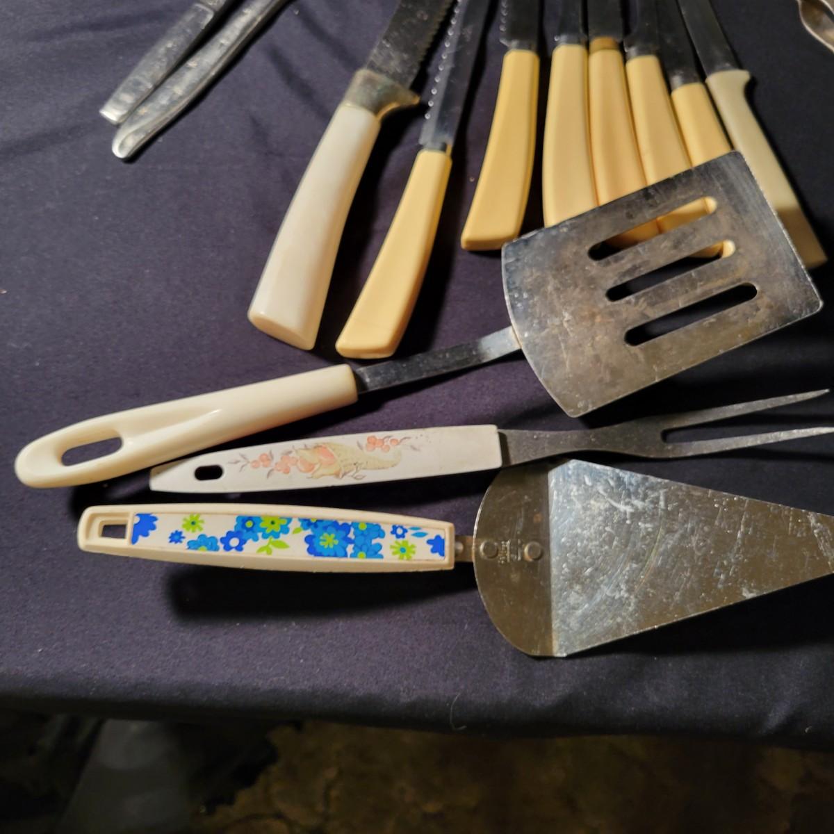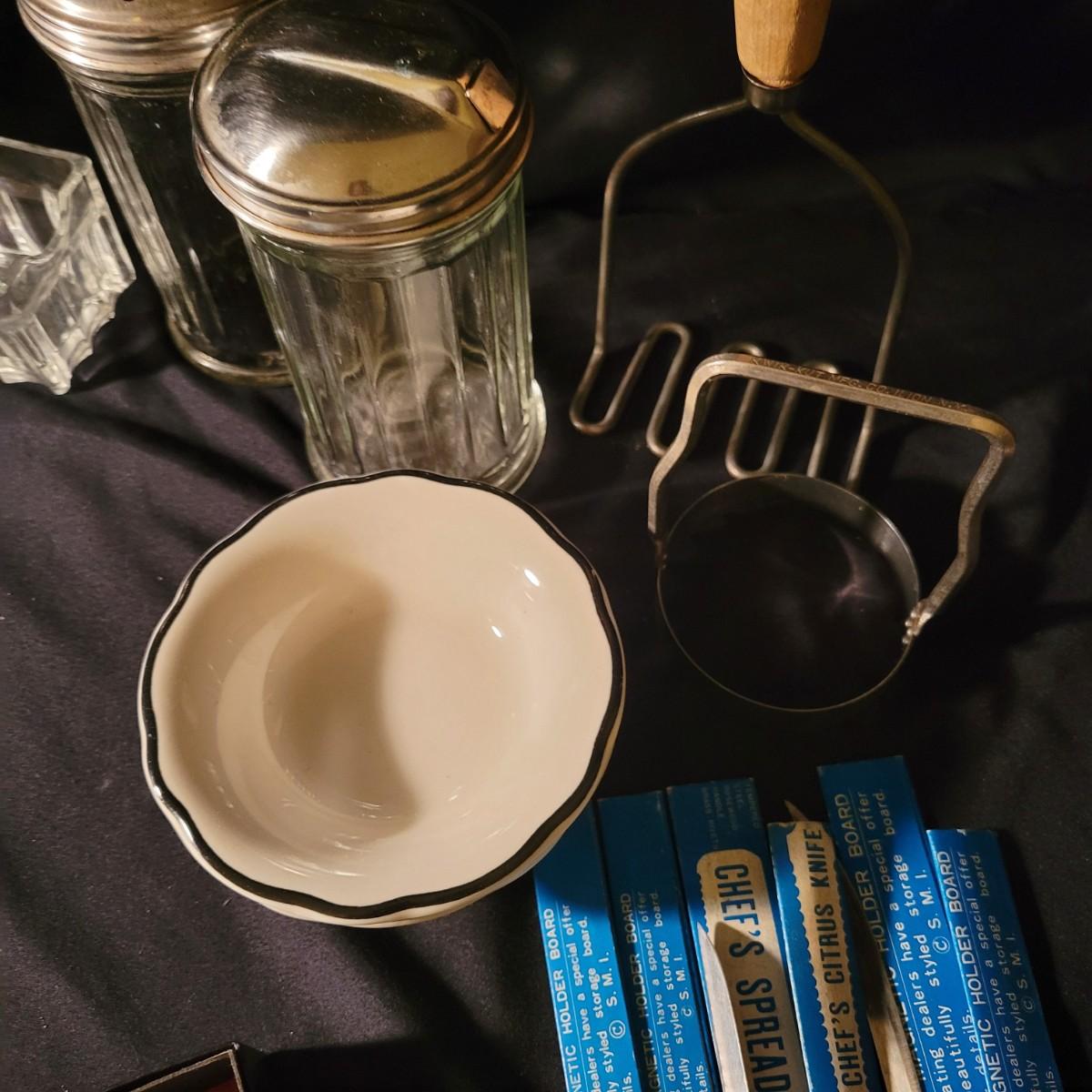 A large variety knives, flatware, utensils, ceramic and more in good condition. There's a little bit of everything for the kitchen in this lot. Potato masher, cookie cutter, sugar and cheese jar and so much more. This would be a great lot for someone outfitting a kitchen. Boxed knives are manufactured by Maxam. Shipping available