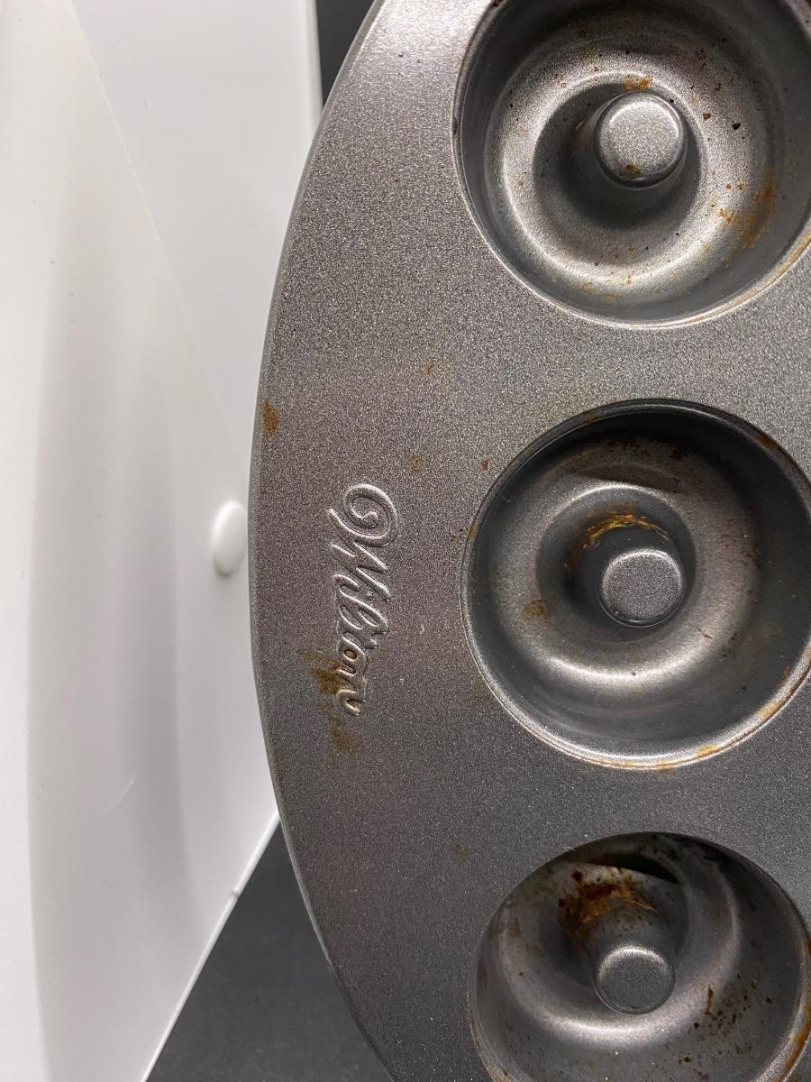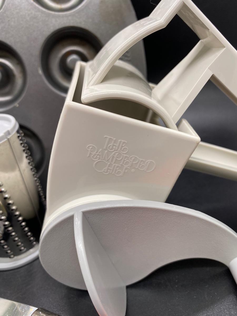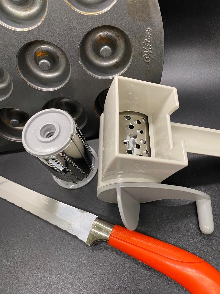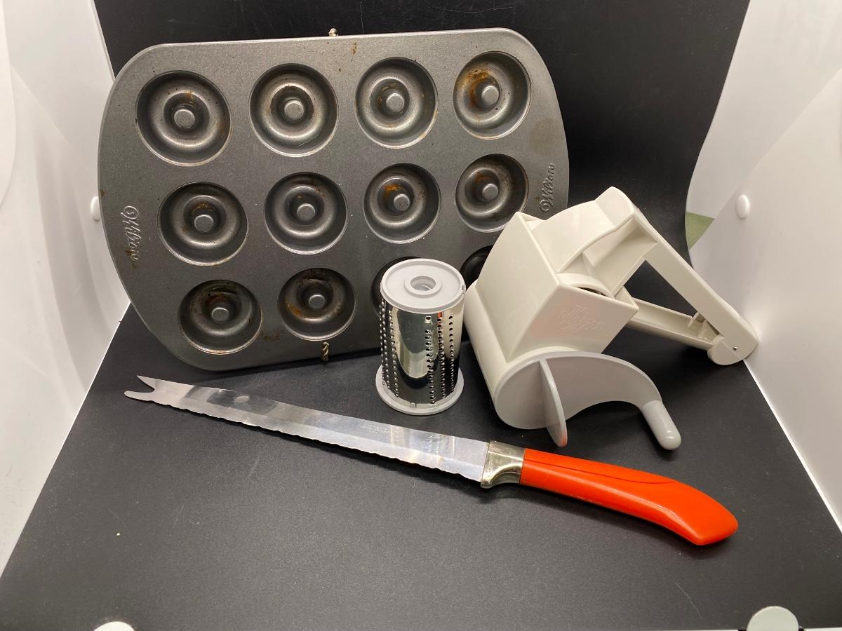 Kitchen item gadget lot. Small donut pan, handheld grater and a vintage bread knife. All in good previously owned condition.