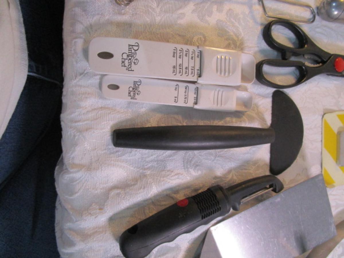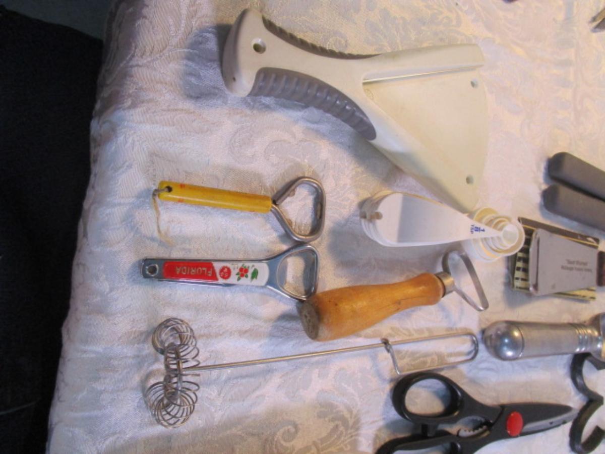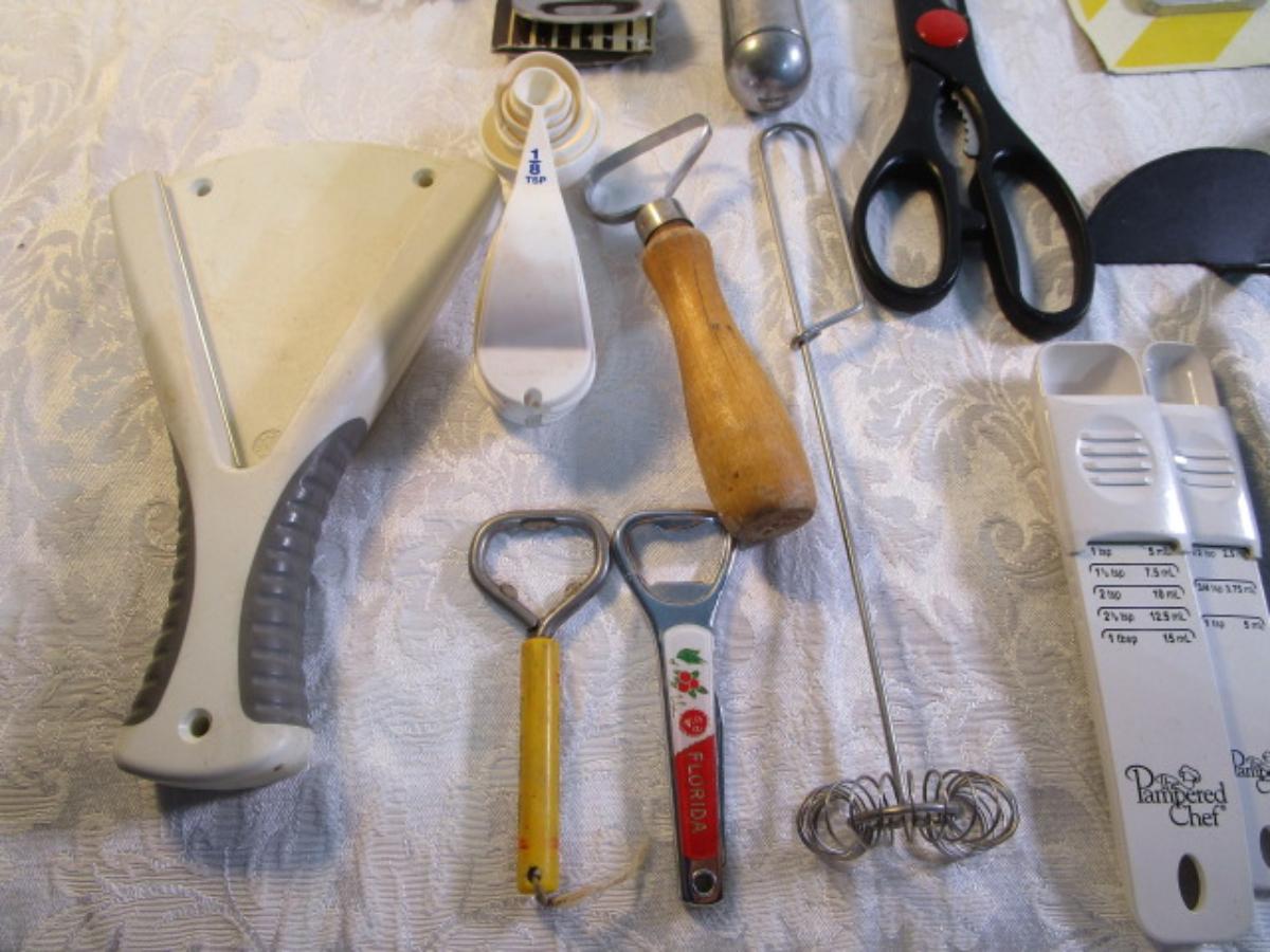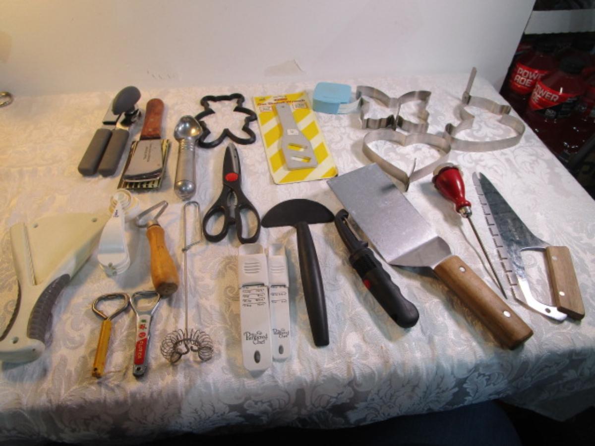 adjustable measuring spoon, spatulasr, measuring spoons, whip, jar openers, pancake forms, can opener, kitchen scissors, peeler, ice cream scoops, ice pick, bottle openers, gas line wrench, tupperware labels, knife, bear trive