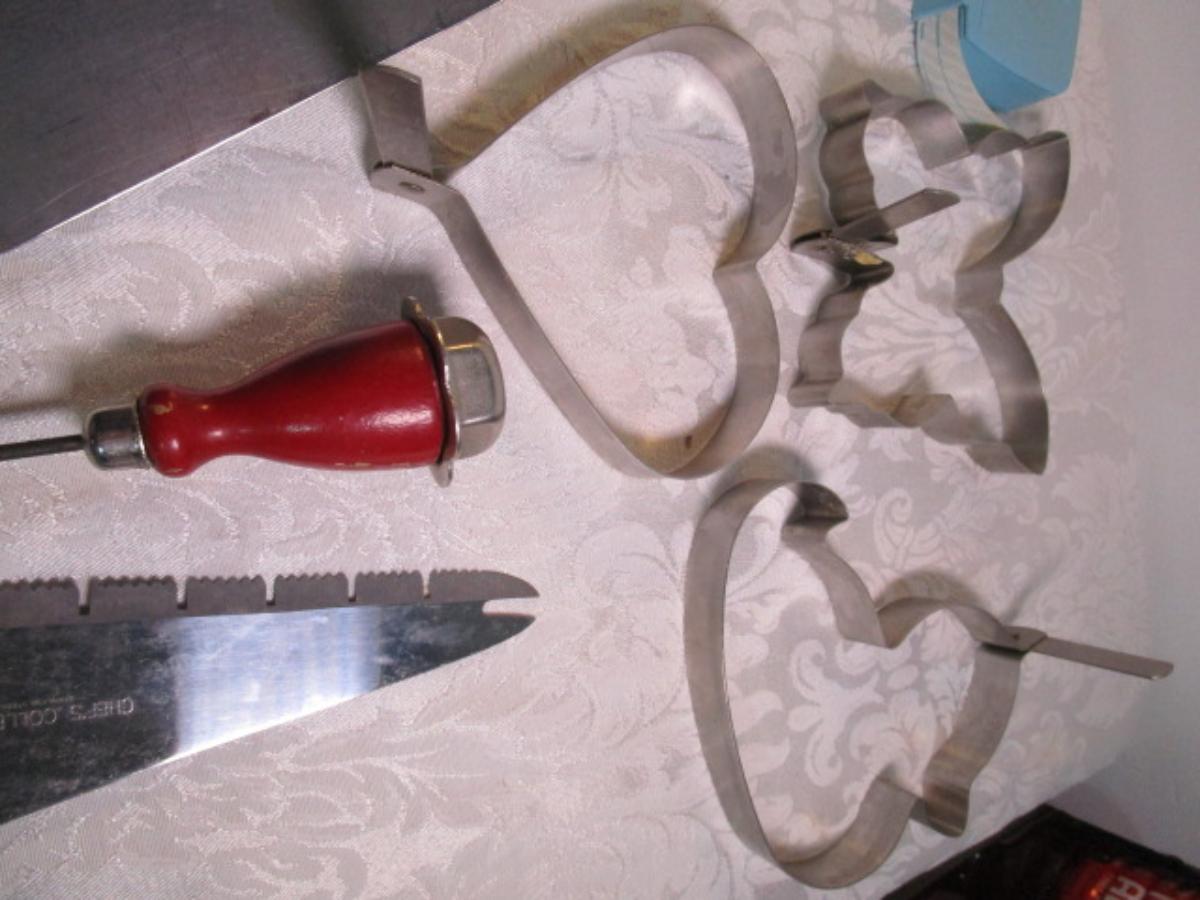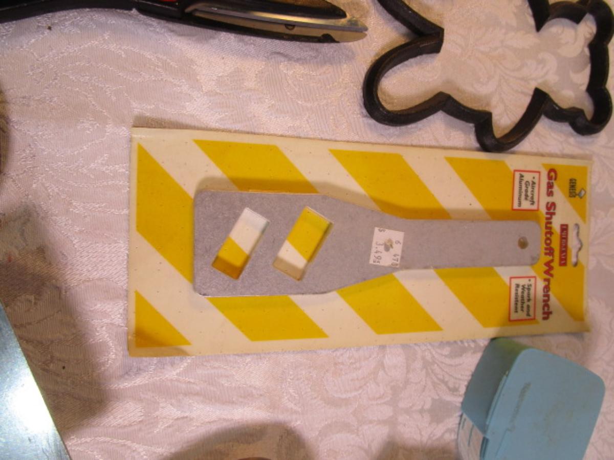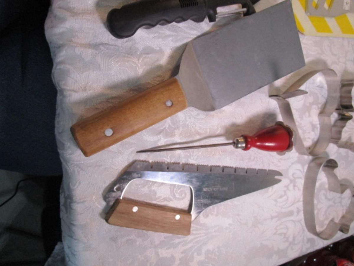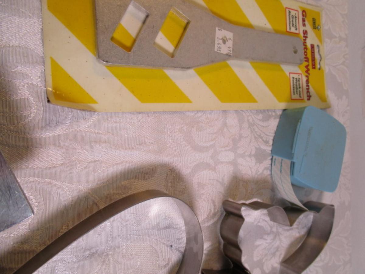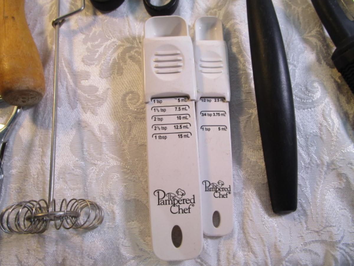 adjustable measuring spoon, spatulasr, measuring spoons, whip, jar openers, pancake forms, can opener, kitchen scissors, peeler, ice cream scoops, ice pick, bottle openers, gas line wrench, tupperware labels, knife, bear trive