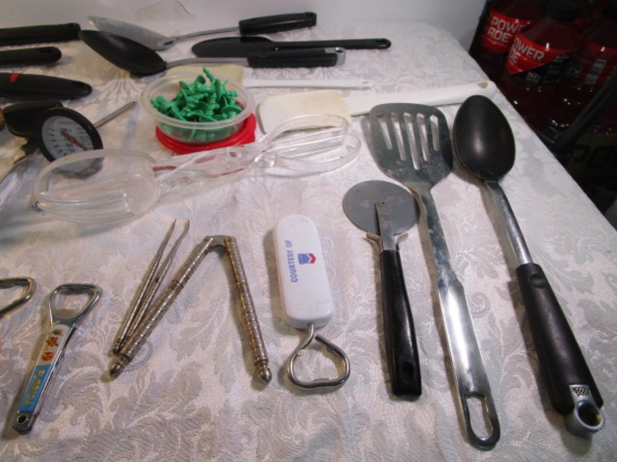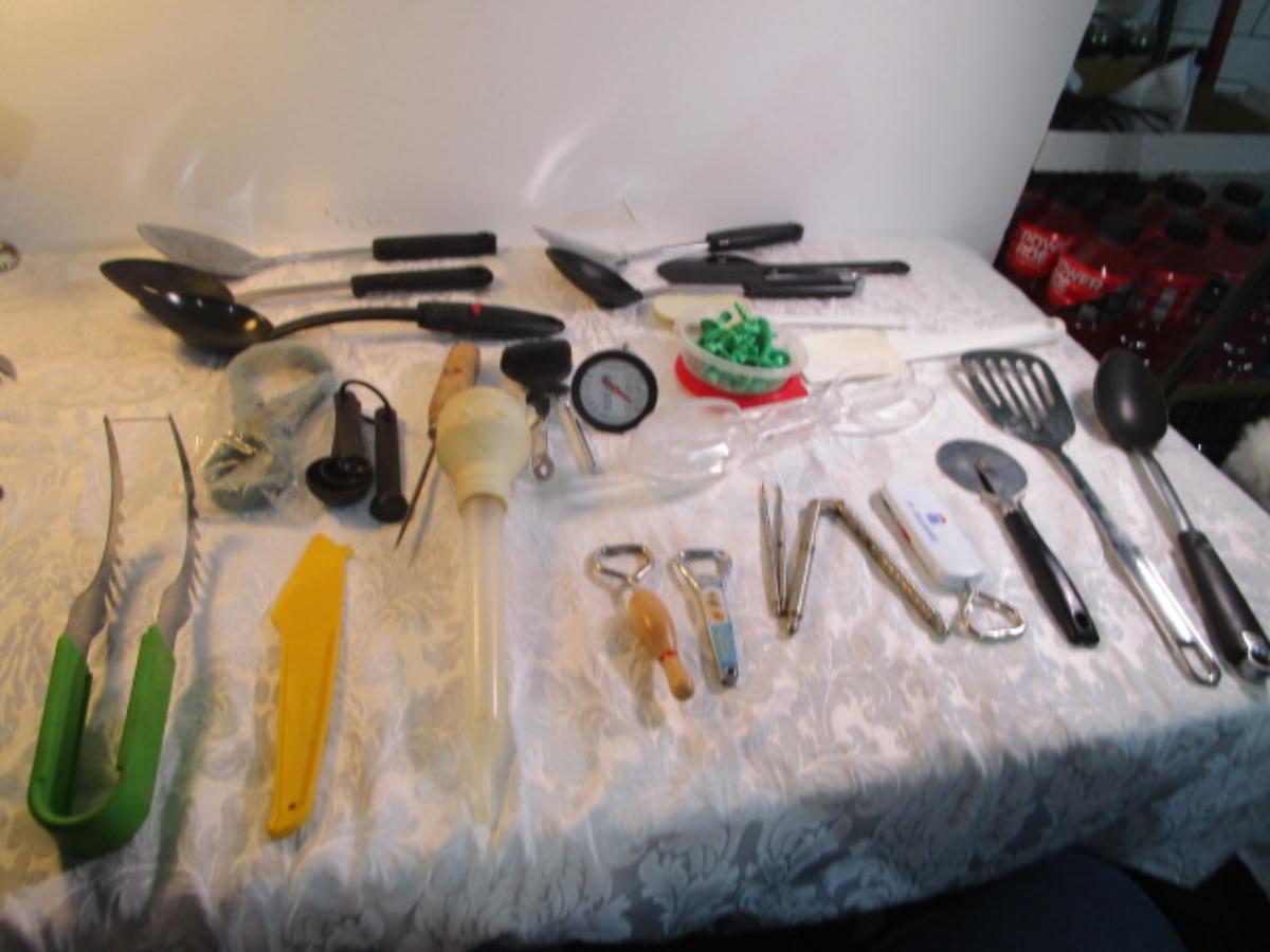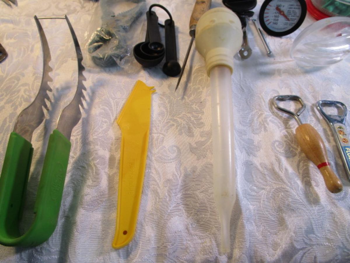Corn cob holders, new meat thermometer, pizza cutter, can opener, measuring spoons, nut cracker & picks, baster, spatula, 6 serving spoons, tongs, ladle, bottle openers, ice pick, bottle opener, watermelon slicer, tupperware cleaner, rubber spatulas