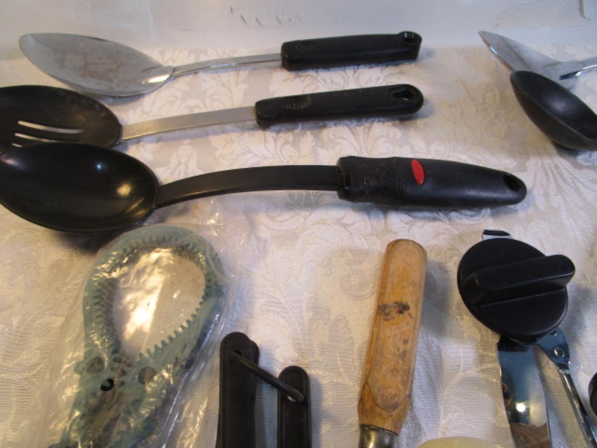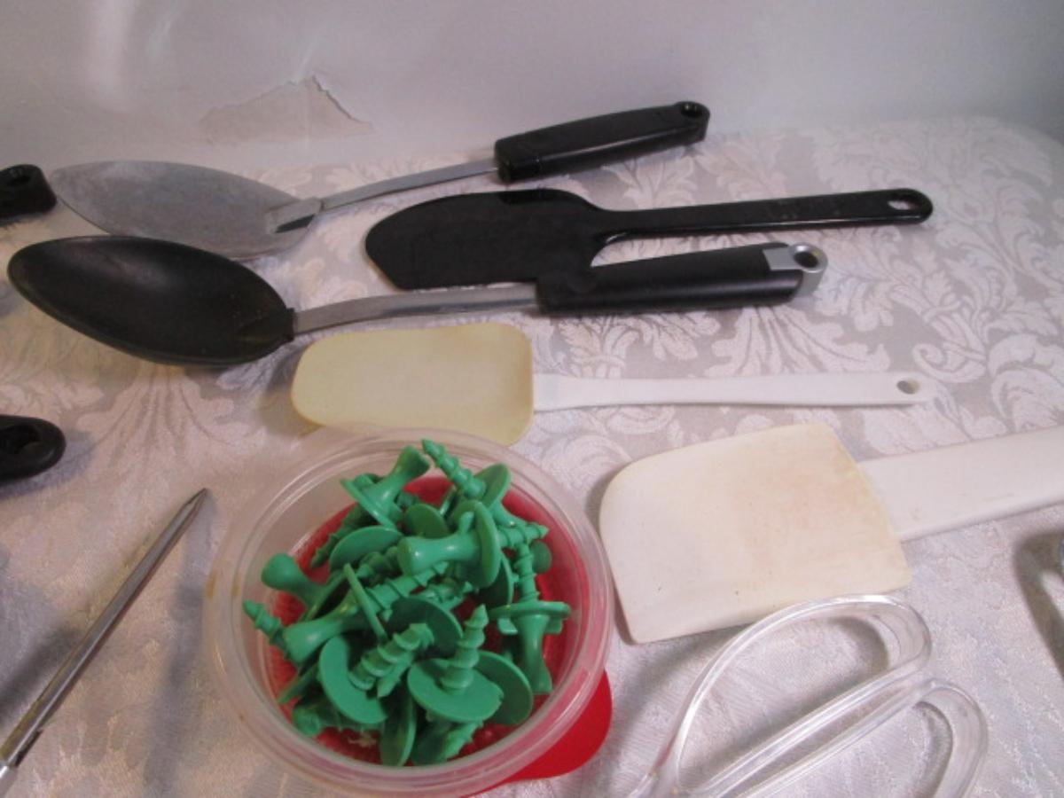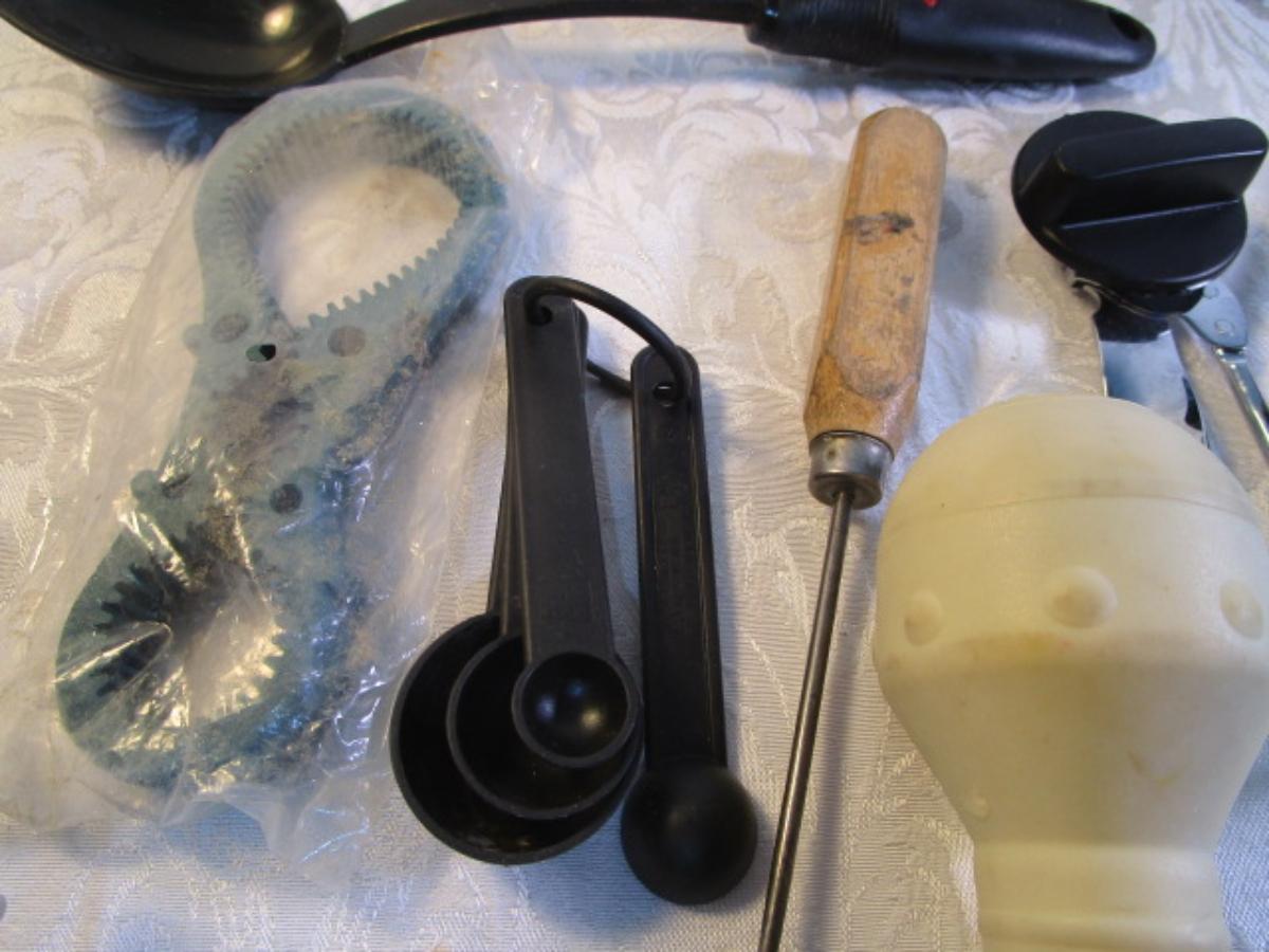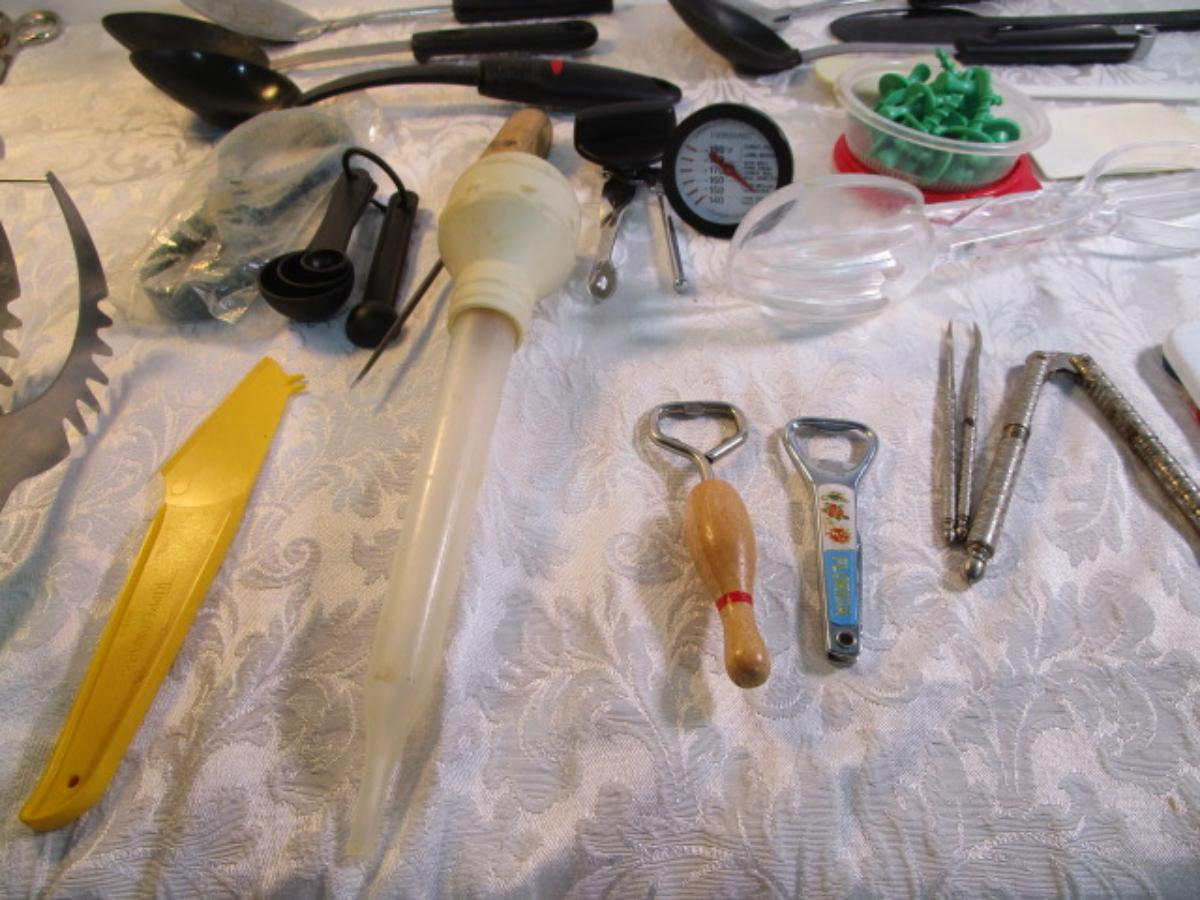 Corn cob holders, new meat thermometer, pizza cutter, can opener, measuring spoons, nut cracker & picks, baster, spatula, 6 serving spoons, tongs, ladle, bottle openers, ice pick, bottle opener, watermelon slicer, tupperware cleaner, rubber spatulas