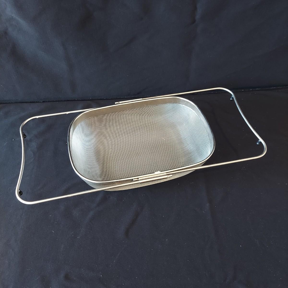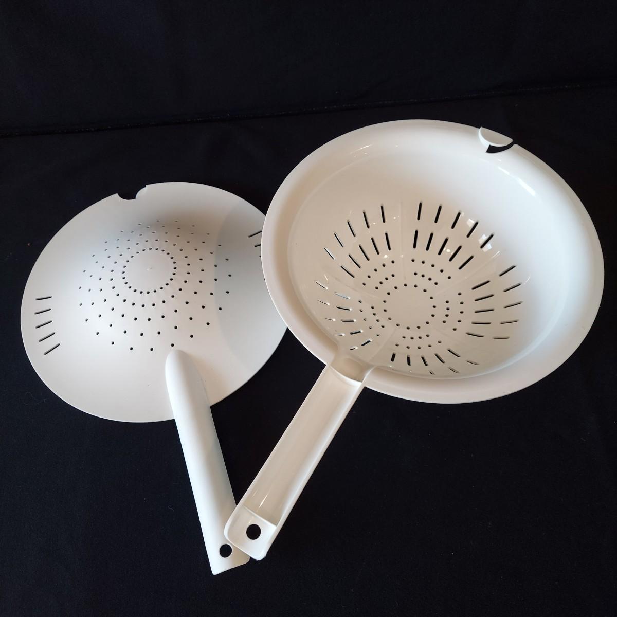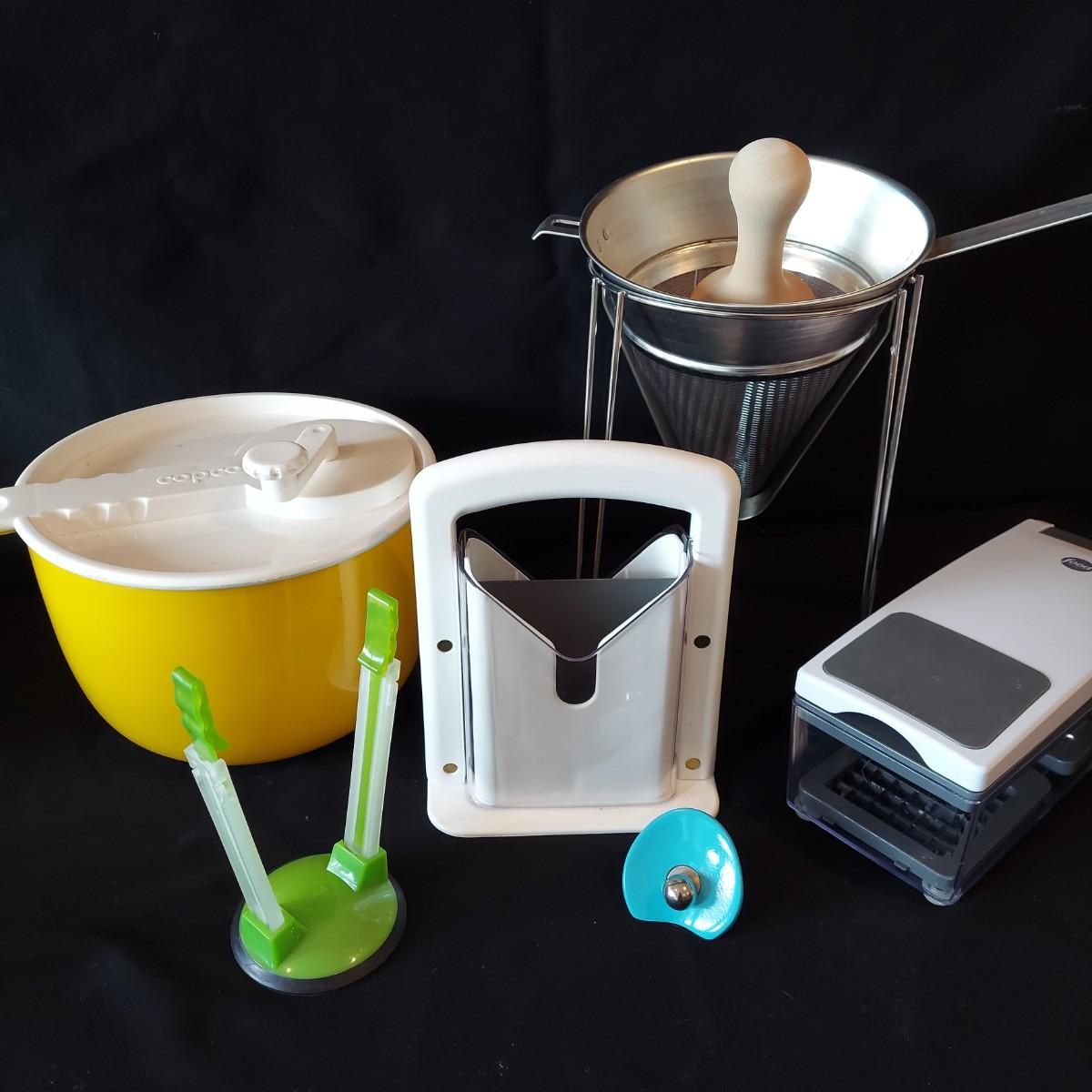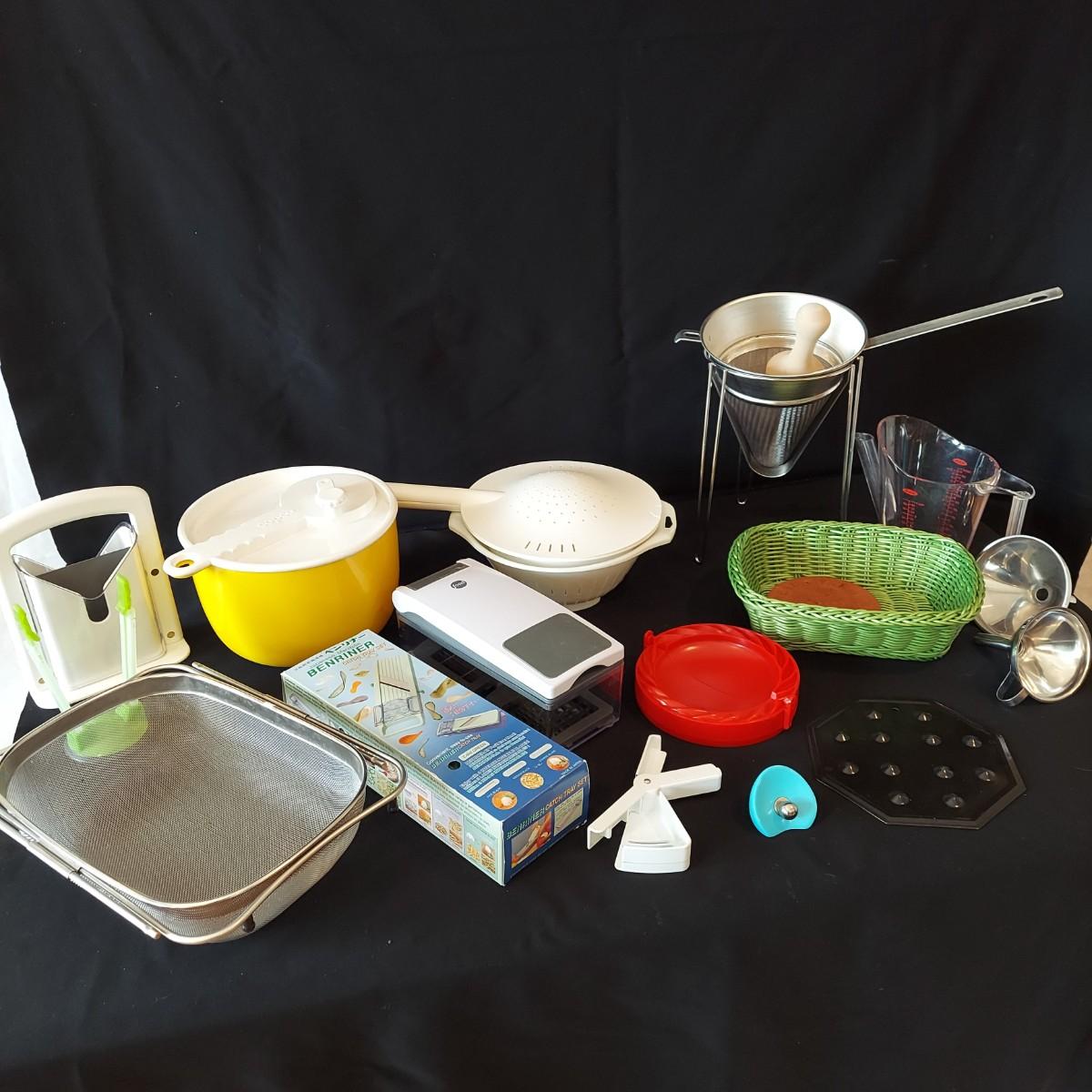 Bagel slicer, salad spinner, vegetable slicer, funnels, measuring cup, turnover press, simmer plate, basket with clay bread warmer, mandolin slicer, cheese grater, zip top bag holder, a recipe card holder and three types of strainers. The canning strainer is 12"H. Shipping available
