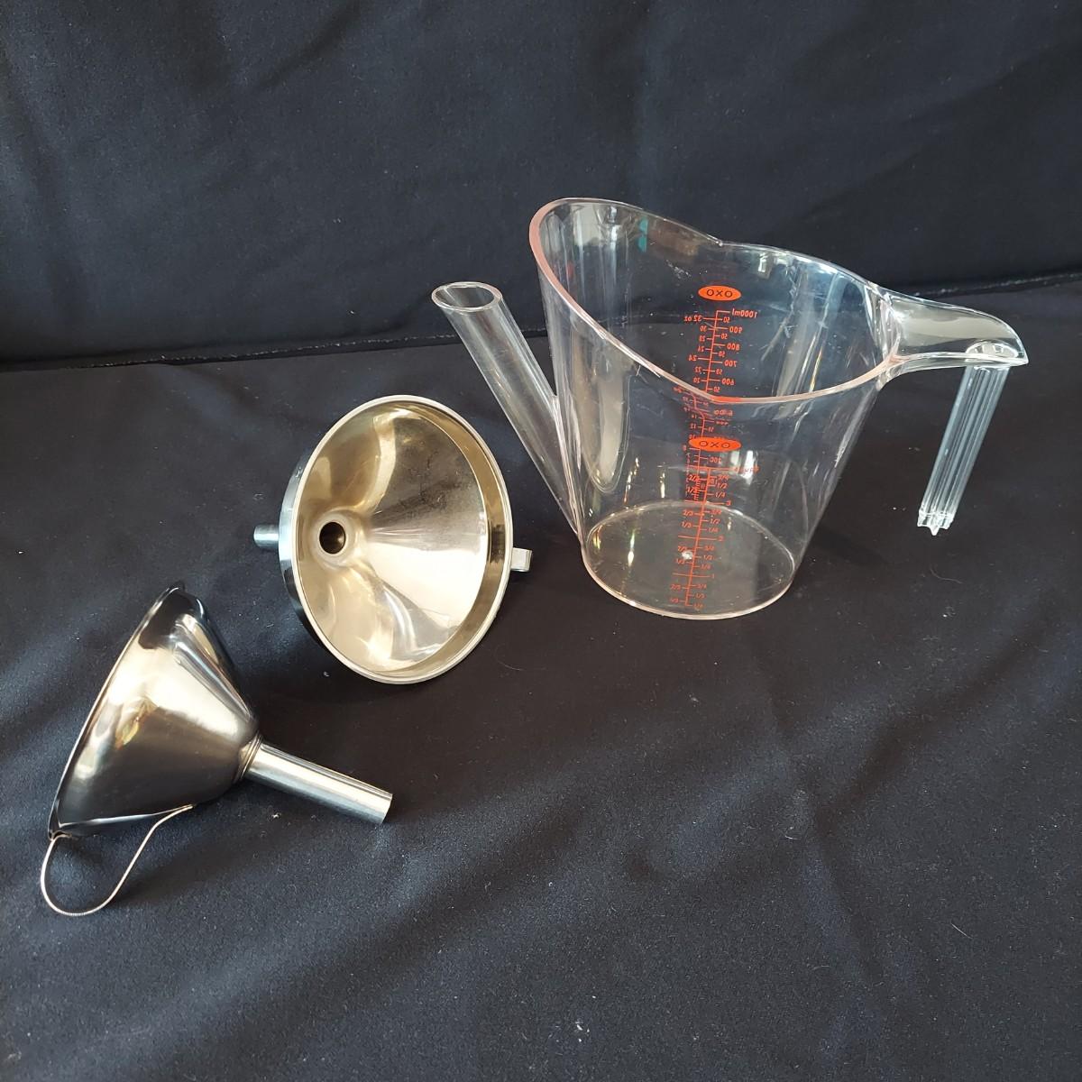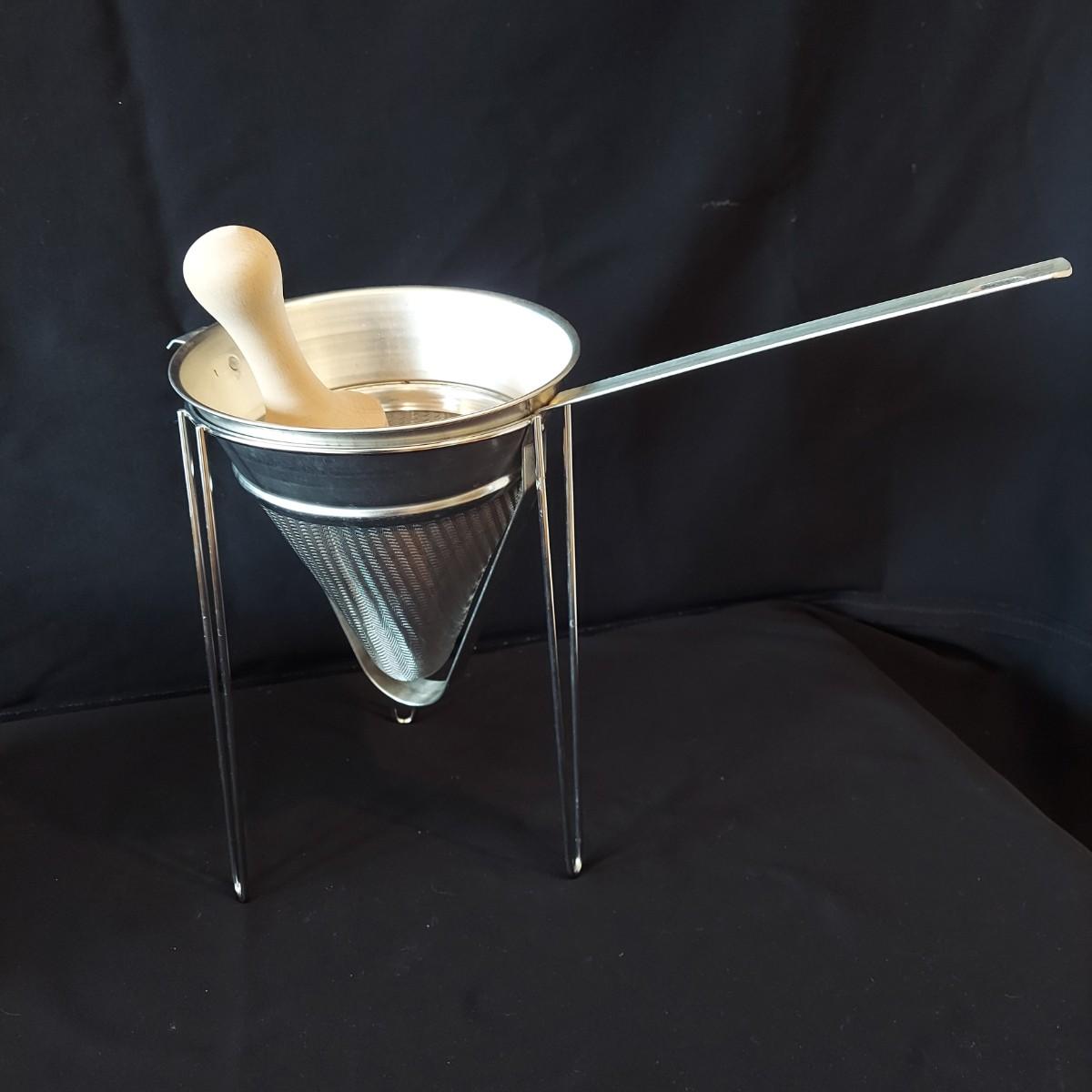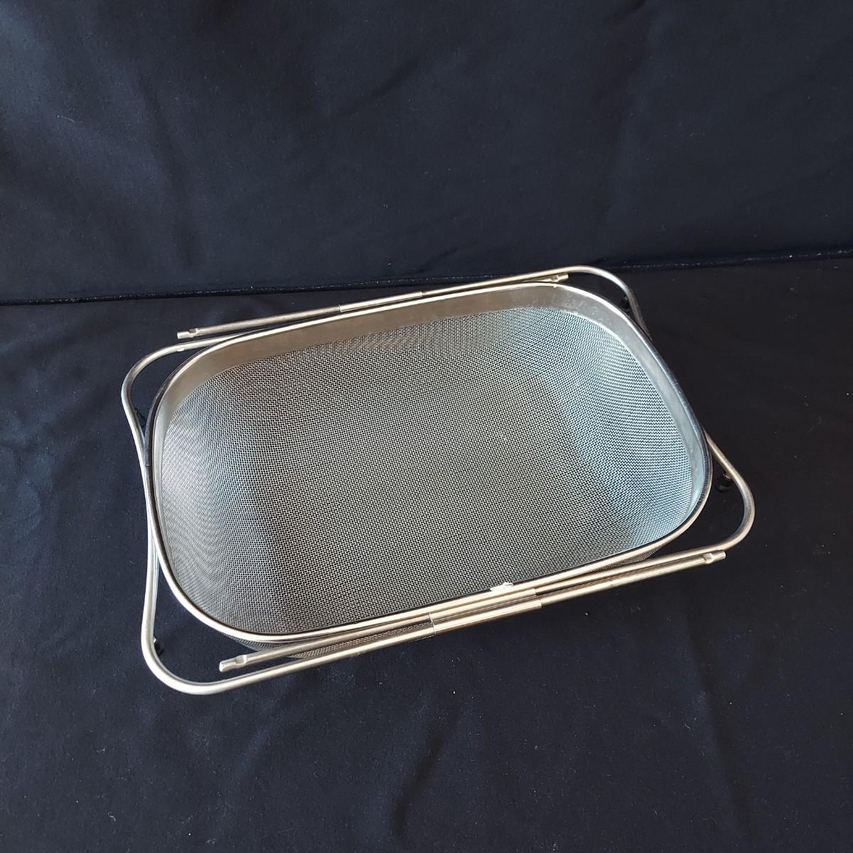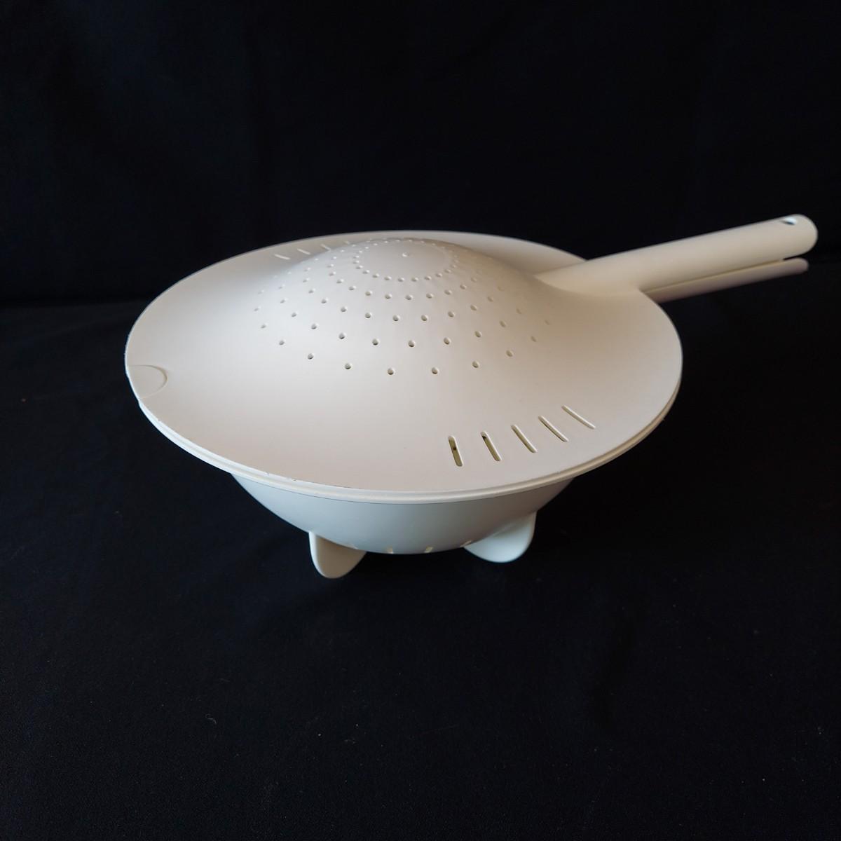 Bagel slicer, salad spinner, vegetable slicer, funnels, measuring cup, turnover press, simmer plate, basket with clay bread warmer, mandolin slicer, cheese grater, zip top bag holder, a recipe card holder and three types of strainers. The canning strainer is 12"H. Shipping available