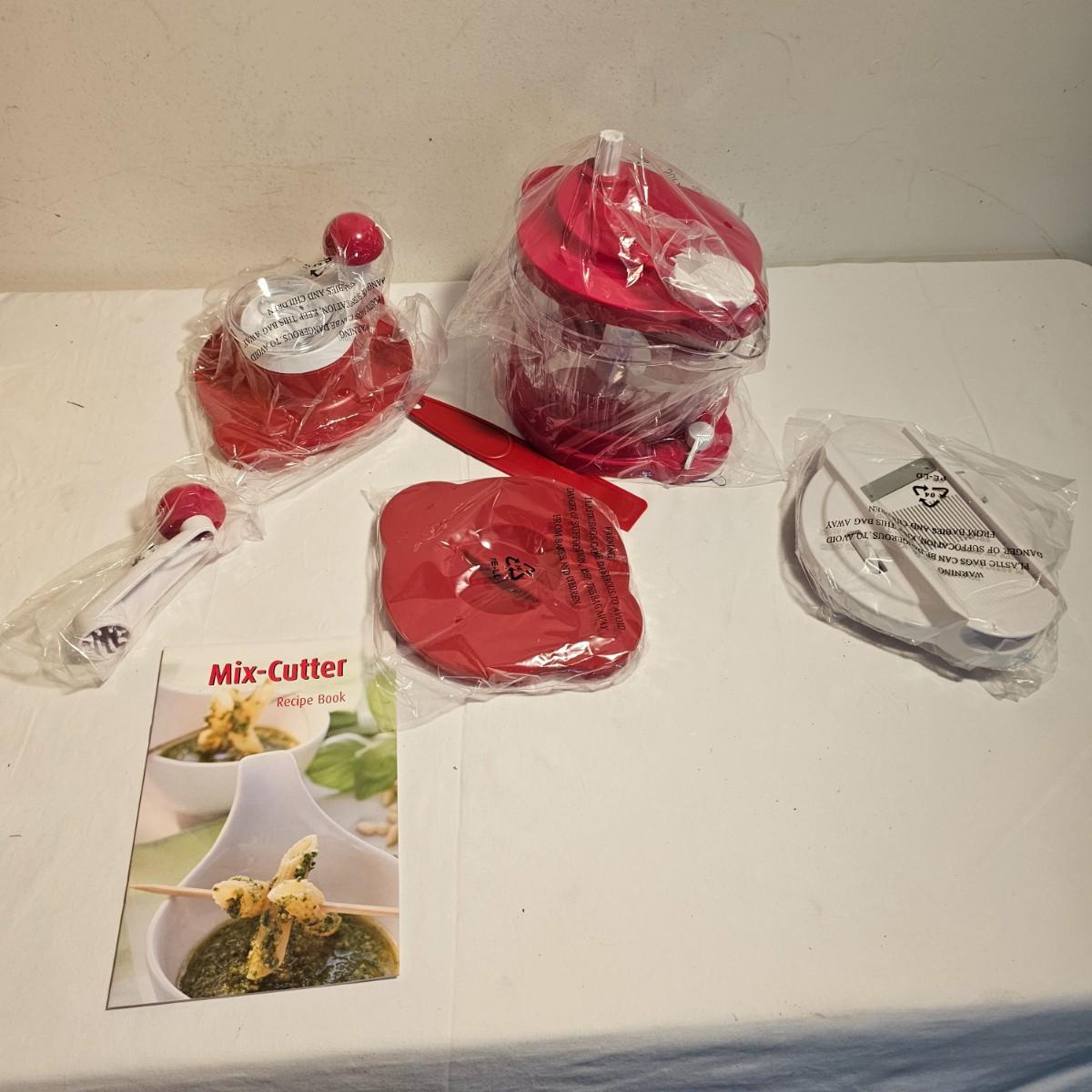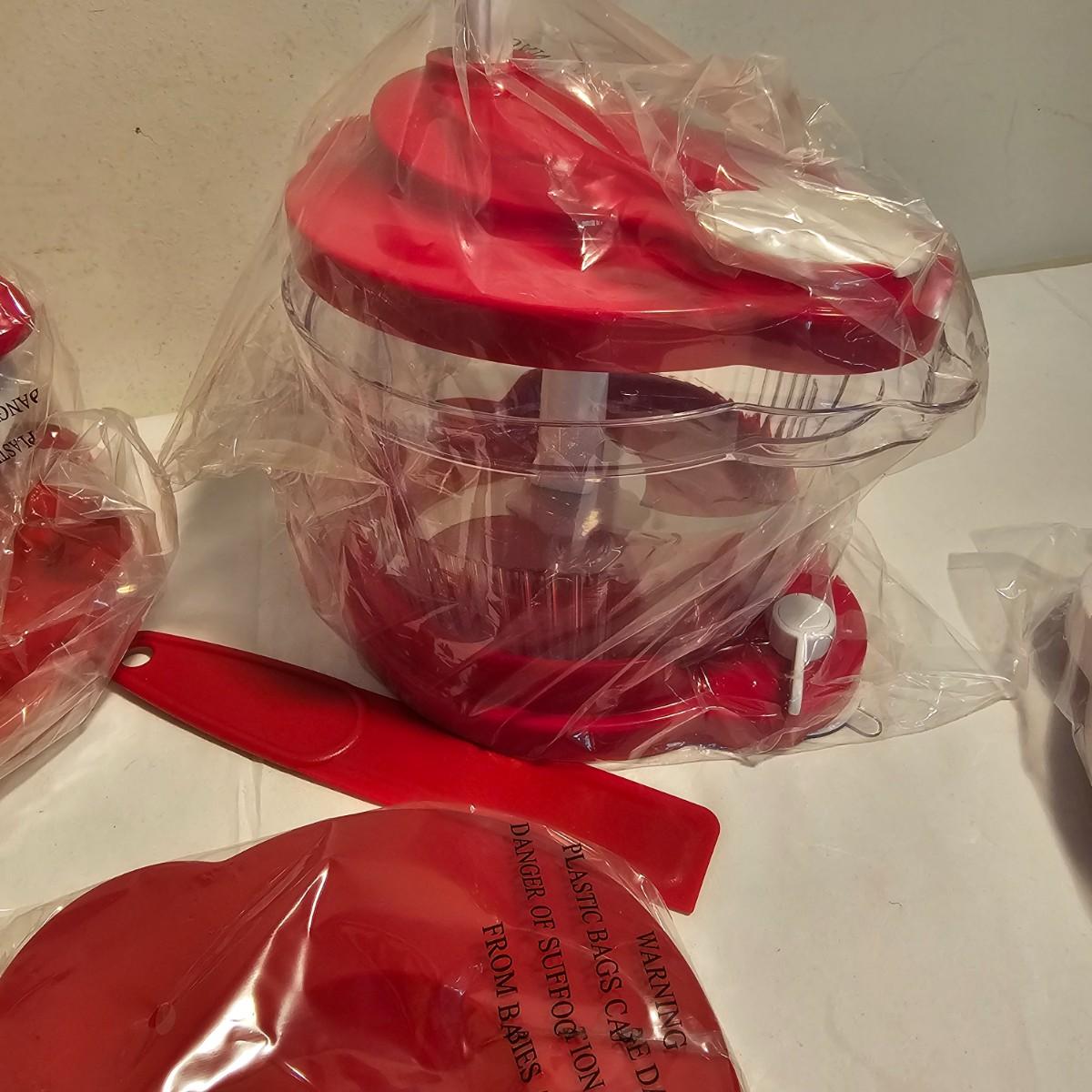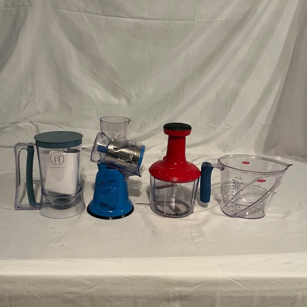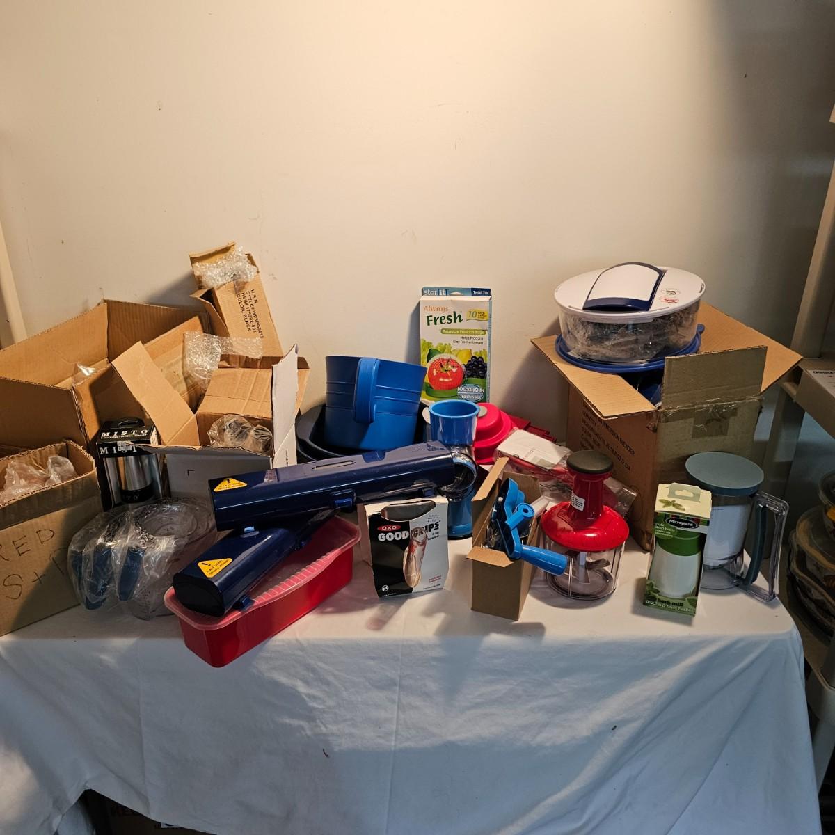 Lots and lots of kitchen helper pieces here, some electric powered, some hand powered. Salad choppers, grinders, hand immersion blender, measuring, graters, foil and plastic dispensers. Too many items to list all. All electric items powered on when plugged in. See photos for inventory and details. Local pickup only.