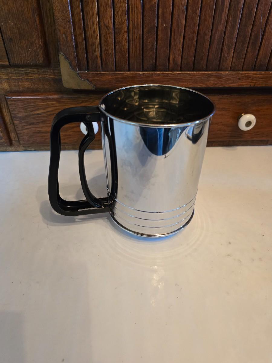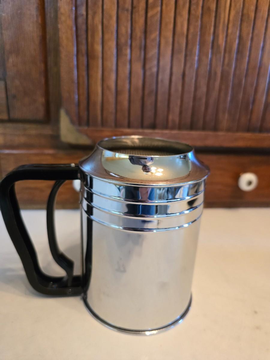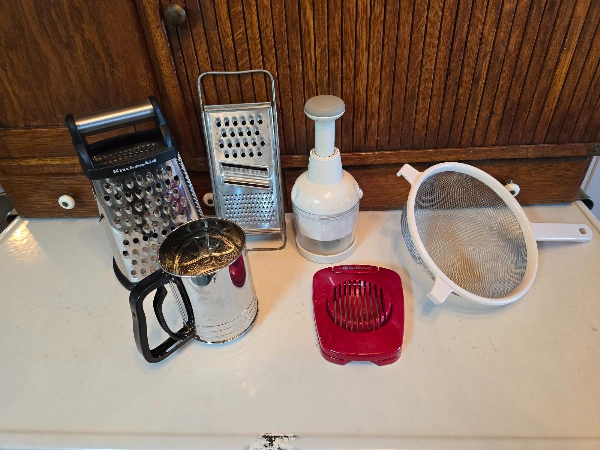 Kitchen gadgets - cutters, slicers and dicers with a strainer and a chrome flour sifter