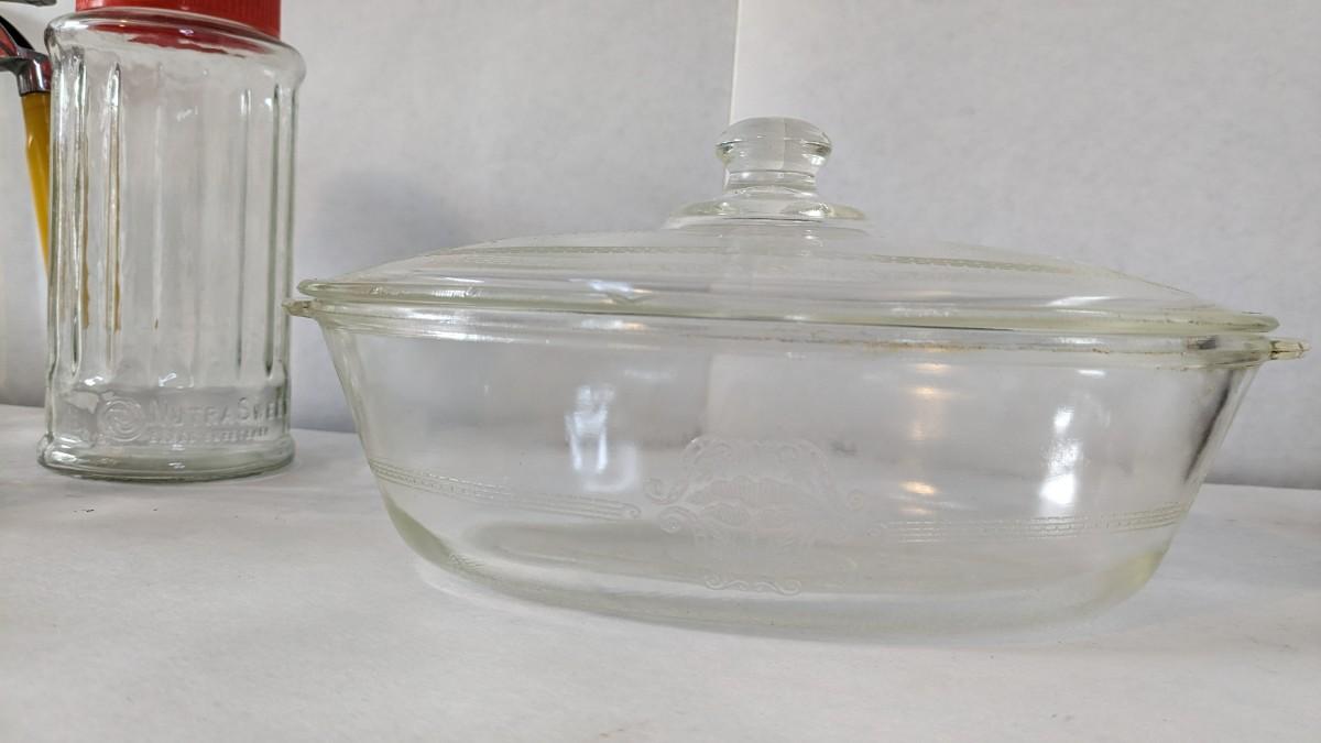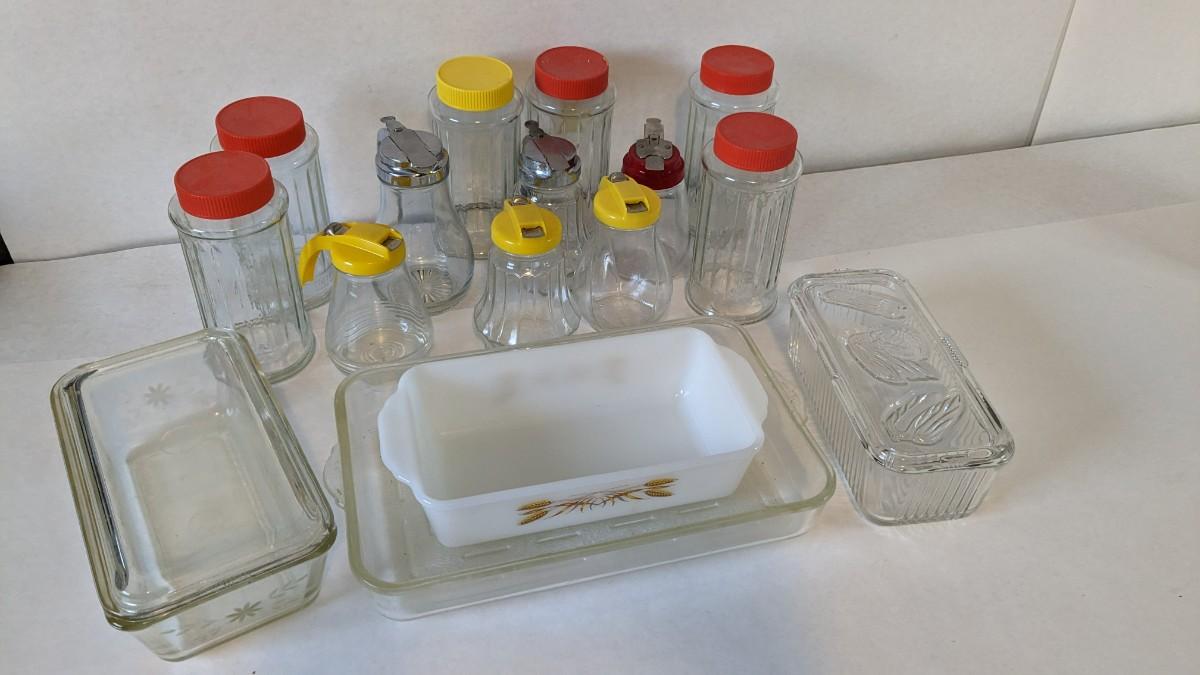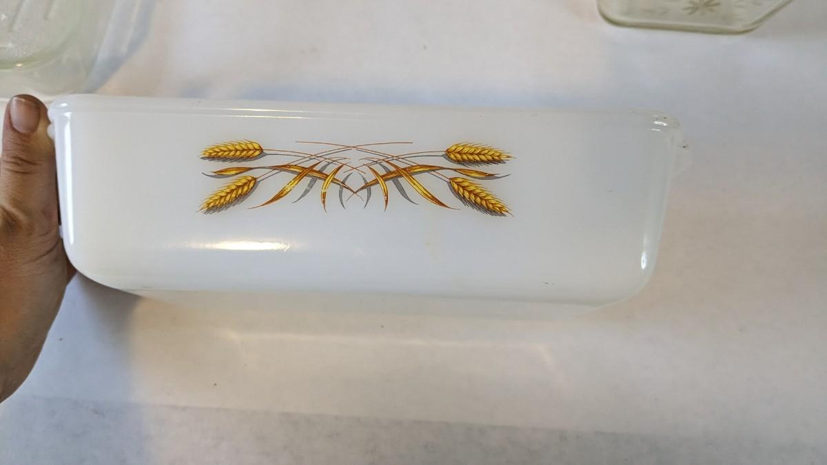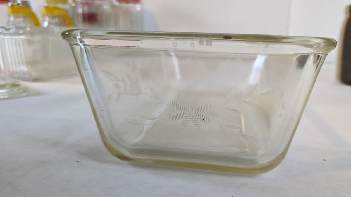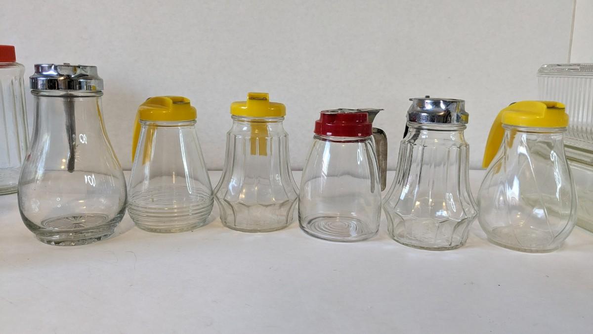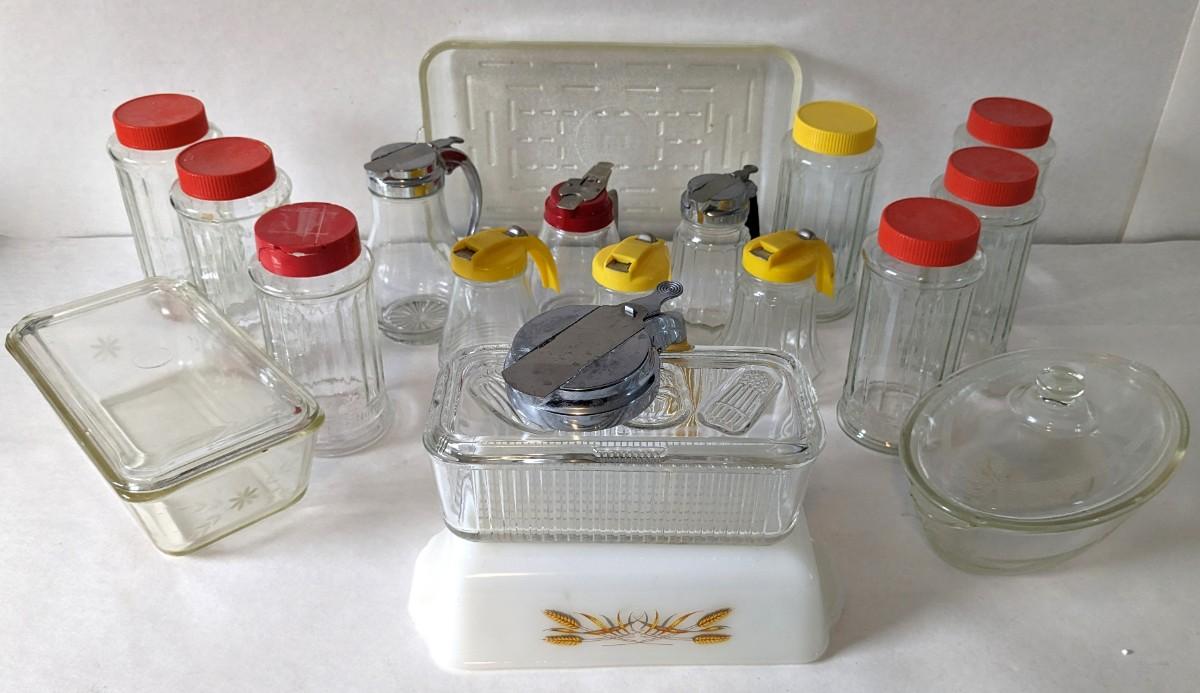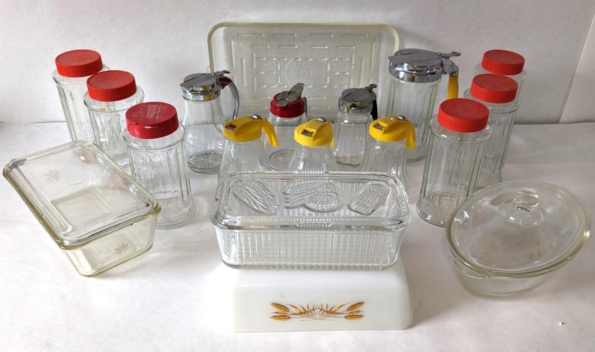 Includes very early etched Pyrex fridge dish with lid, two chips noted in lid and very slight discoloration as well as scuffs in accordance to age, Federal Glass covered fridge dish in immaculate condition, Fire King autumn wheat milk glass bread dish, Glas-Bake covered dish with etched sides, and Glas-Bake 12"x7.75" textured bottom casserole dish. Seven nutra-sweet jars and six varied base syrup pourers, plus a 3.25" syrup handle with no base. Some real classic cuties, don't miss out folks!