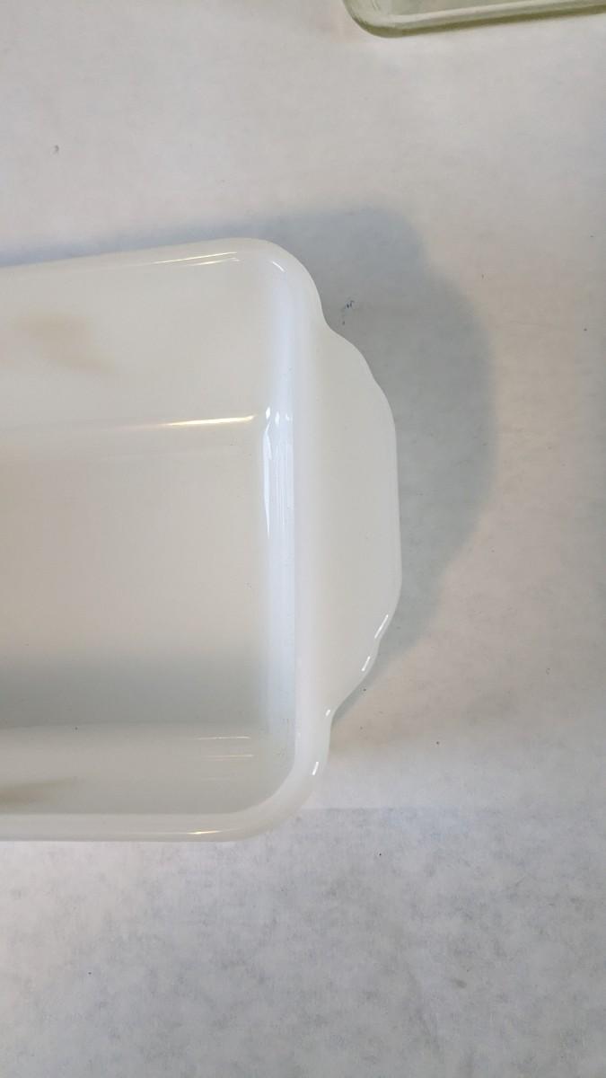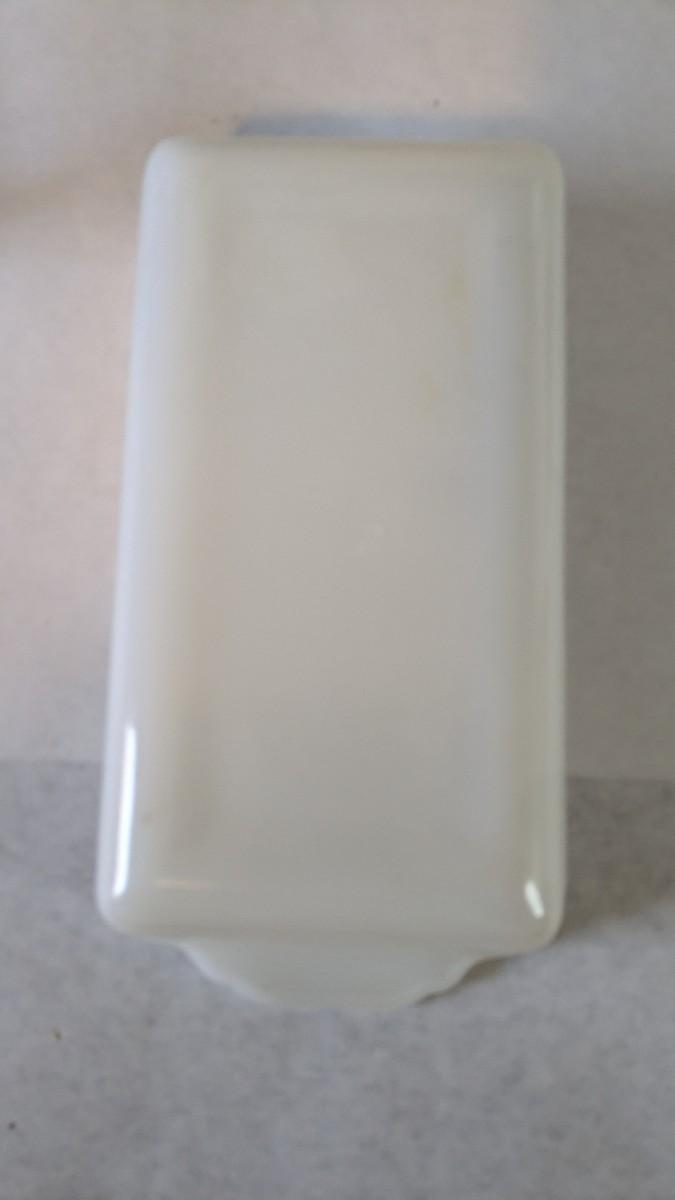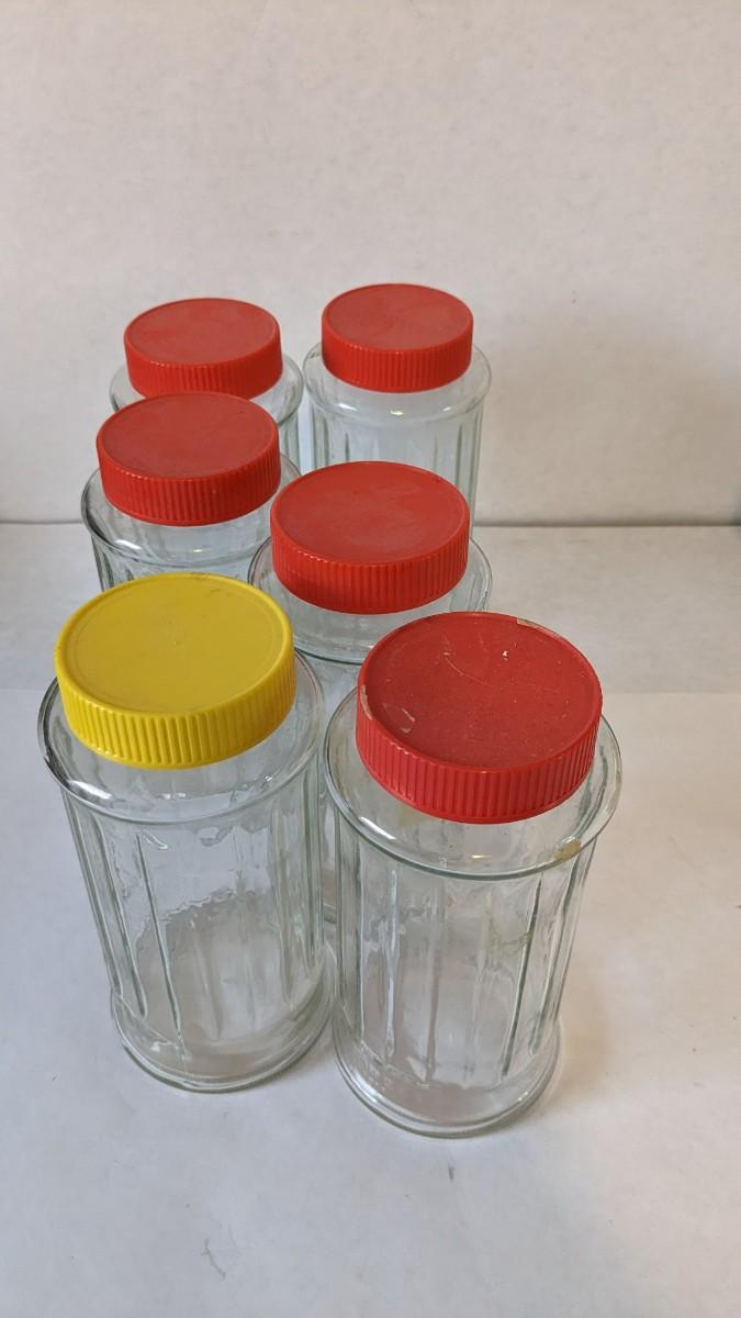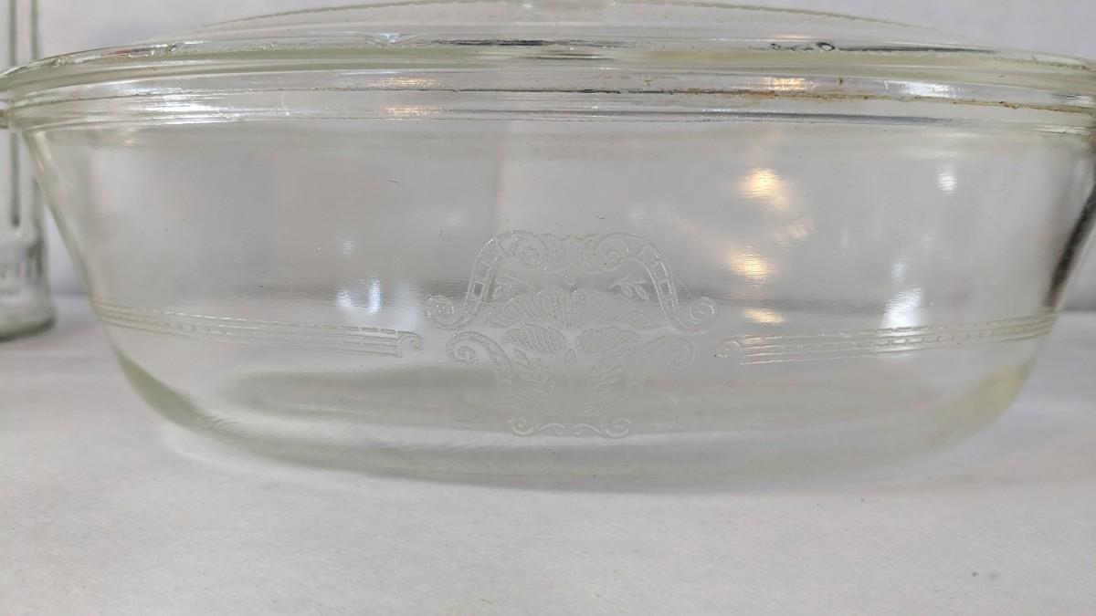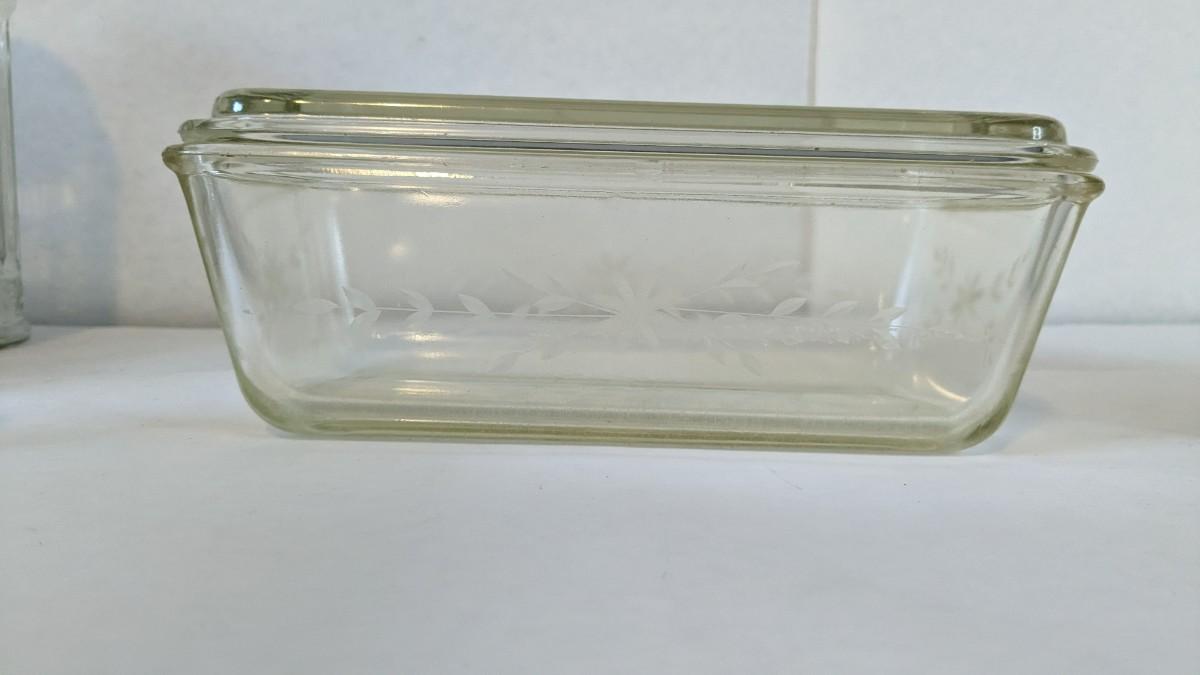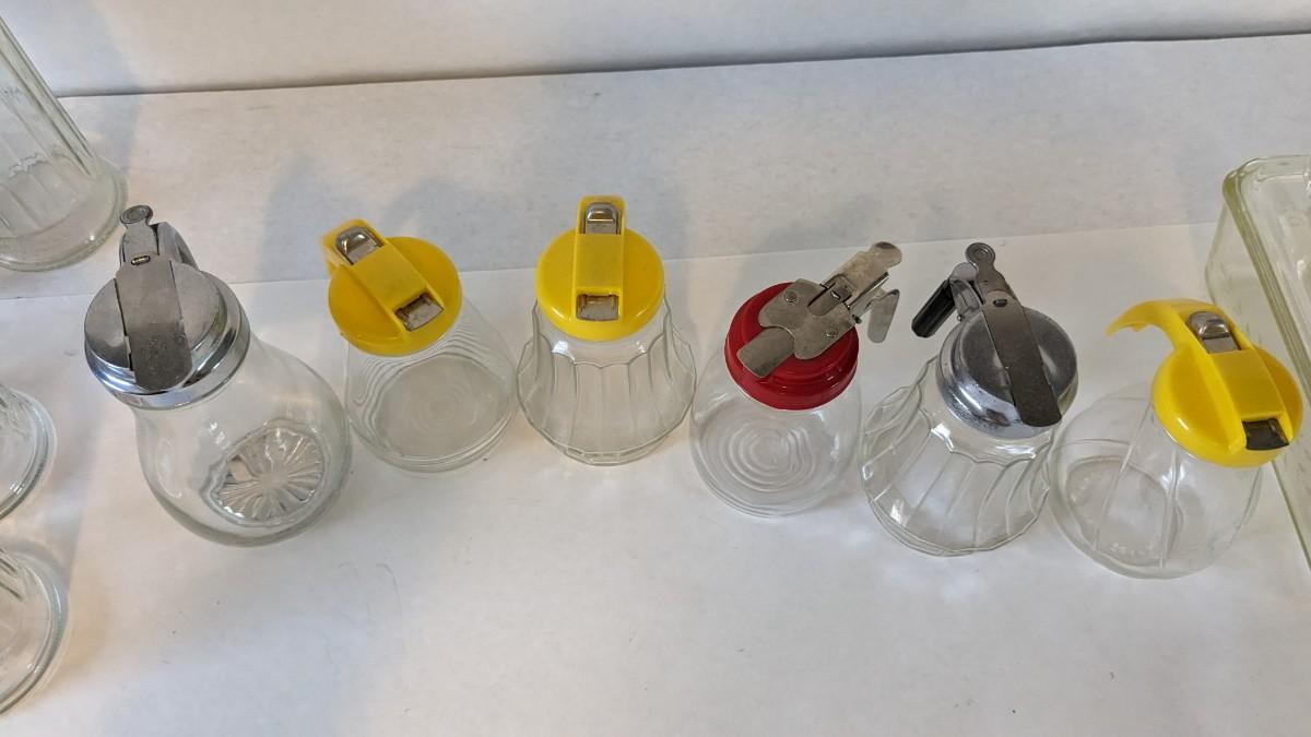 Includes very early etched Pyrex fridge dish with lid, two chips noted in lid and very slight discoloration as well as scuffs in accordance to age, Federal Glass covered fridge dish in immaculate condition, Fire King autumn wheat milk glass bread dish, Glas-Bake covered dish with etched sides, and Glas-Bake 12"x7.75" textured bottom casserole dish. Seven nutra-sweet jars and six varied base syrup pourers, plus a 3.25" syrup handle with no base. Some real classic cuties, don't miss out folks!