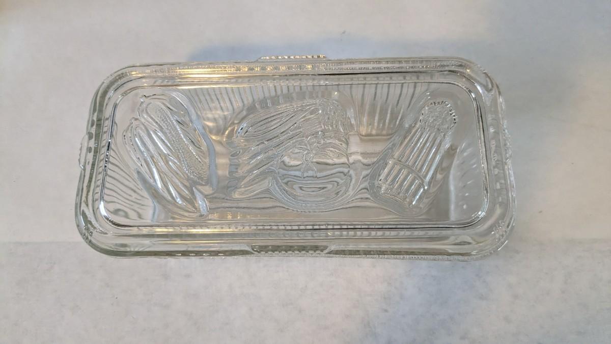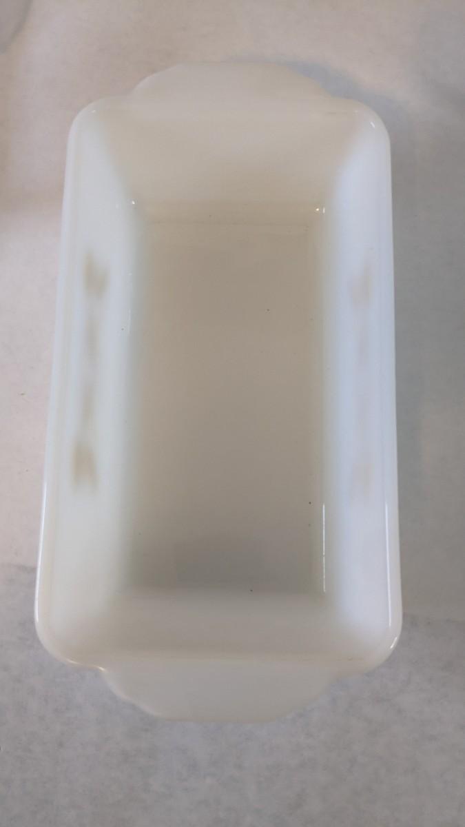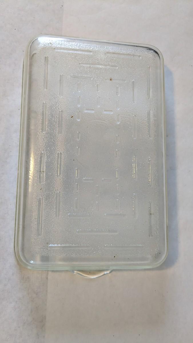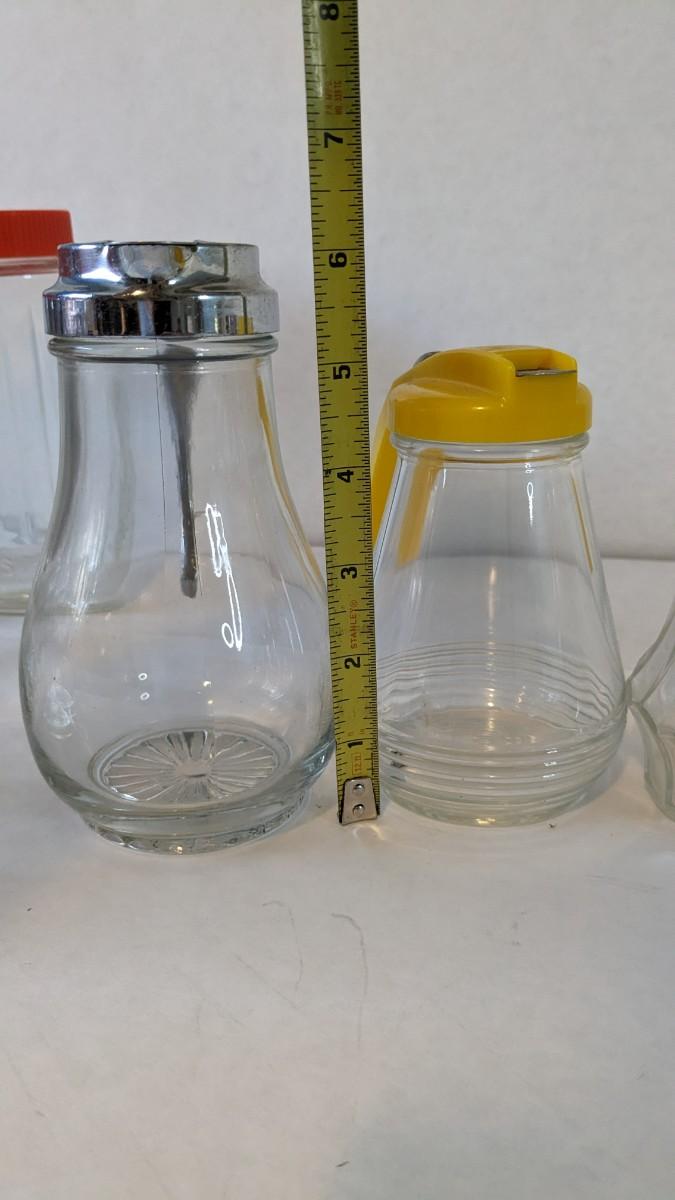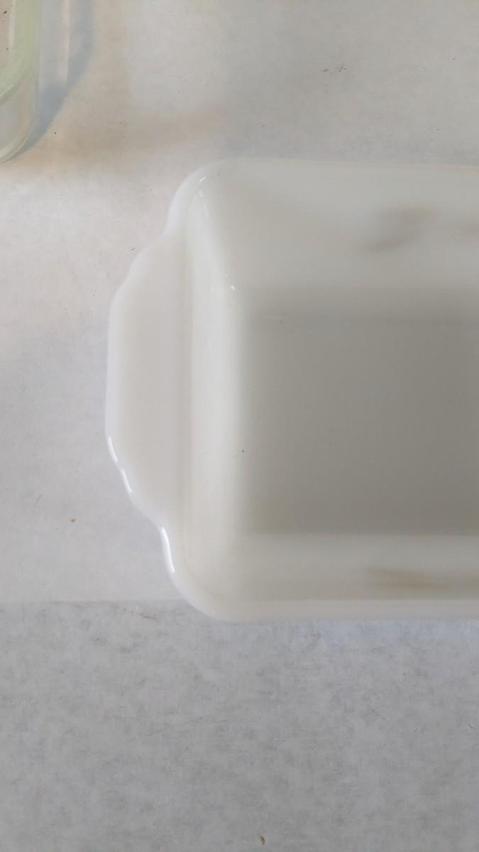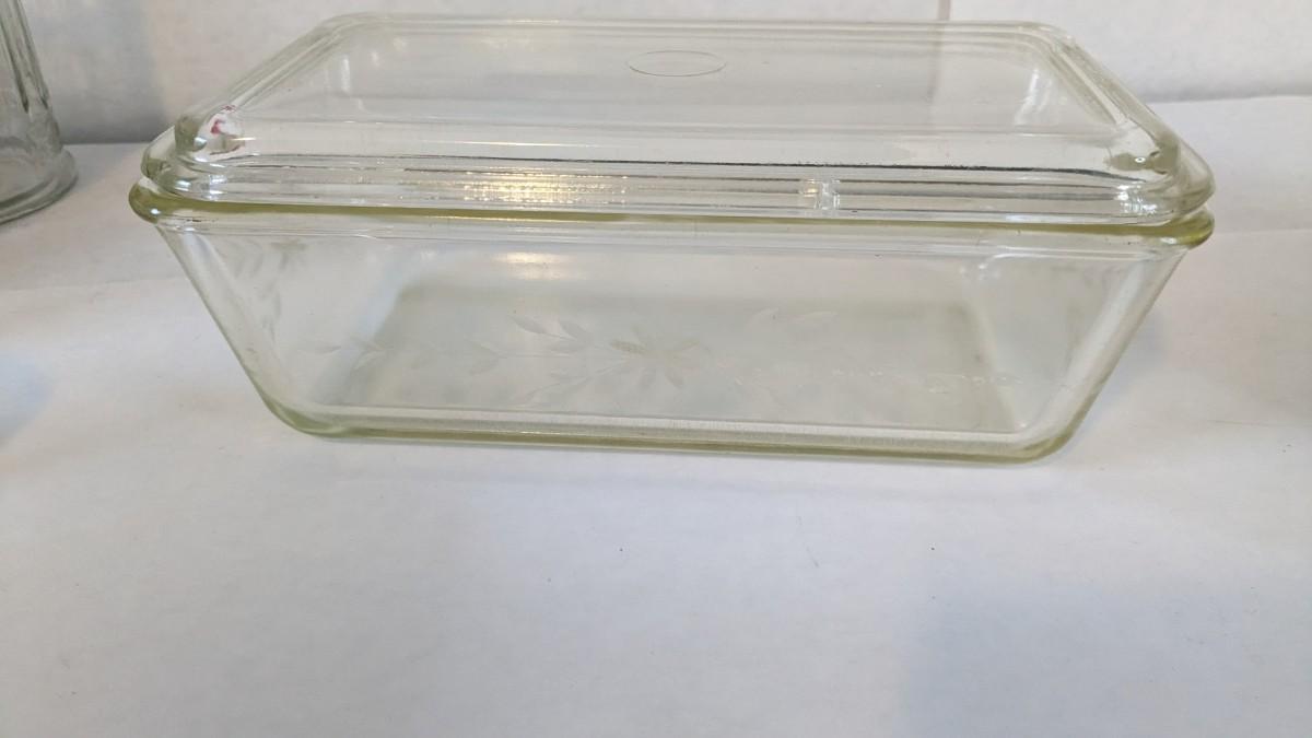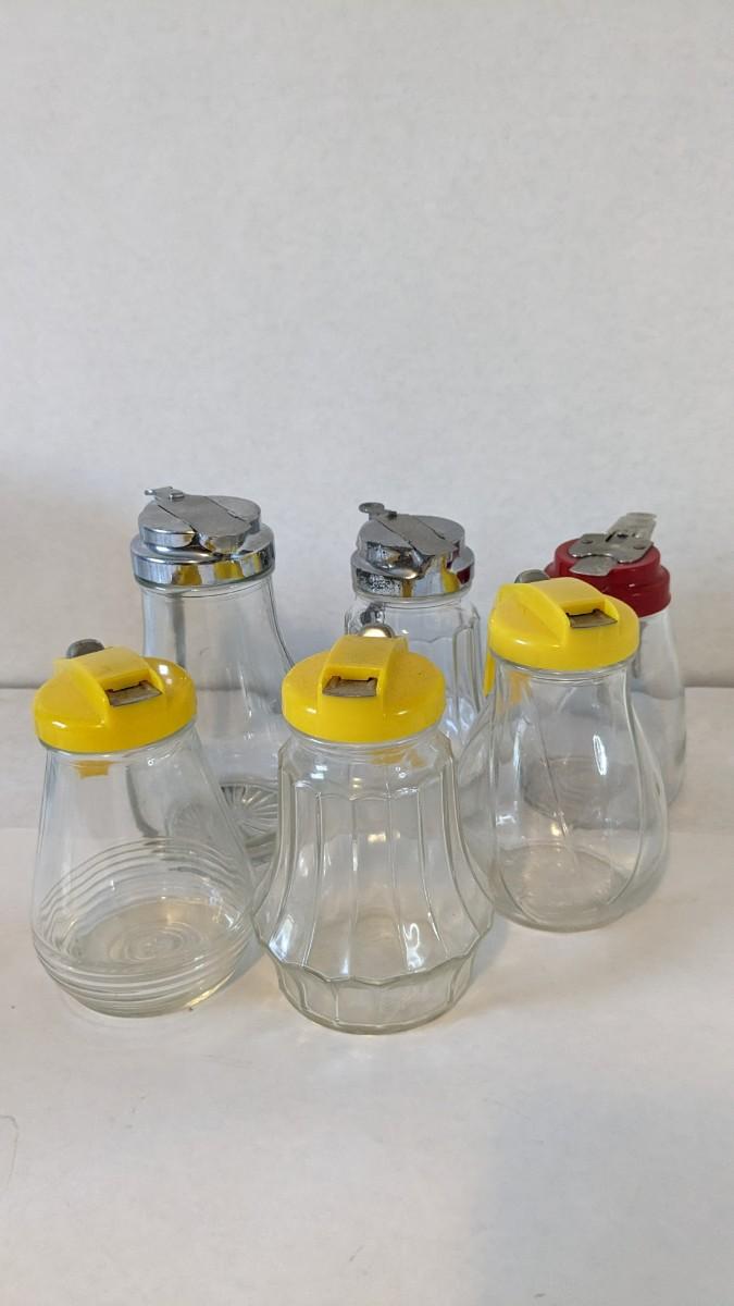 Includes very early etched Pyrex fridge dish with lid, two chips noted in lid and very slight discoloration as well as scuffs in accordance to age, Federal Glass covered fridge dish in immaculate condition, Fire King autumn wheat milk glass bread dish, Glas-Bake covered dish with etched sides, and Glas-Bake 12"x7.75" textured bottom casserole dish. Seven nutra-sweet jars and six varied base syrup pourers, plus a 3.25" syrup handle with no base. Some real classic cuties, don't miss out folks!