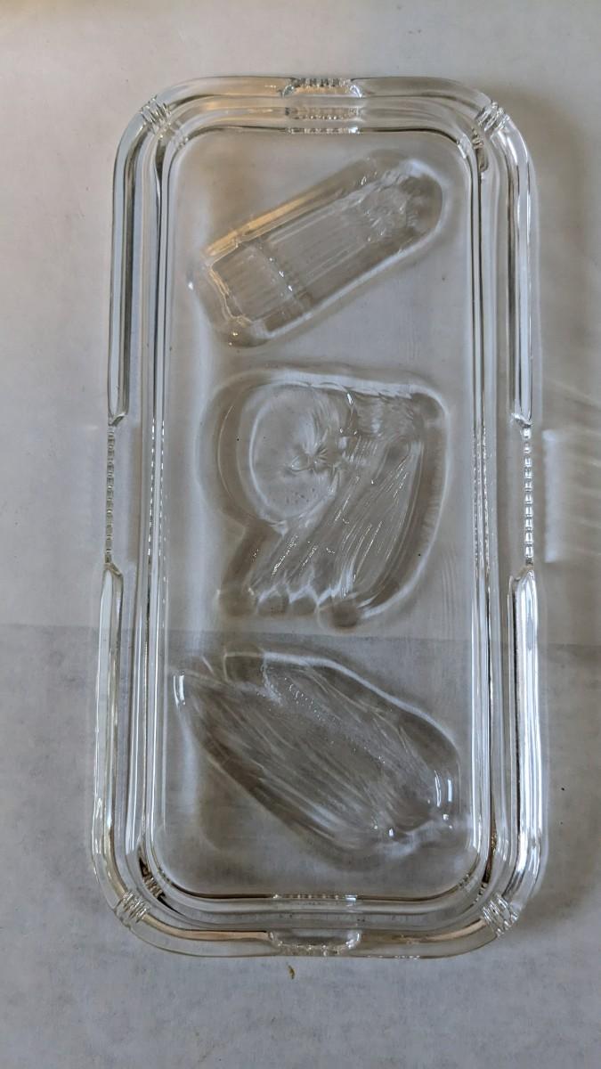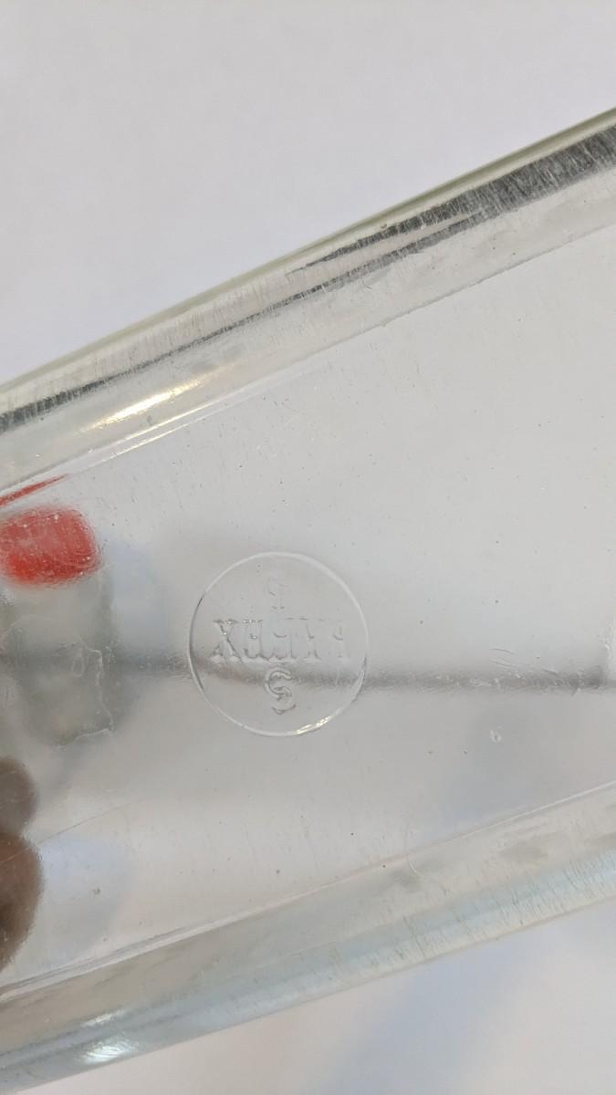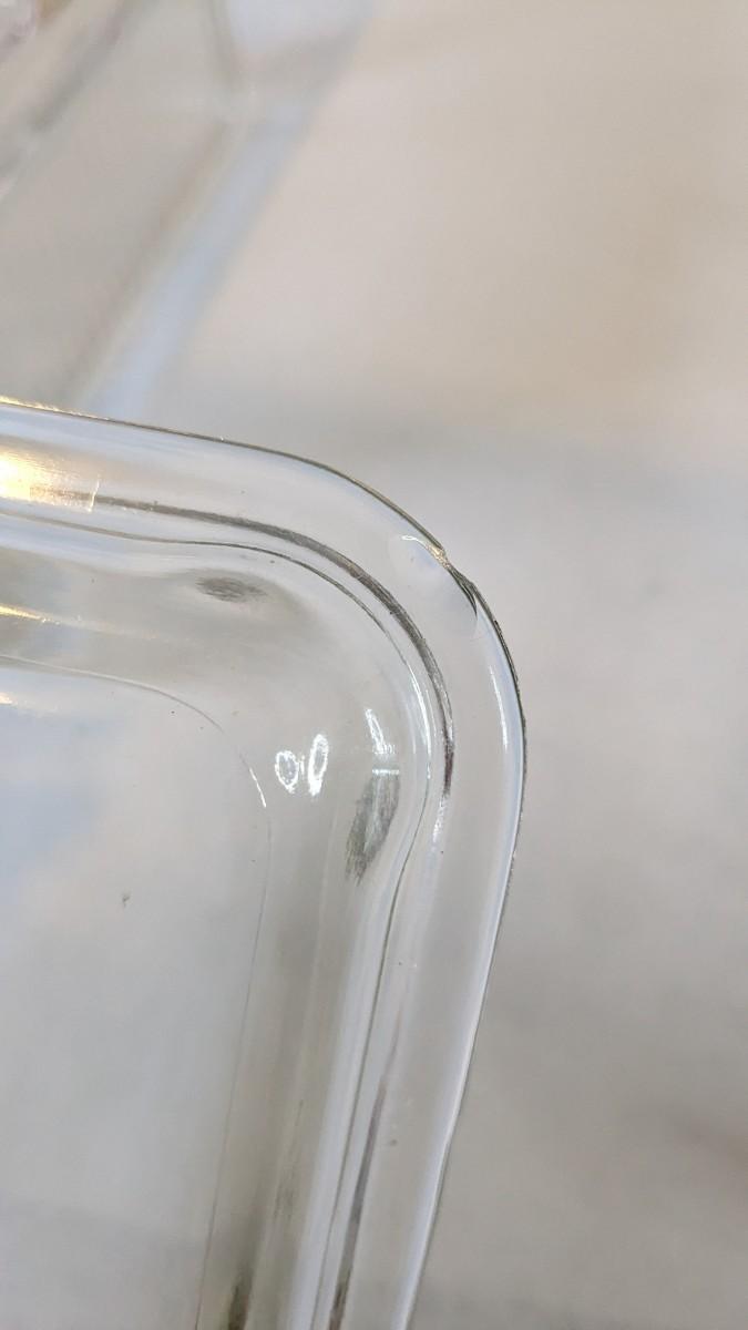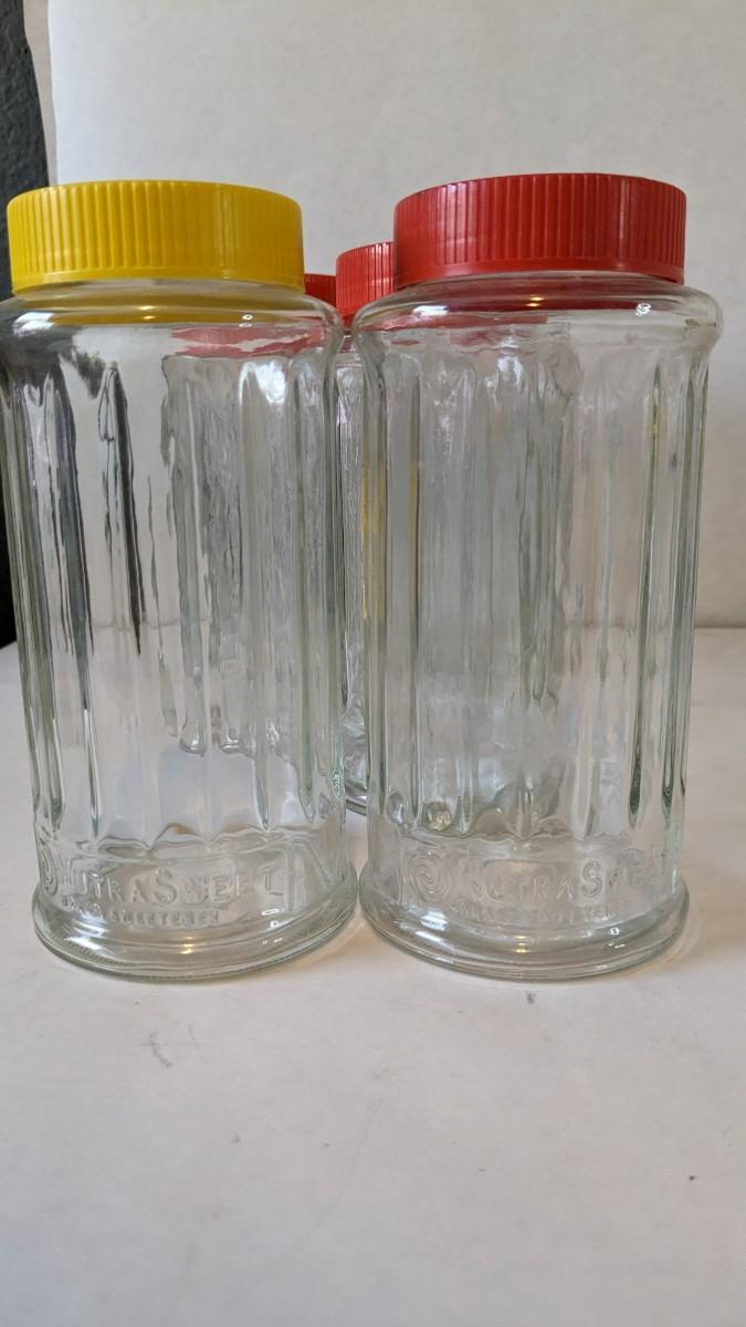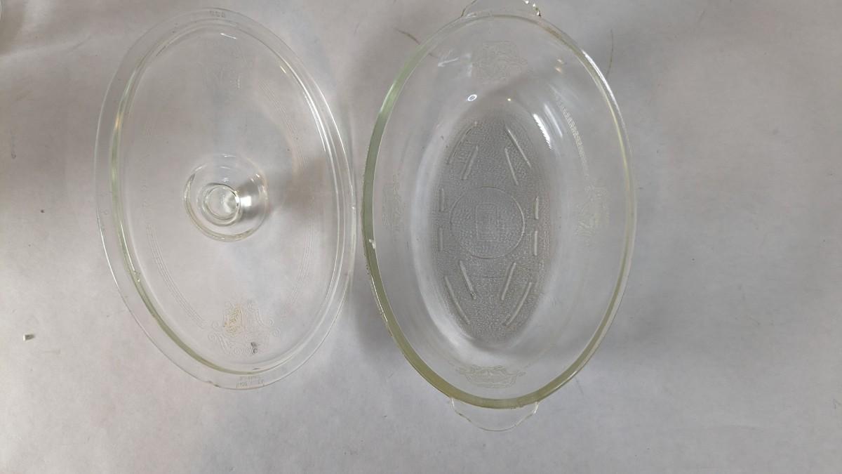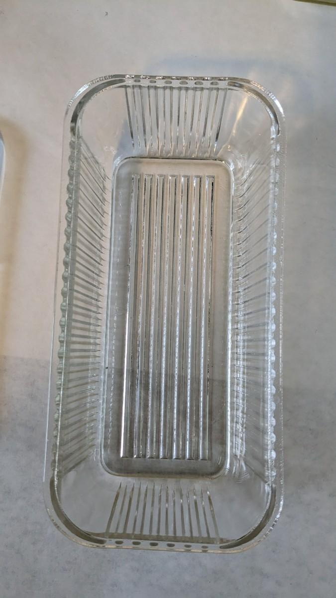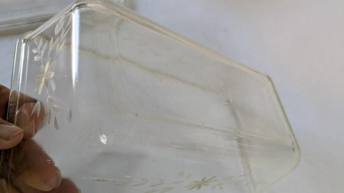 Includes very early etched Pyrex fridge dish with lid, two chips noted in lid and very slight discoloration as well as scuffs in accordance to age, Federal Glass covered fridge dish in immaculate condition, Fire King autumn wheat milk glass bread dish, Glas-Bake covered dish with etched sides, and Glas-Bake 12"x7.75" textured bottom casserole dish. Seven nutra-sweet jars and six varied base syrup pourers, plus a 3.25" syrup handle with no base. Some real classic cuties, don't miss out folks!