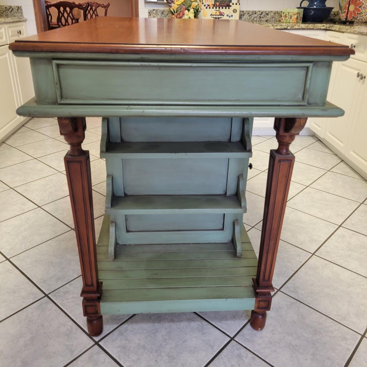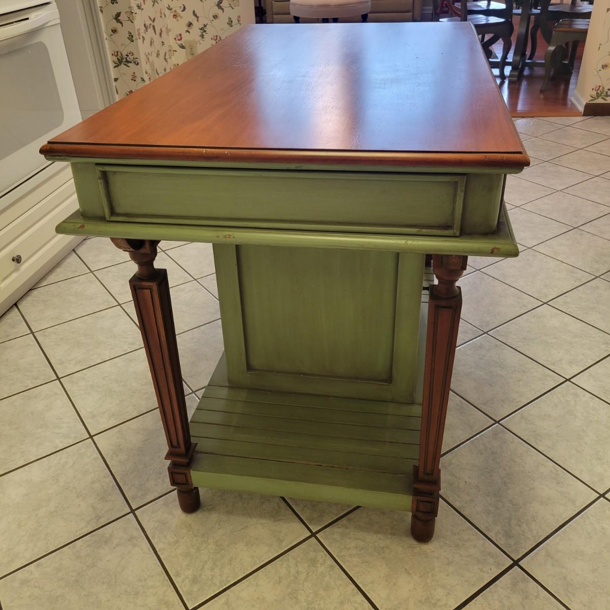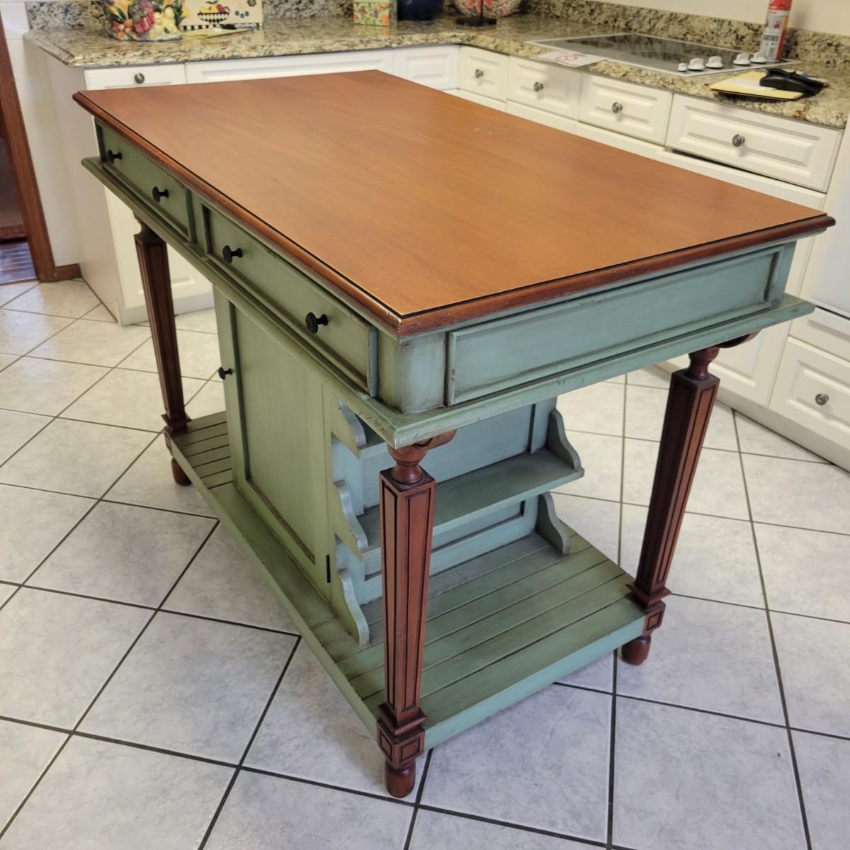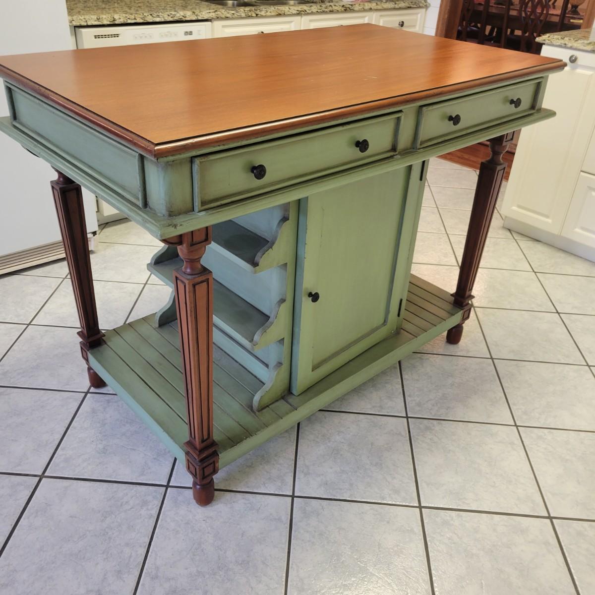 A unique, solid wood kitchen island that features four drawers and two cabinet spaces. It has a light green finish with medium walnut surface and legs. It measures approximately 51" x 29.5" x 37.5"H. There are some minor scratches in the surface that are associated with use. Local pickup only. Winning bidder must bring assistance to help move and load this item due to its weight and/or size.