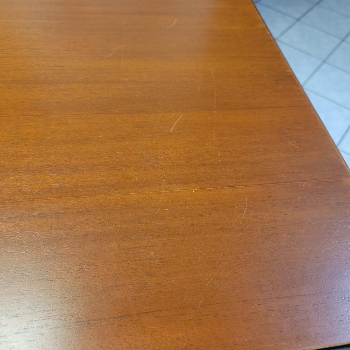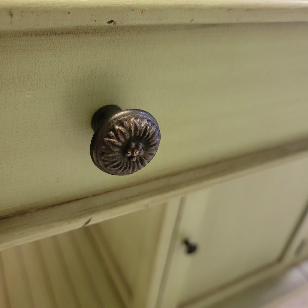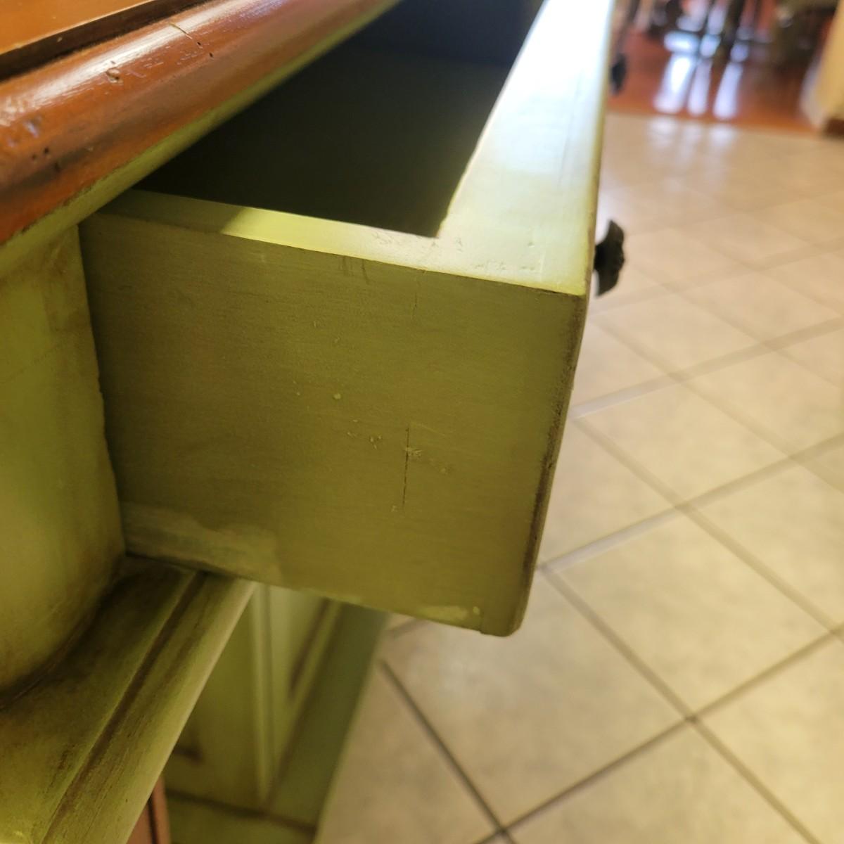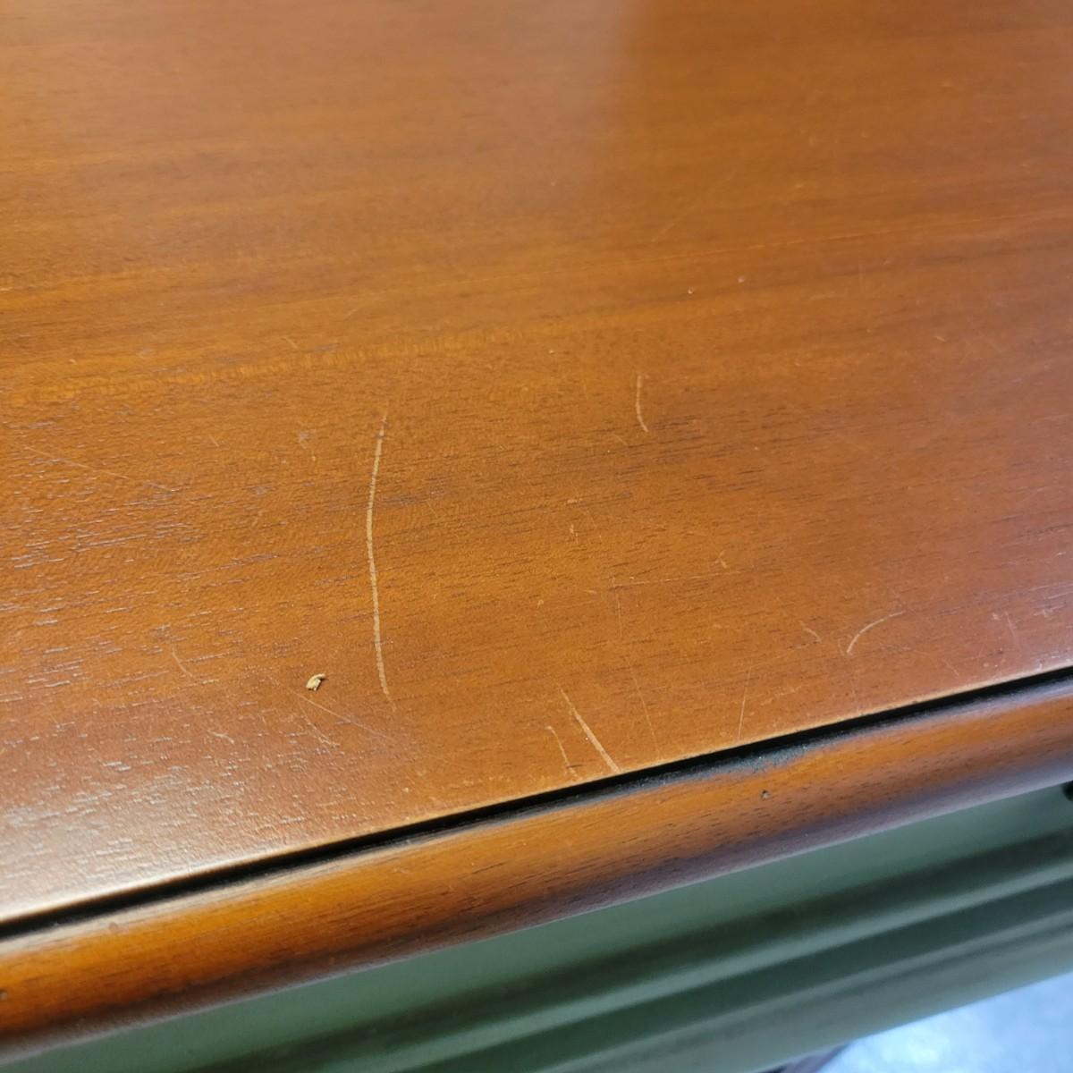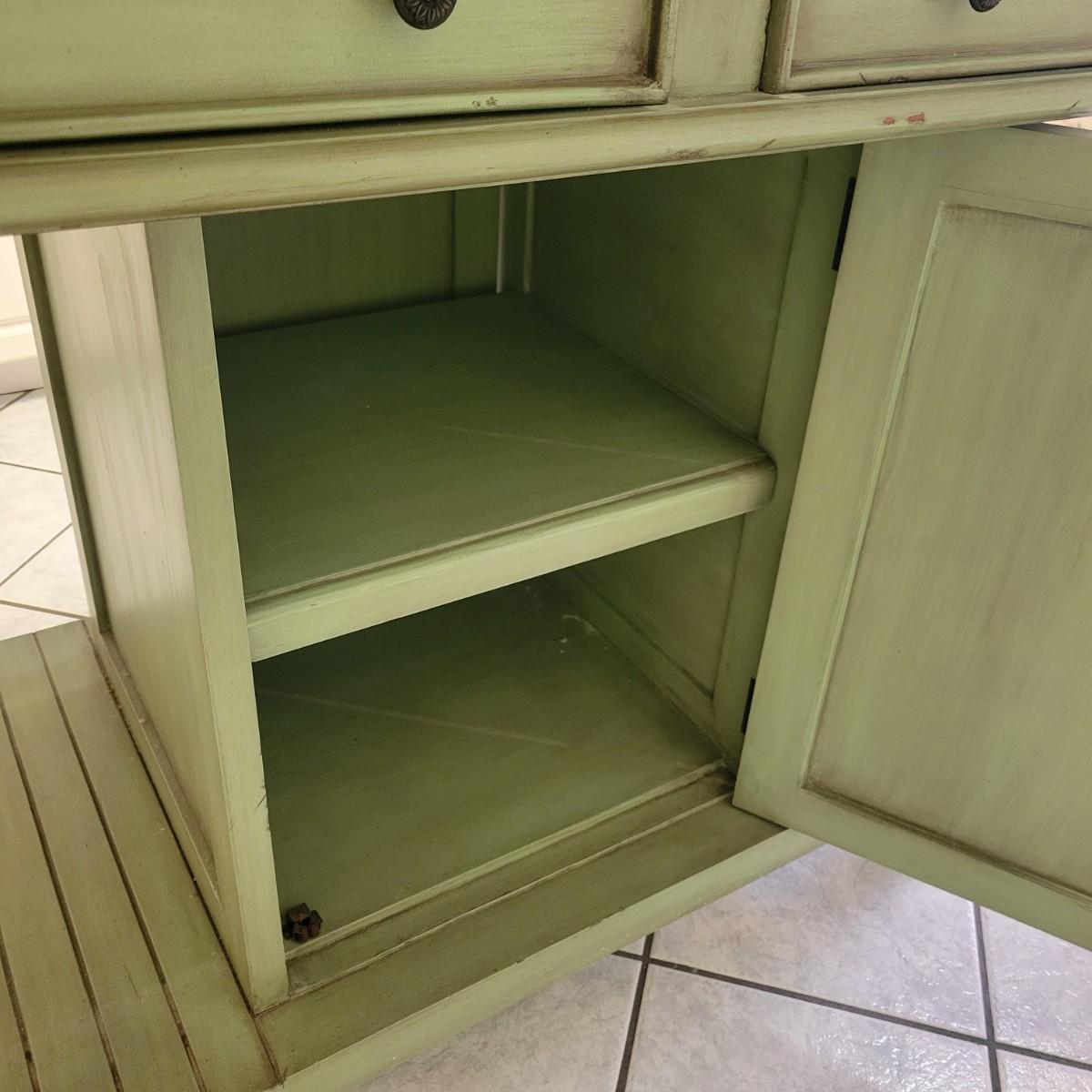 A unique, solid wood kitchen island that features four drawers and two cabinet spaces. It has a light green finish with medium walnut surface and legs. It measures approximately 51" x 29.5" x 37.5"H. There are some minor scratches in the surface that are associated with use. Local pickup only. Winning bidder must bring assistance to help move and load this item due to its weight and/or size.