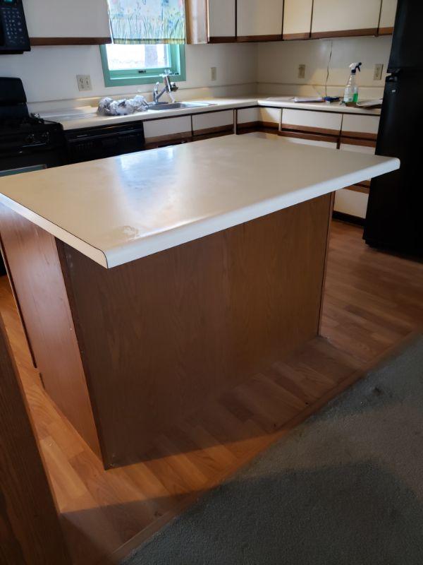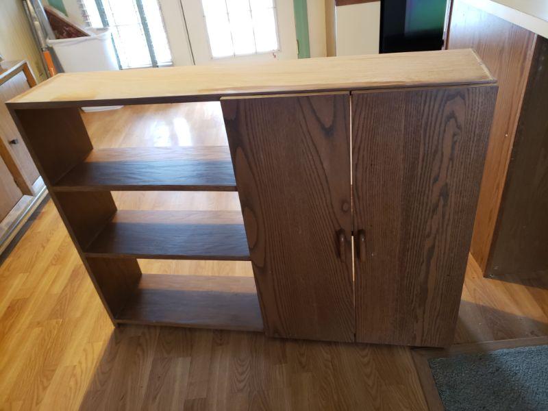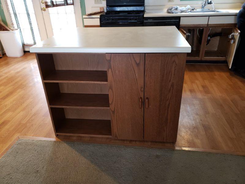 Kitchen Island Storage with Bar Stool Space #1. Great space saver. Comes with removable face to allow for a dinette section with room for two bar stools. Or keep as is with shelves for pantry items and spices. Plenty of room for pots, pans and cutlery. Dimensions 48.5"w x 36"d x 36"h. Lot #0041