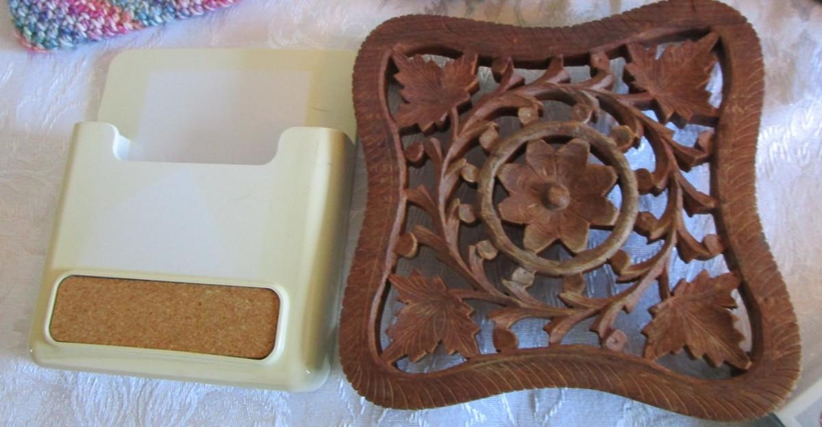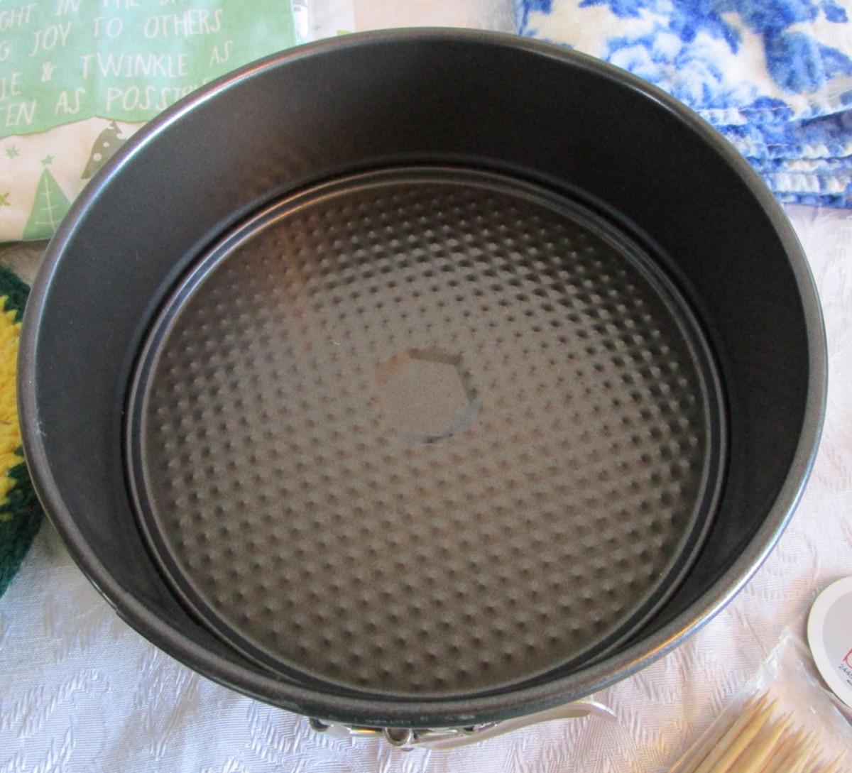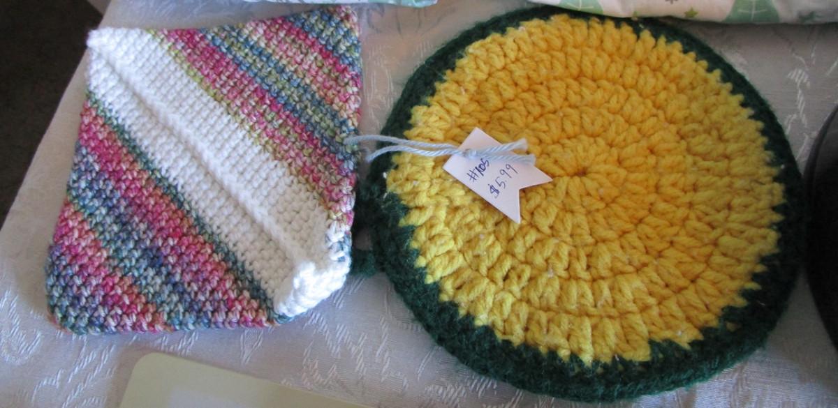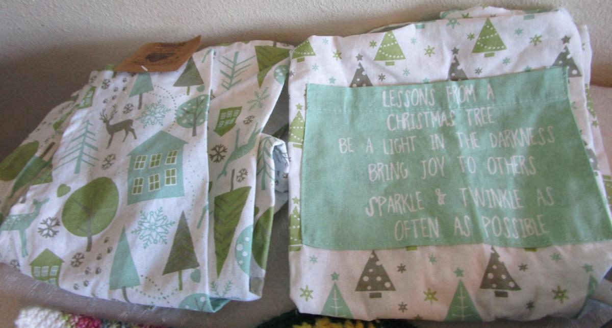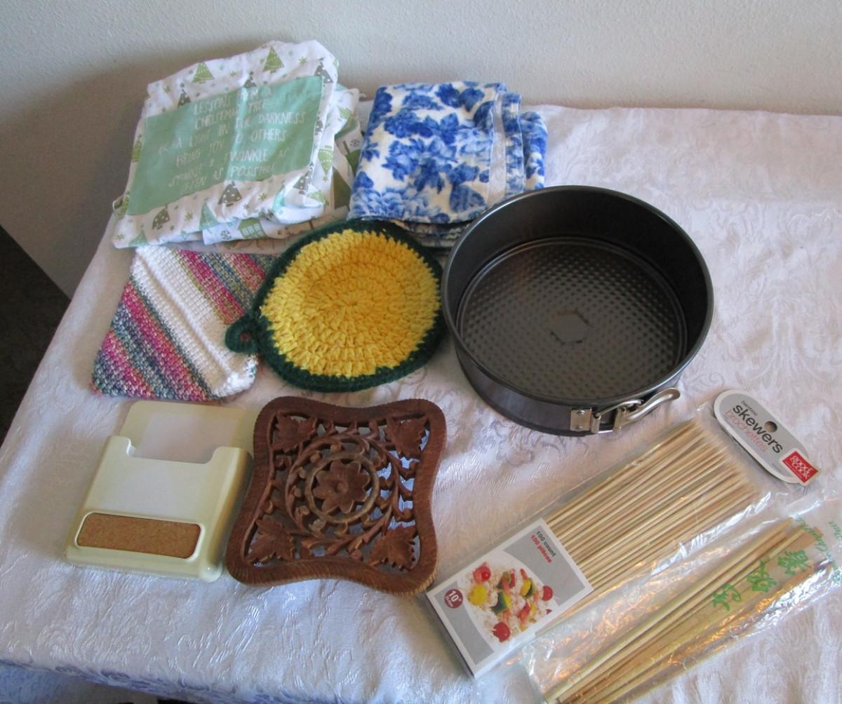 2 Christmas aprons, 1 springform cake pan 8-1/2 diameter x 2-3/4 tall, 1 kitchen towel, 2 hot pads, 1 trivet, 1 new pkg of skewers, see pictures