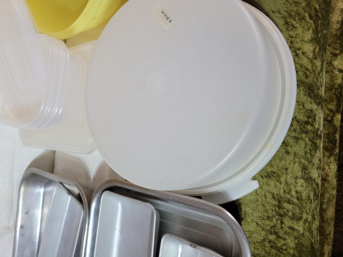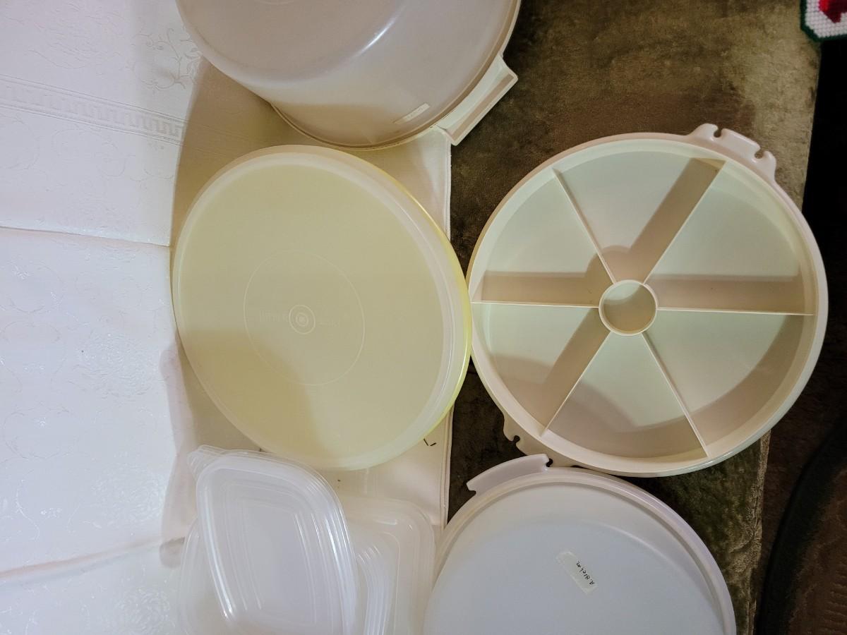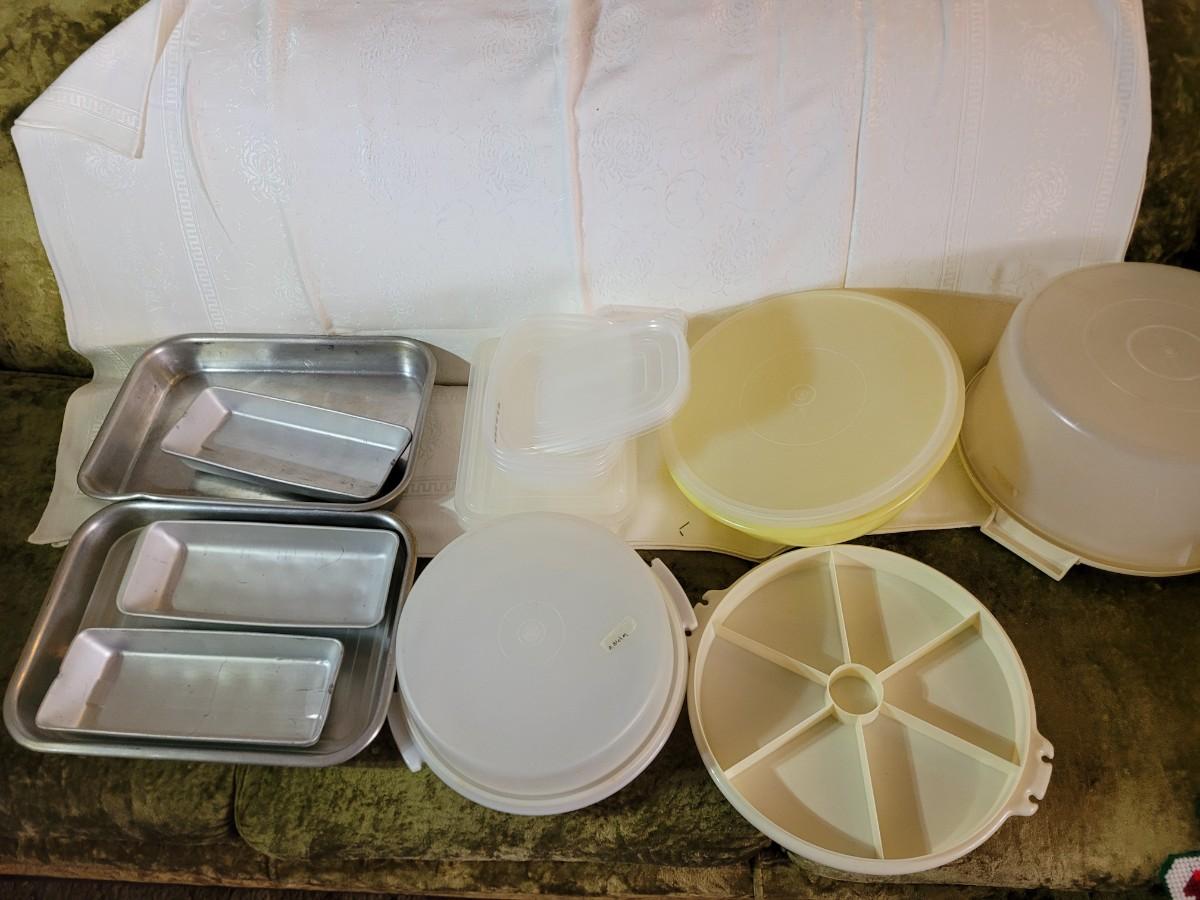 Tupperware Cake cover, relish tray, large bowl same lid fits both. Old ice trays, cake pans