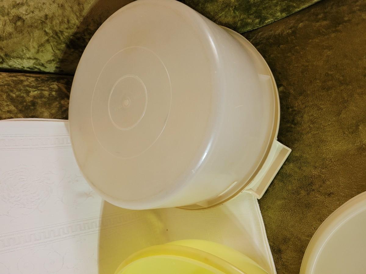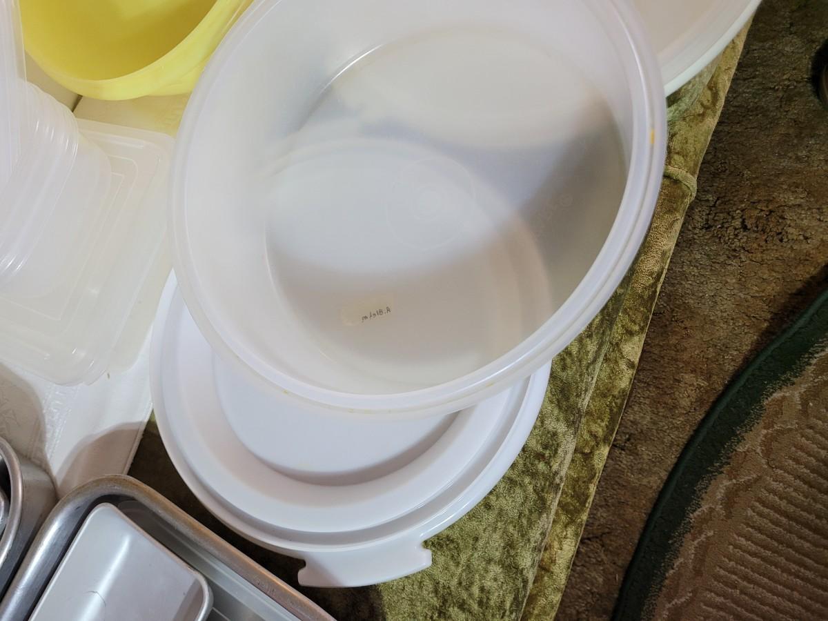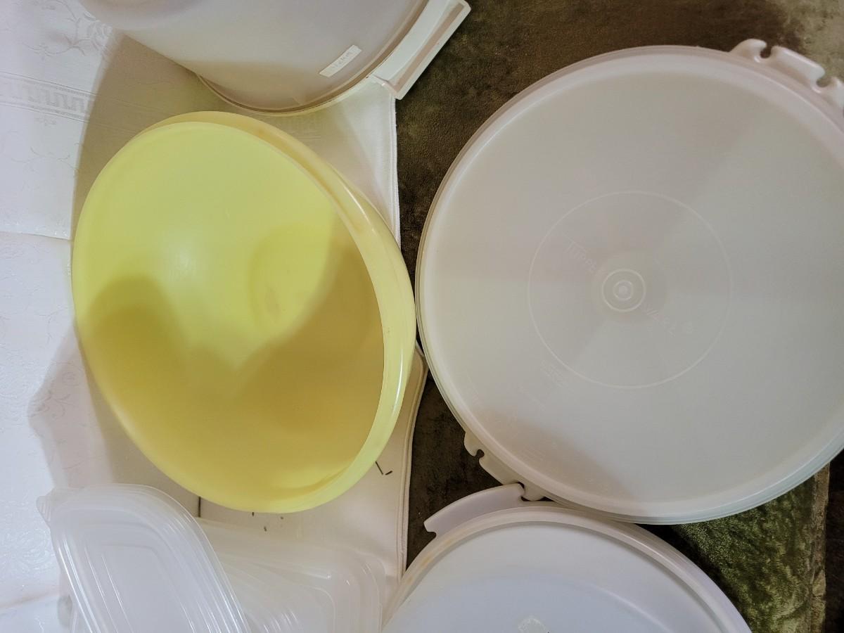 Tupperware Cake cover, relish tray, large bowl same lid fits both. Old ice trays, cake pans