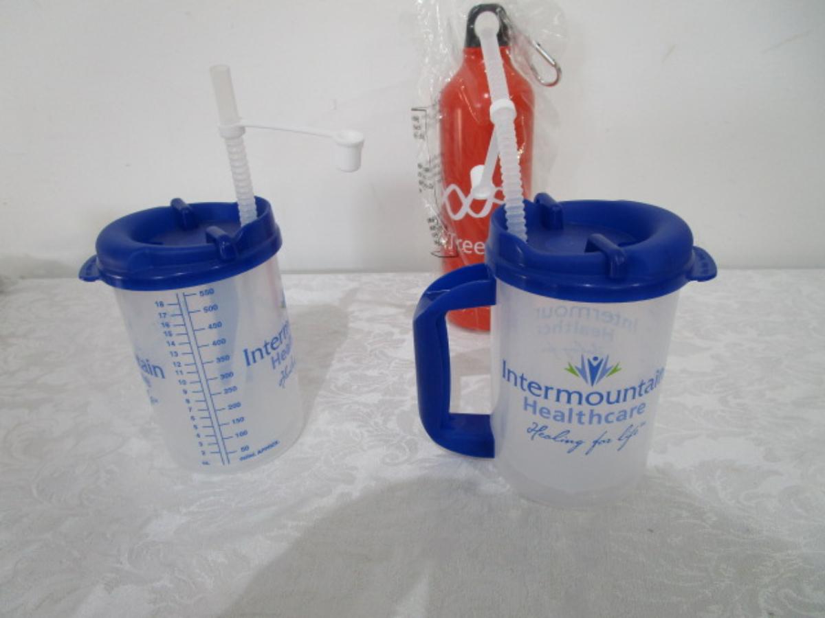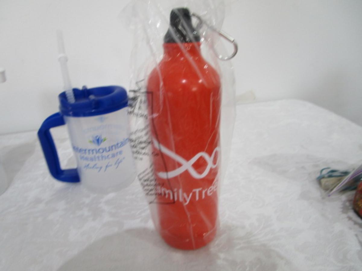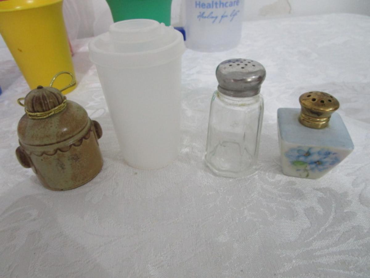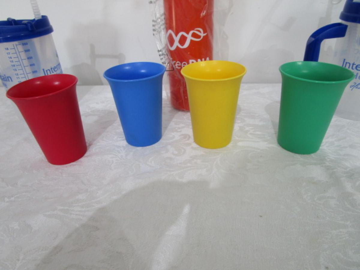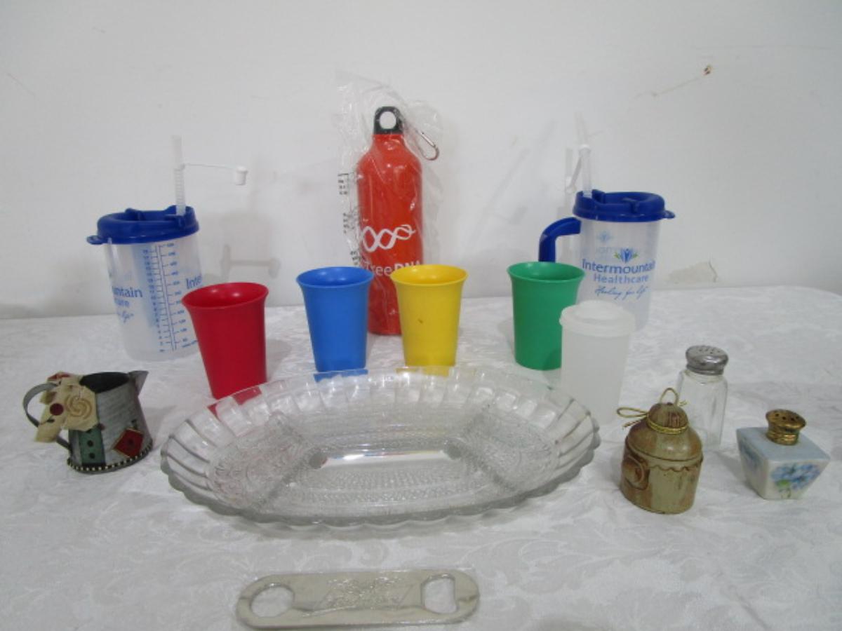 4 6-oz Tupperware cups, 2 mugs with straws, 4 salt & pepper shakers, new insulated water bottle, relish tray, new bottle opener