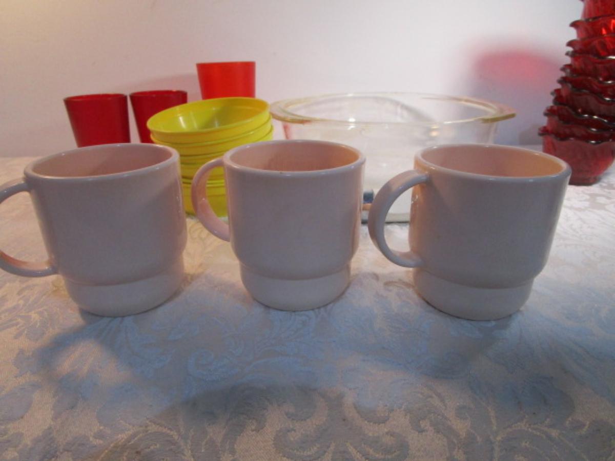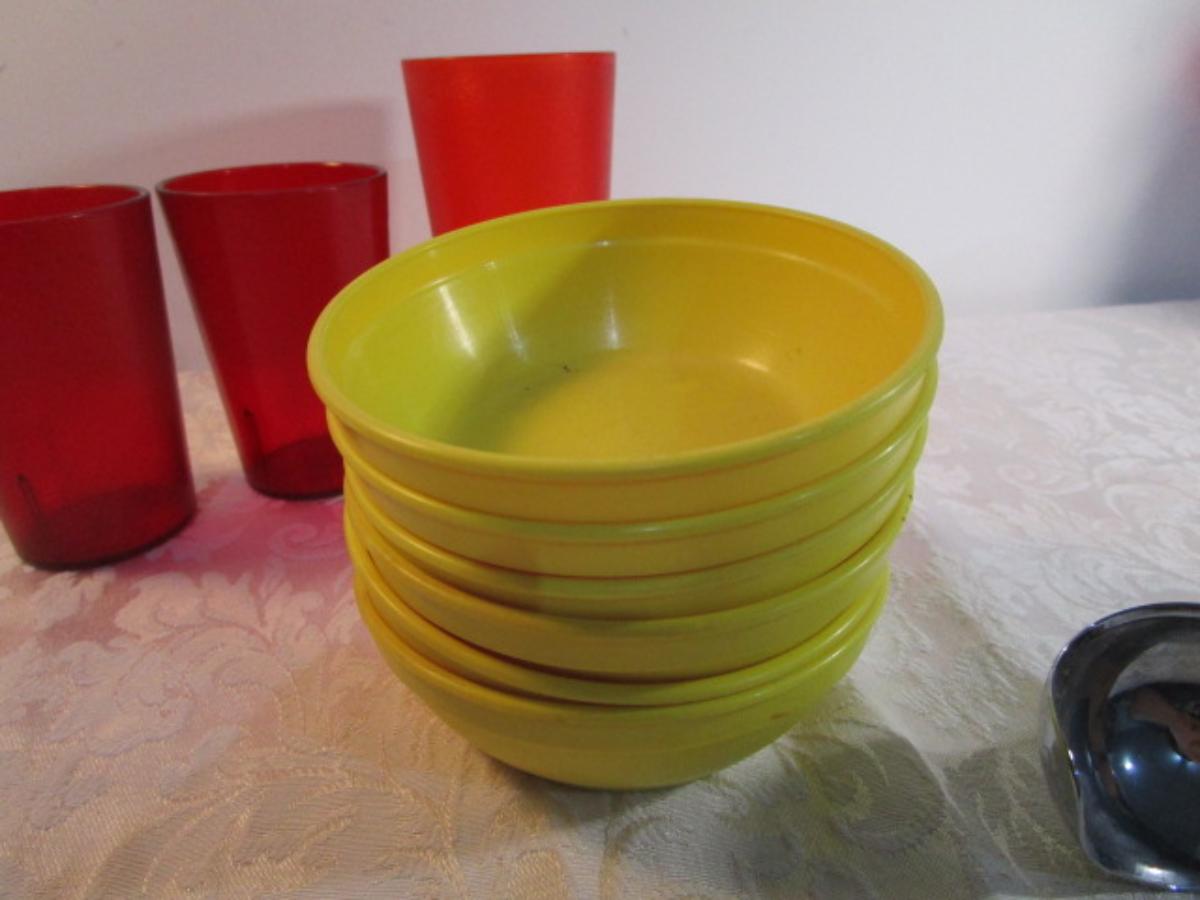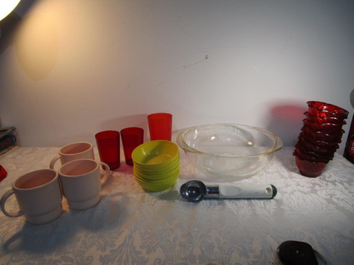 1 Pyrex 3 qt.bowl, 6 mini bowls, 9 red sundae dishes, 3 cups, 3 tumblers, 1 ice cream scoop, see pictures
